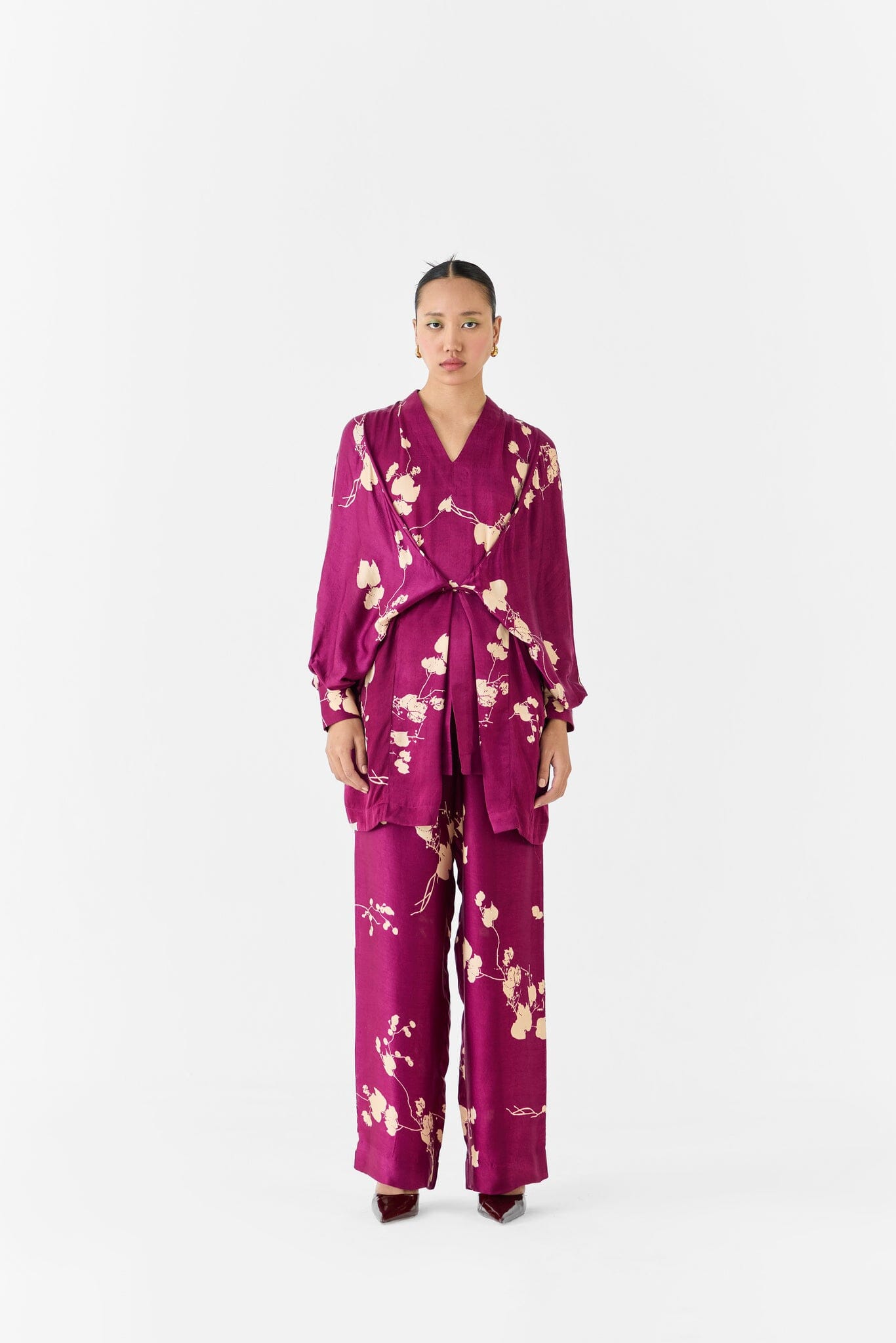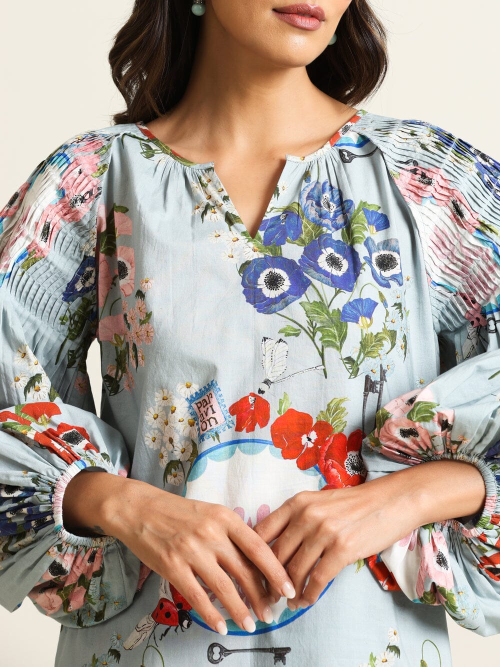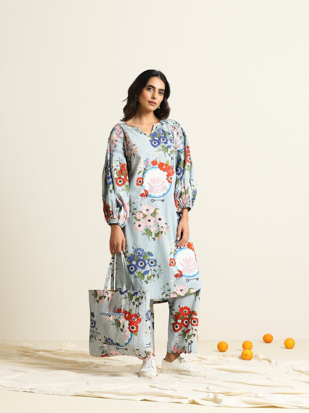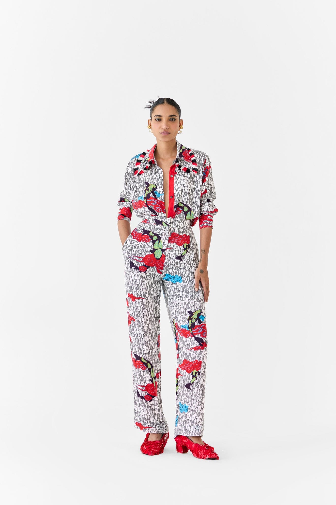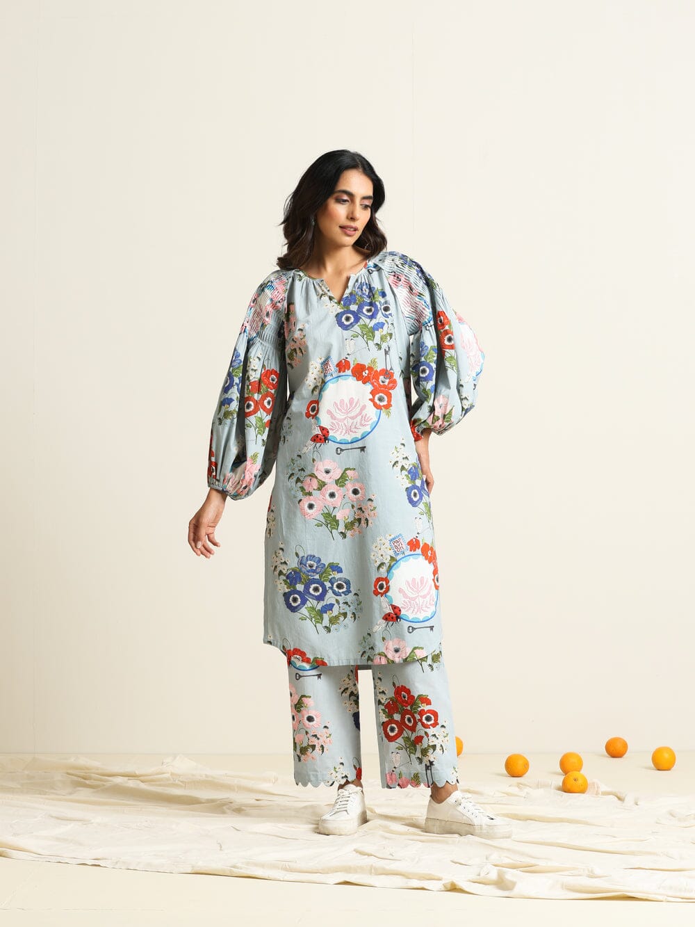 Orange Printed Balloon Sleeves Top And Panel Pants Set With Embroidery