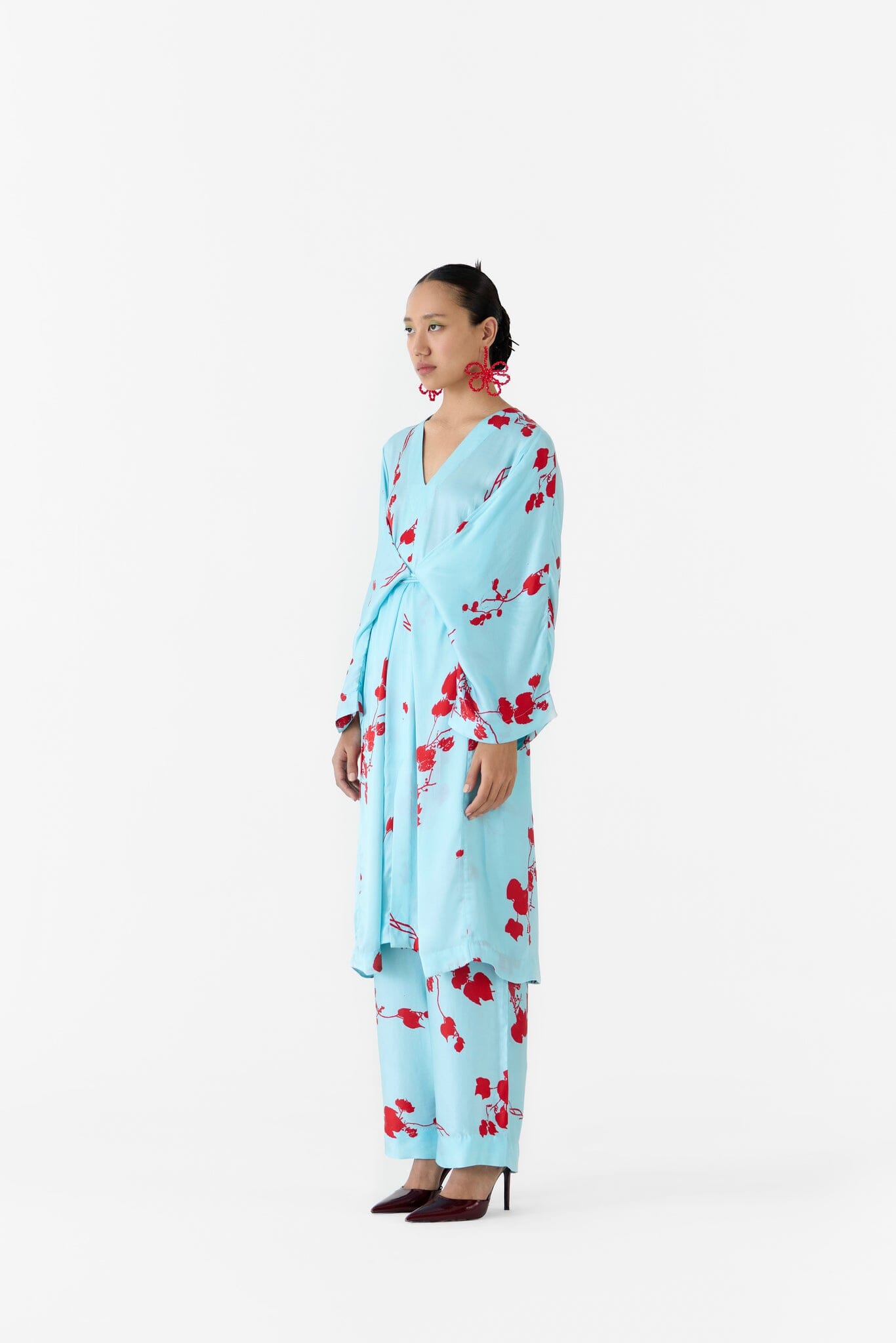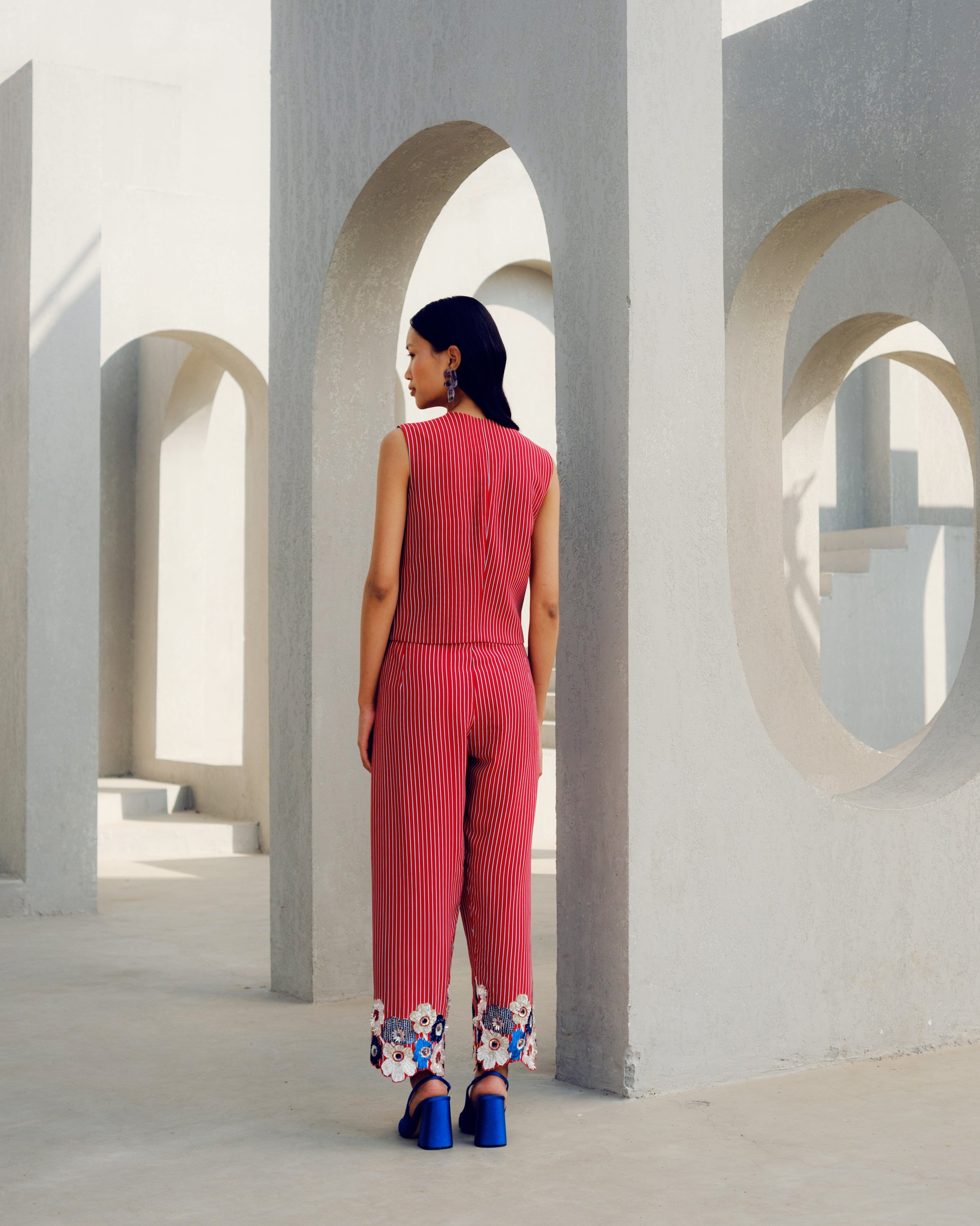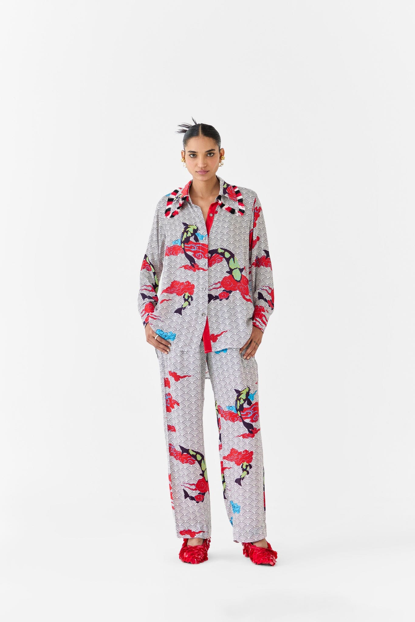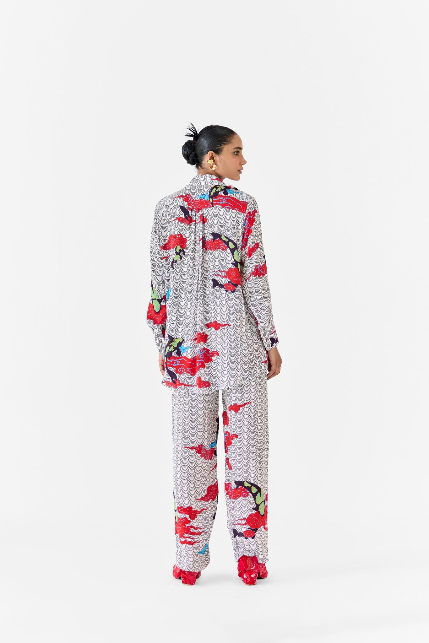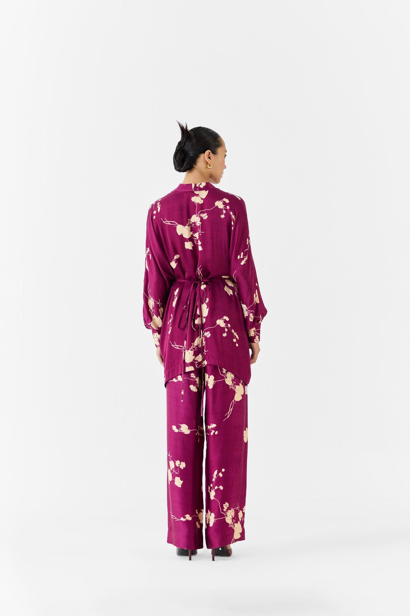 Orange Printed Balloon Sleeves Top And Panel Pants Set With Embroidery