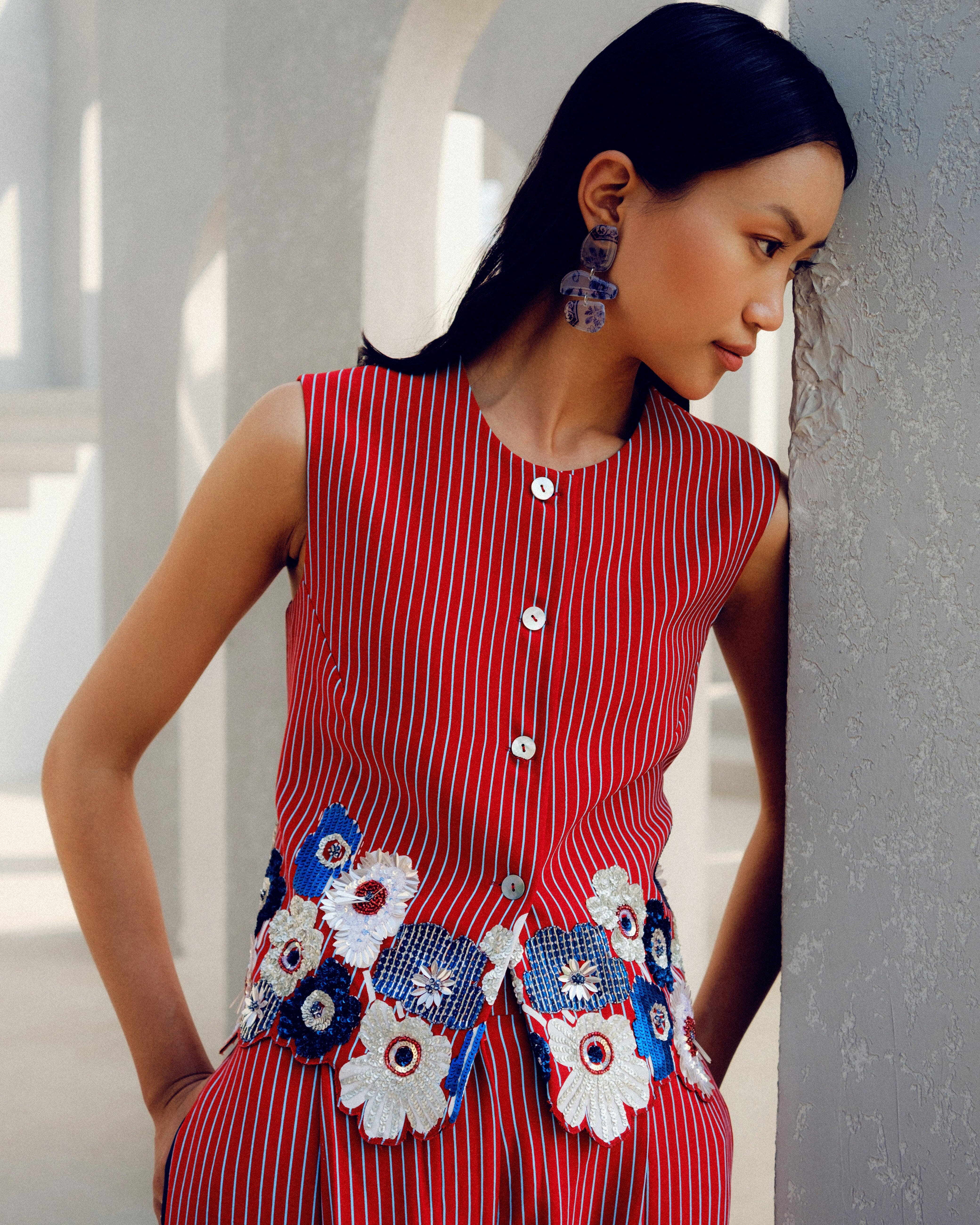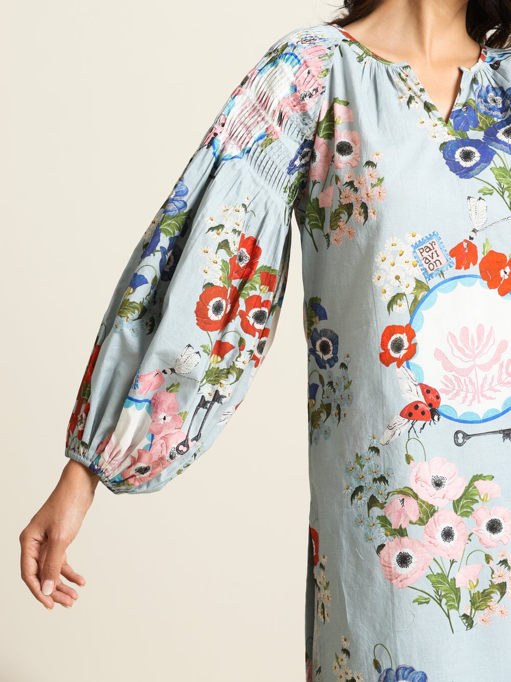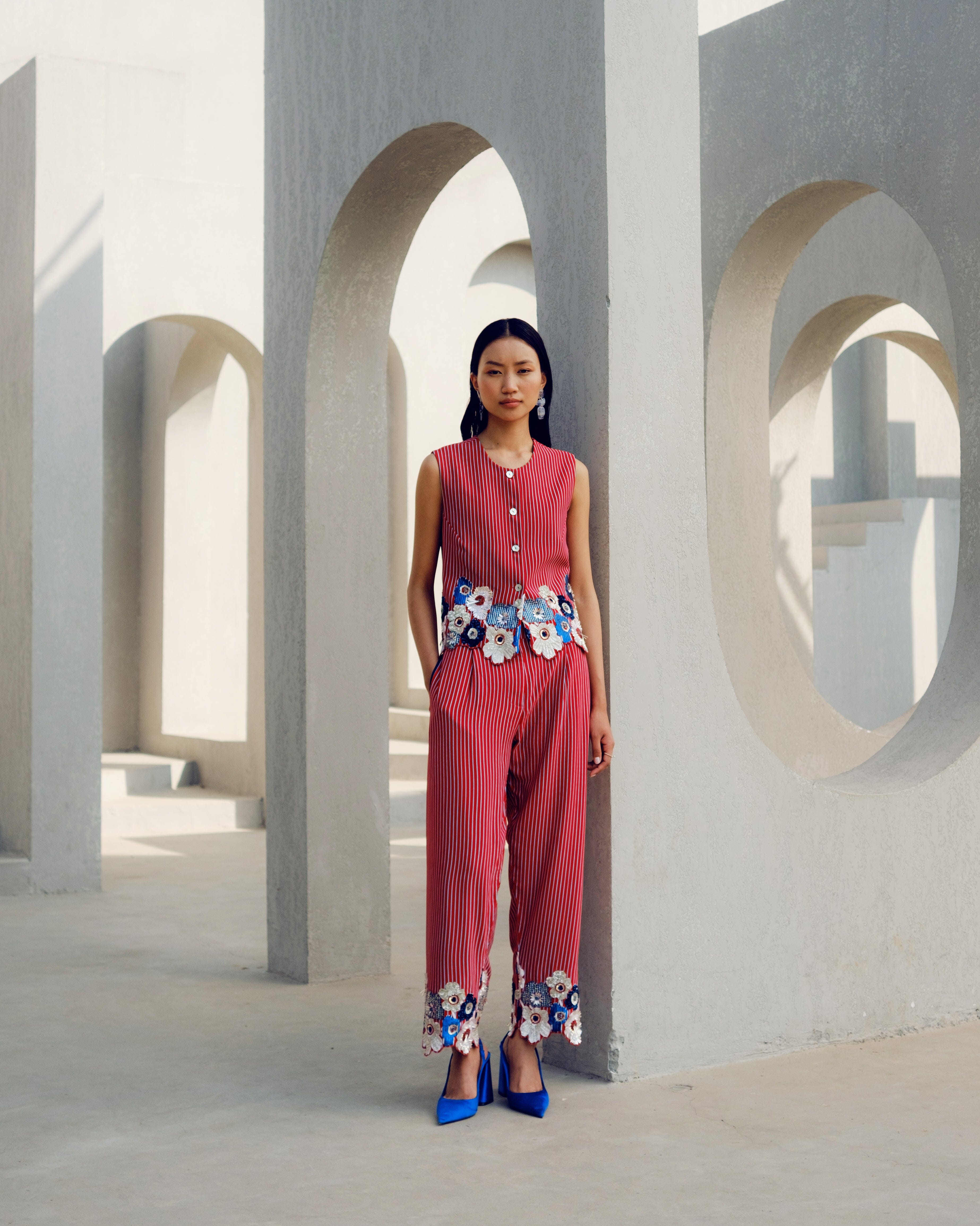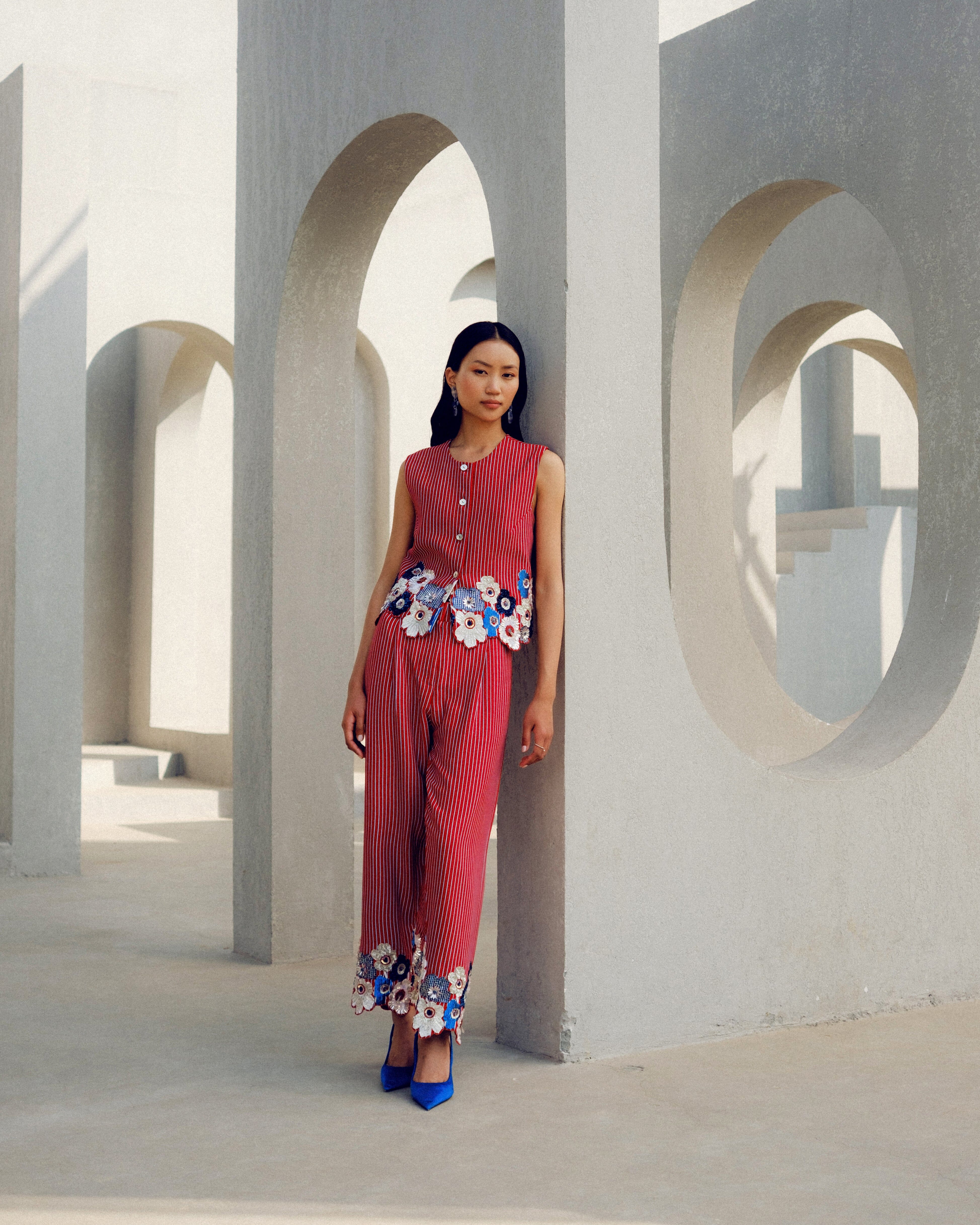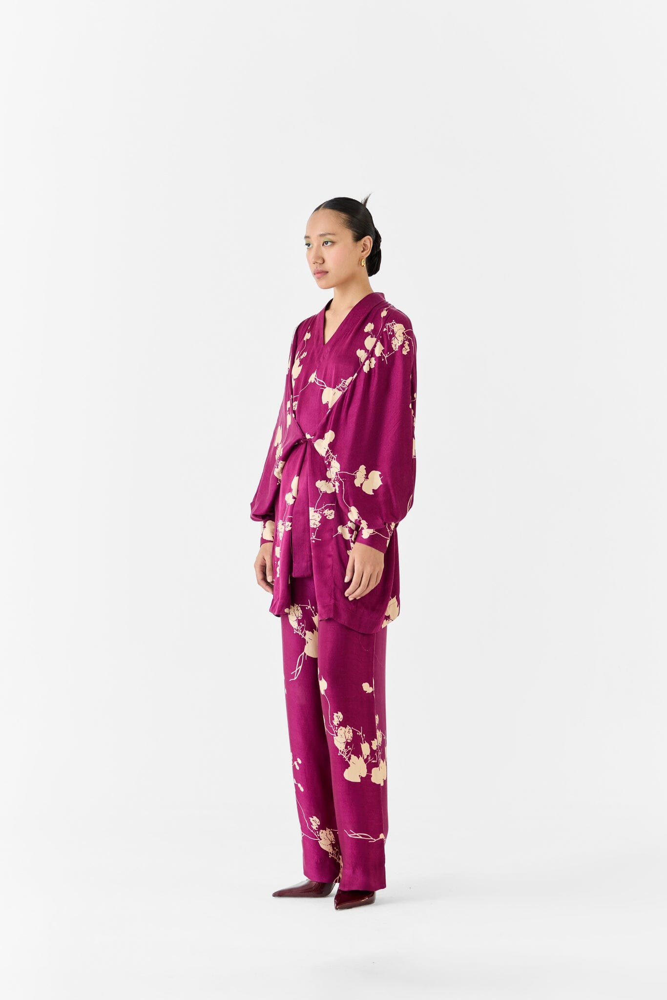 Orange Printed Balloon Sleeves Top And Panel Pants Set With Embroidery