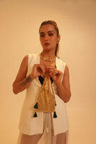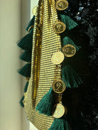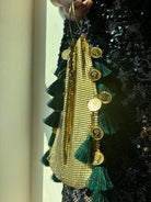Meet the JHOLA Bag—a playful twist on the classic tote, inspired by the convenience of a polythene bag but elevated with luxurious details. This unique bag takes shape when you place your phone or essentials inside, creating a soft silhouette that's effortlessly stylish. Adorned with a gold-plated finish, dark-green tassels, and a Queen Elizabeth-engraved coin, the JHOLA Bag is a modern statement piece with vintage charm.
