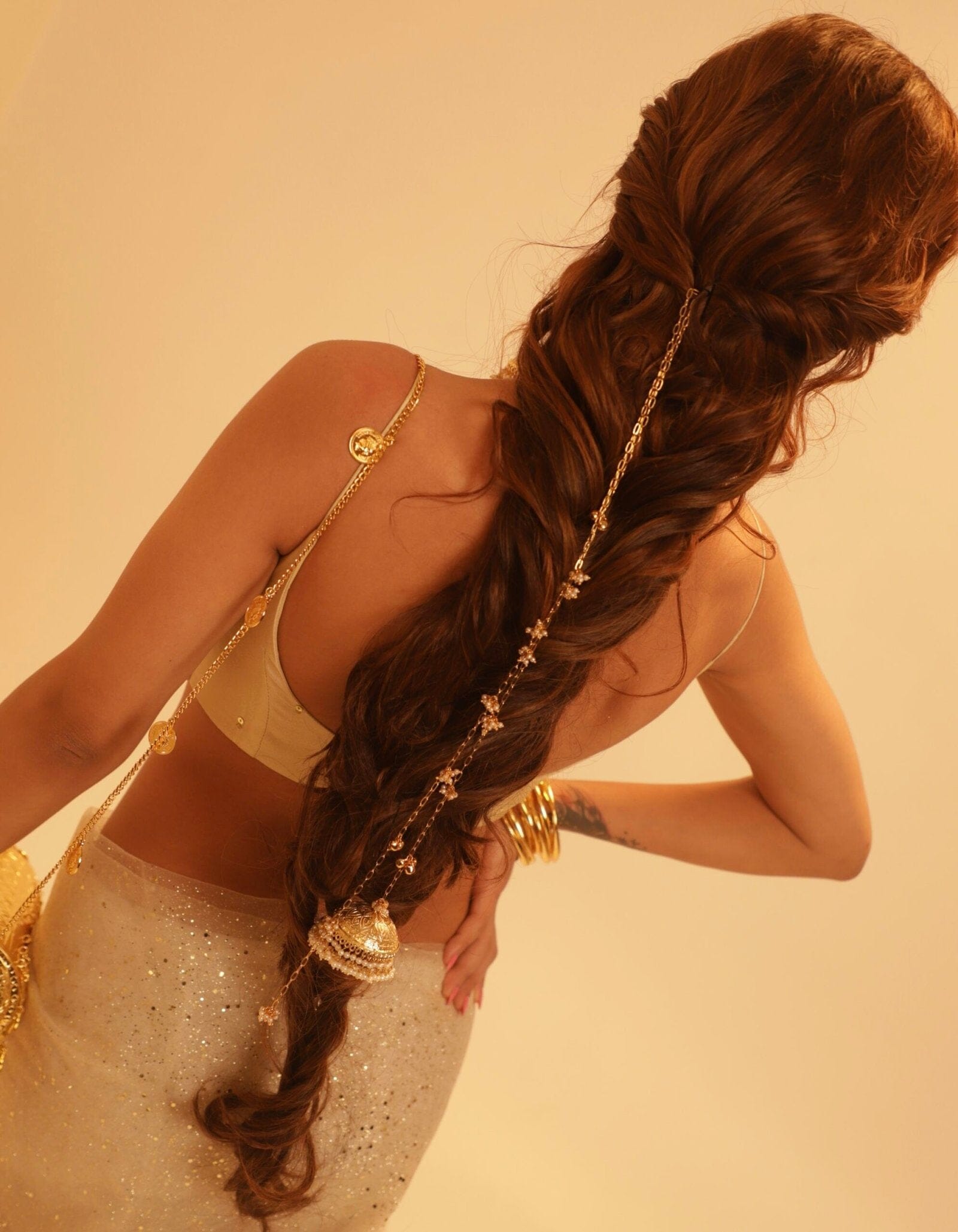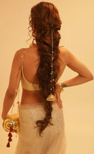 The Basra Parandi is a traditional hair accessory originating from South Asia, often used to adorn braided hairstyles. It typically consists of colorful threads, tassels, and sometimes intricate beadwork or metallic embellishments. Worn during festivals, weddings, and cultural celebrations, the Basra Parandi enhances the beauty of long braids, adding a touch of elegance and cultural heritage to the overall look.