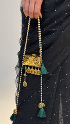 Basra Coin Bag - Featuring square Basra pearls, coin charms, and bottle green tassels, making it the ultimate evening accessory.