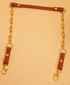 Tan-brown leather belt, hand trinket, dark-brown round glasses