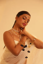 The Neel Sutra bangle is a stunning piece of jewelry that combines traditional artistry with modern elegance. Known for its intricate craftsmanship, it often features designs inspired by Indian culture, such as detailed engravings, enamel work, or gemstone embellishments. Ideal for special occasions or as a statement accessory, the Neel Sutra bangle adds a touch of sophistication and cultural charm to any outfit.