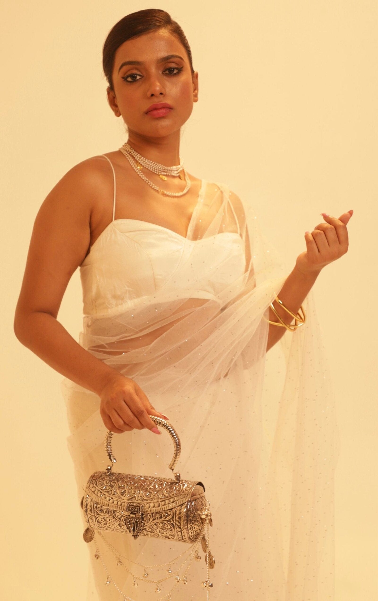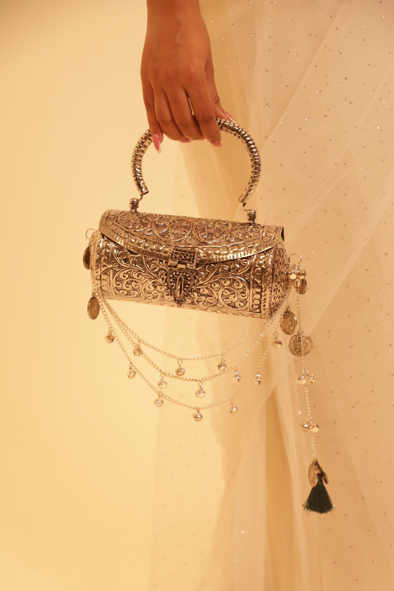 Shimmer and Sound: The Silver Surmay Bag with Blue Threads and Curved Ghungroo Chain.
