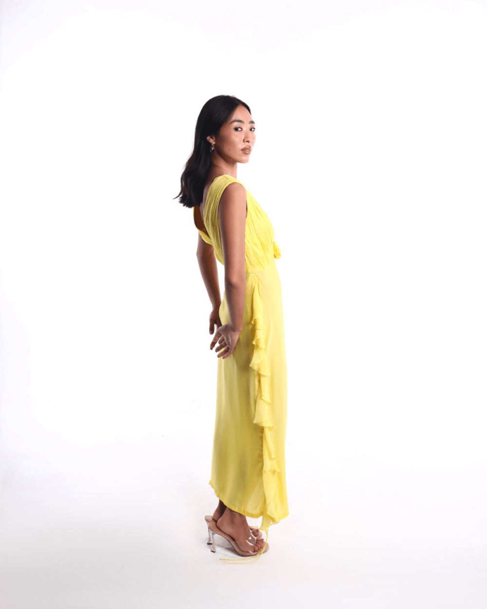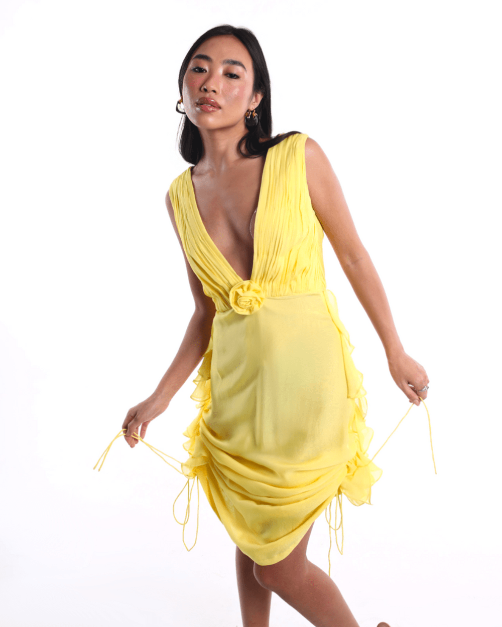 The CANARY dress features a deep V neckline, softly pleated bodice, and a rosette cinch at the waist for a flattering silhouette. Adjustable ruching along the hemline adds shape and drama, while the breezy chiffon fabric brings effortless summer elegance. In a bold canary yellow, your go-to for sunlit soiree, brunches, and any moment that calls for joy.