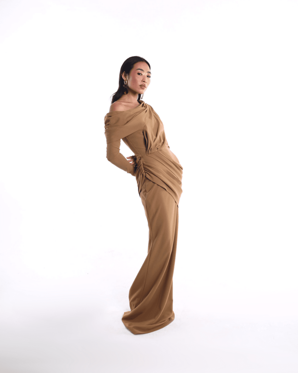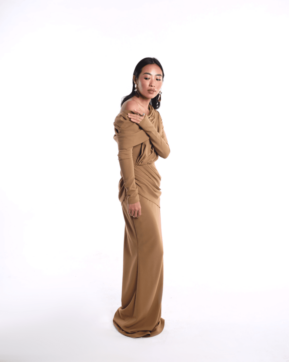The CARMELLA dress features a luxe cocoa-brown tone with masterful draping across the bodice and hip, creating a flattering, fluid silhouette. The off-shoulder neckline frames the collarbone with understated allure, while the full-length hem gives it graceful drama. Crafted in a matte stretch fabric that hugs and flows, perfect for elevated evenings, artful affairs, or a modern muse moment.