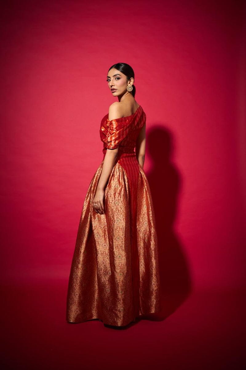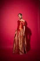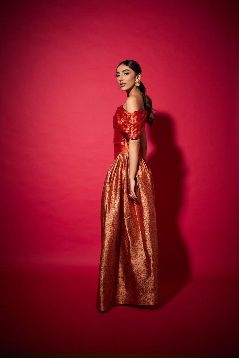 A stunning brocade silk dress structured to steal hearts. Off-shoulder detail and rooched side panels add just the right dose of drama. A true showstopper.