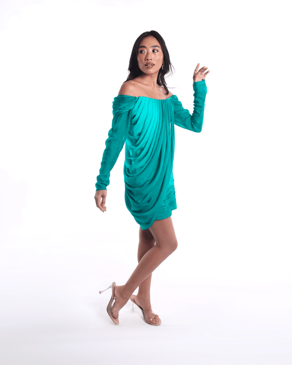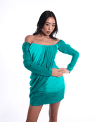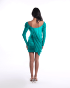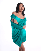 The Gemma dress is a standout mini that plays with contrast and movement. Featuring an off-shoulder neckline, accordion pleated bodice, and ruched draped skirt, this dress sculpts the body while maintaining a soft, fluid silhouette. The sleeves fall just right, adding elegance to its bold, playful shape. Done in a vivid emerald green, a show-stealer from every angle.