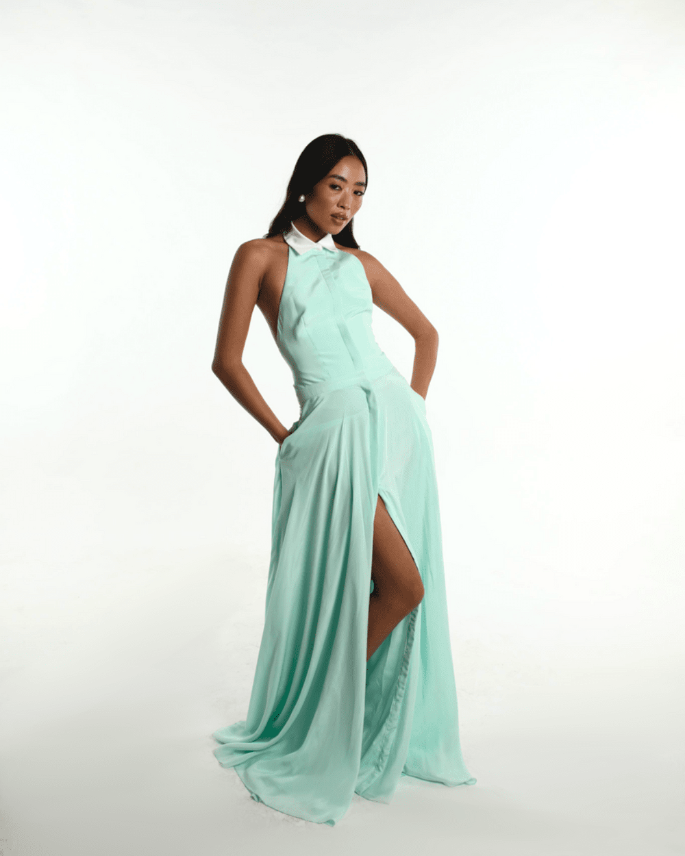 This dress is a refreshing blend of modern tailoring and effortless grace. Featuring a structured halter neckline with a crisp white collar detail, it brings a playful twist to classic elegance. The soft, fluid fabric flows into a dramatic front slit, giving it just the right touch of allure and movement. A statement piece for garden parties, resort evenings, or any moment you want to own with grace.