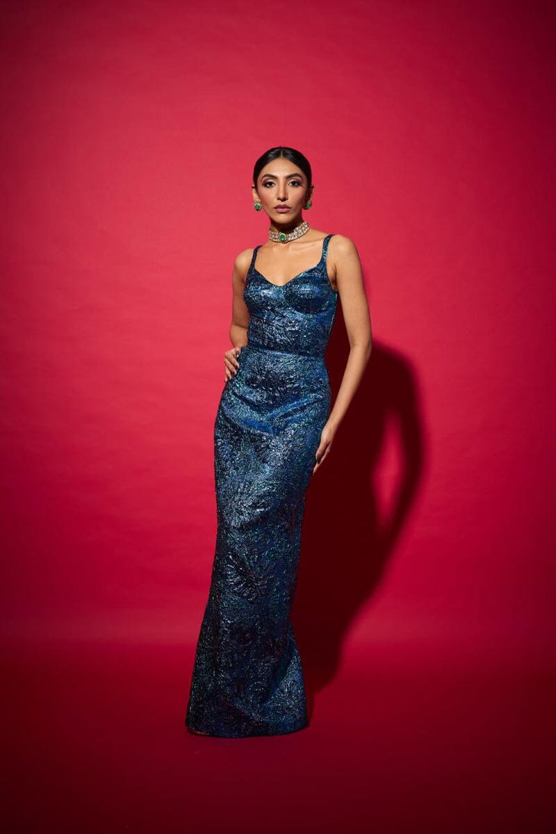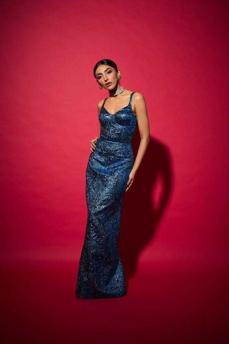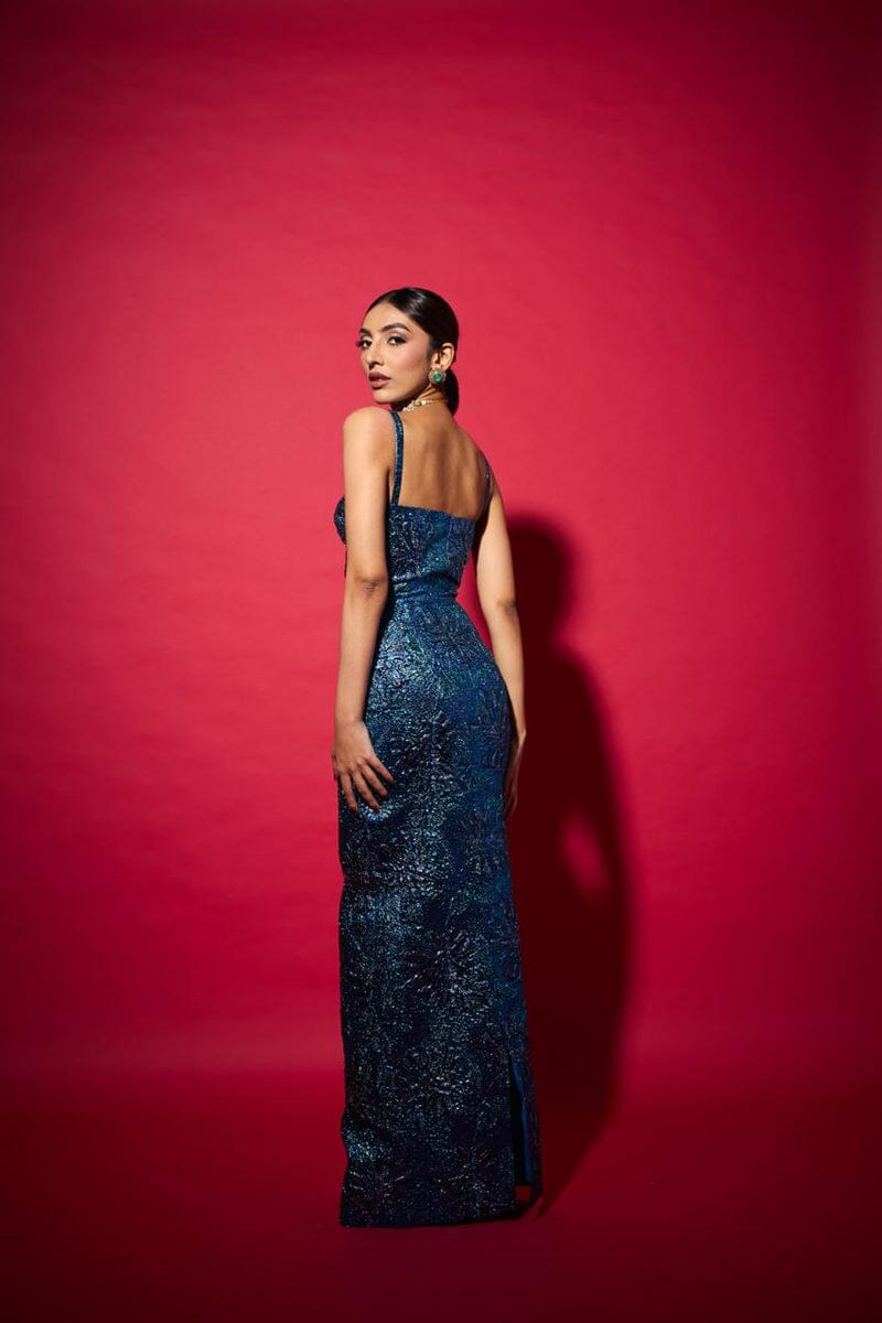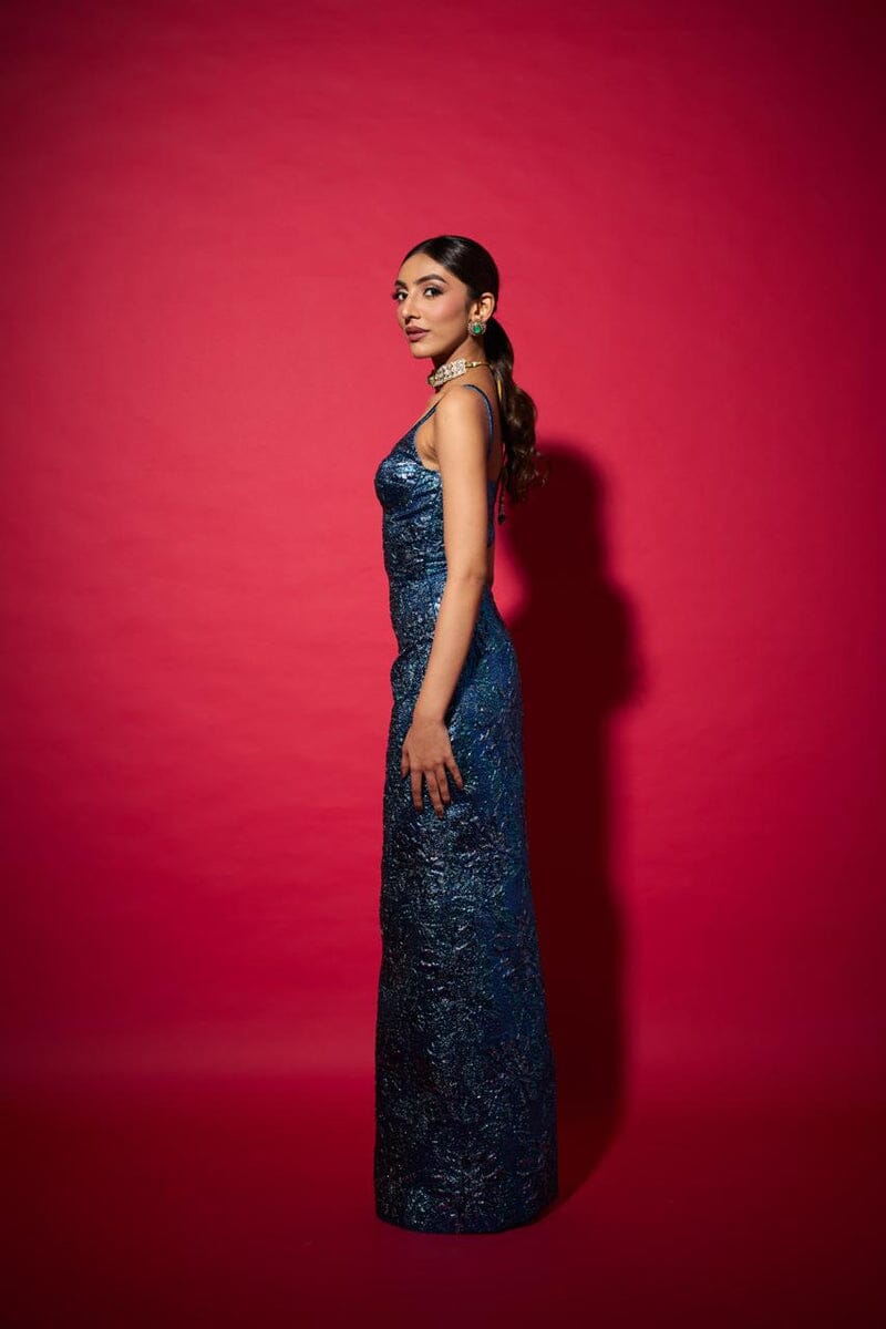A statement electric blue jacquard dress where timeless heritage weaving meets a contemporary silhouette. Crafted for those who celebrate elegance with edge, it transitions seamlessly from festive soirées to gala nights and destination weddings.