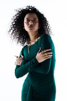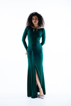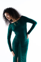 Luxurious lycra fabric in a rich green hue shapes our maxi dress. A split skirt with a statement knot brings attention to our gorgeous silhouette. Prefect for after parties, bachelorette parties.