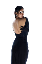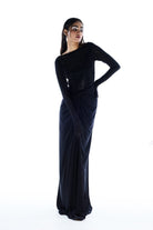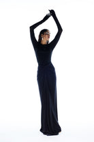 A two-piece set featuring a shimmering, long sleeve bodysuit with attached gloves paired with draped front knot skirt. Prefect for after parties, bachelorette parties.