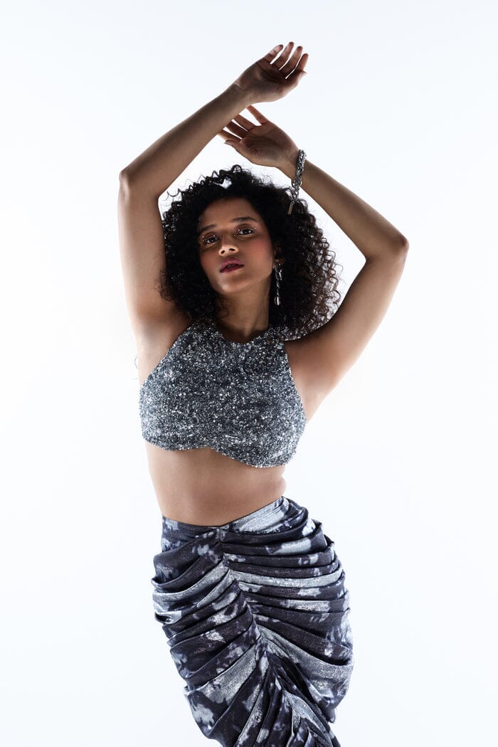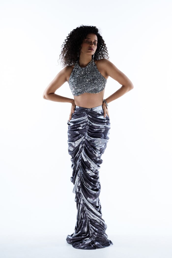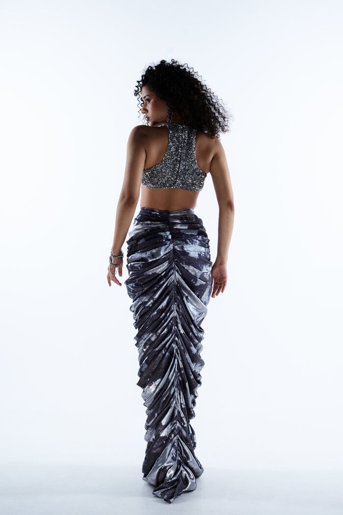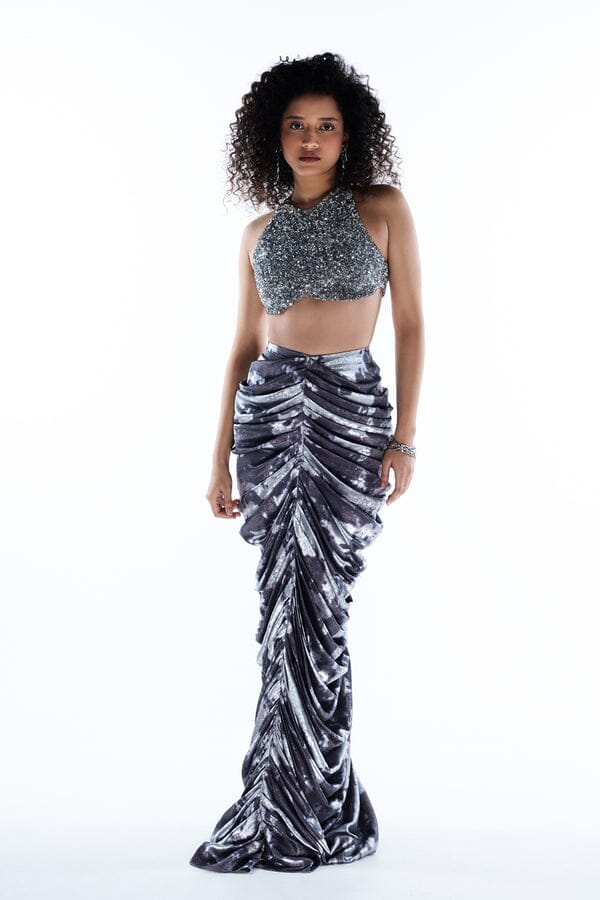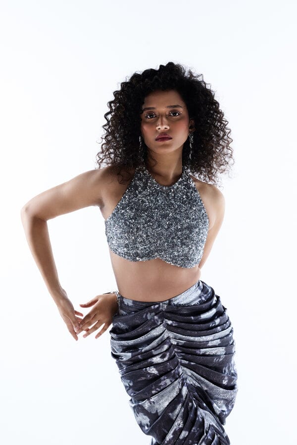 A two-piece set of crop top and high waist ruched skirt. The top is heavily embellished with sequins, adding shimmer effect. Perfect for cocktail parties , wedding parties, gala nights