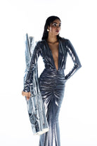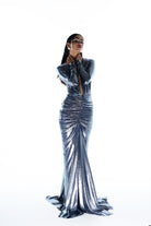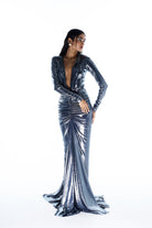 Metallic ruched evening gown with deep v-neckline, full length sleeve. A body hugging silhouette with ruching at the waist and hips, making it perfect for glamours parties, high end dinners, etc