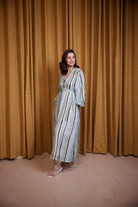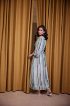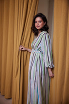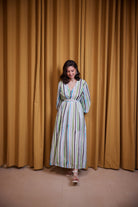 El vestido de fiesta perfecto, confeccionado en seda Cupro con nuestras llamativas rayas costeras. Es verano, divertido, fluido y femenino.