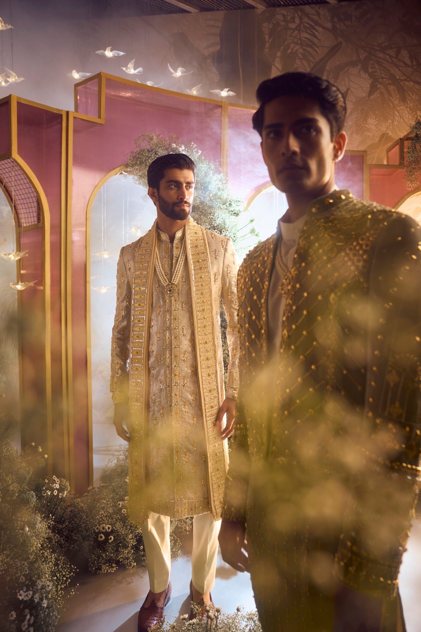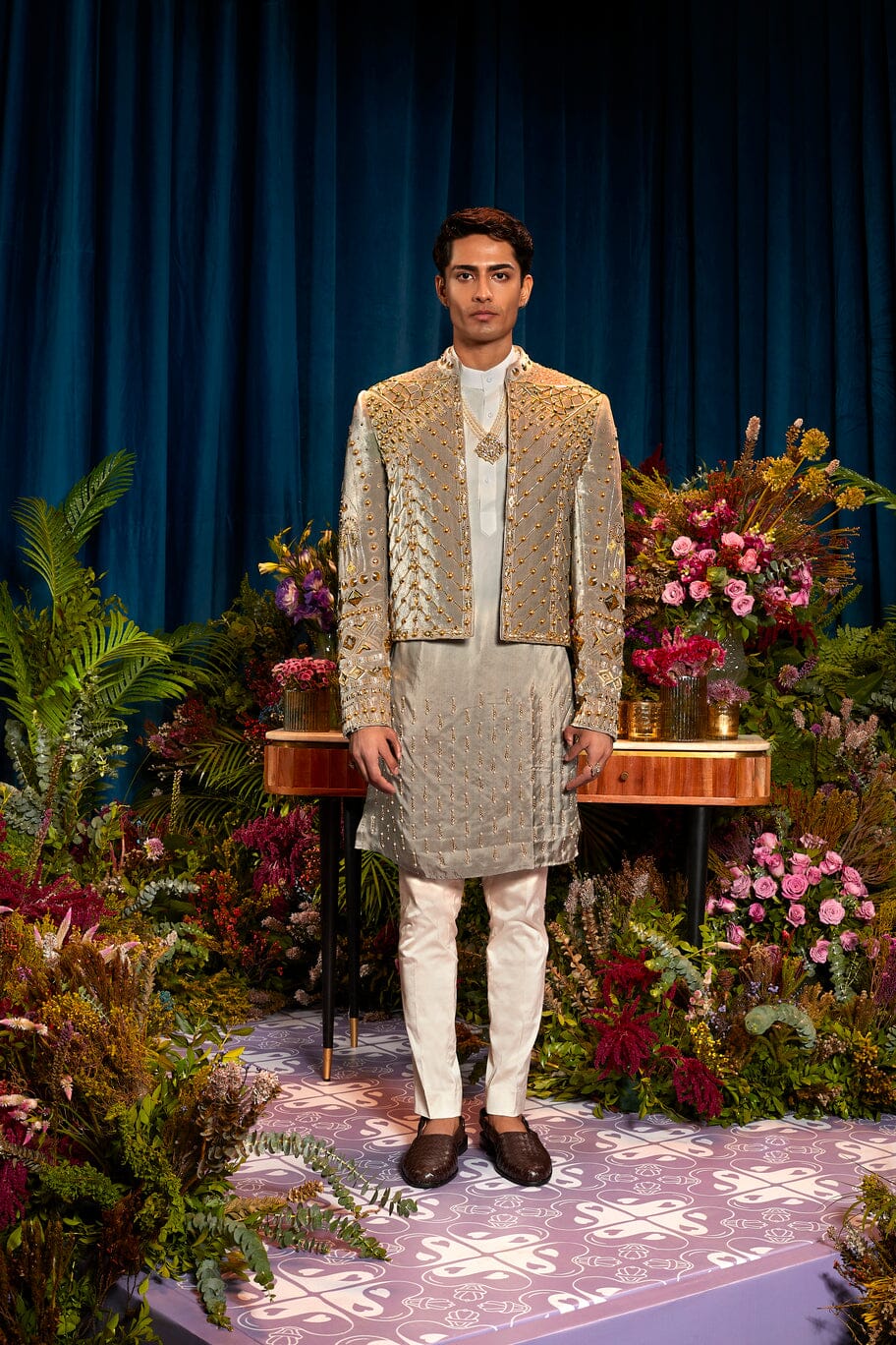 Featuring an intricately embroidered short jacket in grey velvet adorned with minute metallic embellishment detailing paired with an ombre kurta with intricate embroidery detailing on the hem and plain pants. This is the perfect fit for your Cocktail Night.