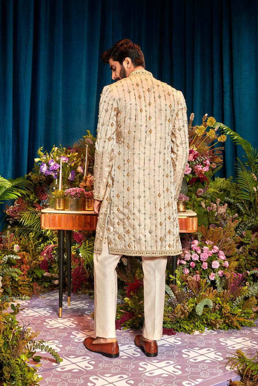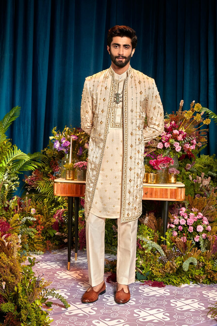 Perfect look for your Phera presenting an Open style embroidered jacket with metal embellishments, glass bead embroidery and pearls paired with an embroidered placket kurta and straight pants.