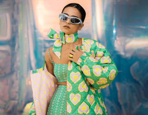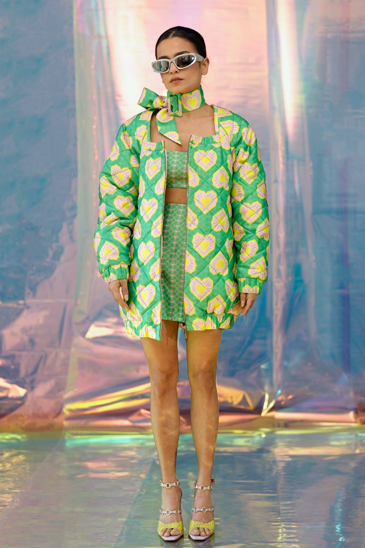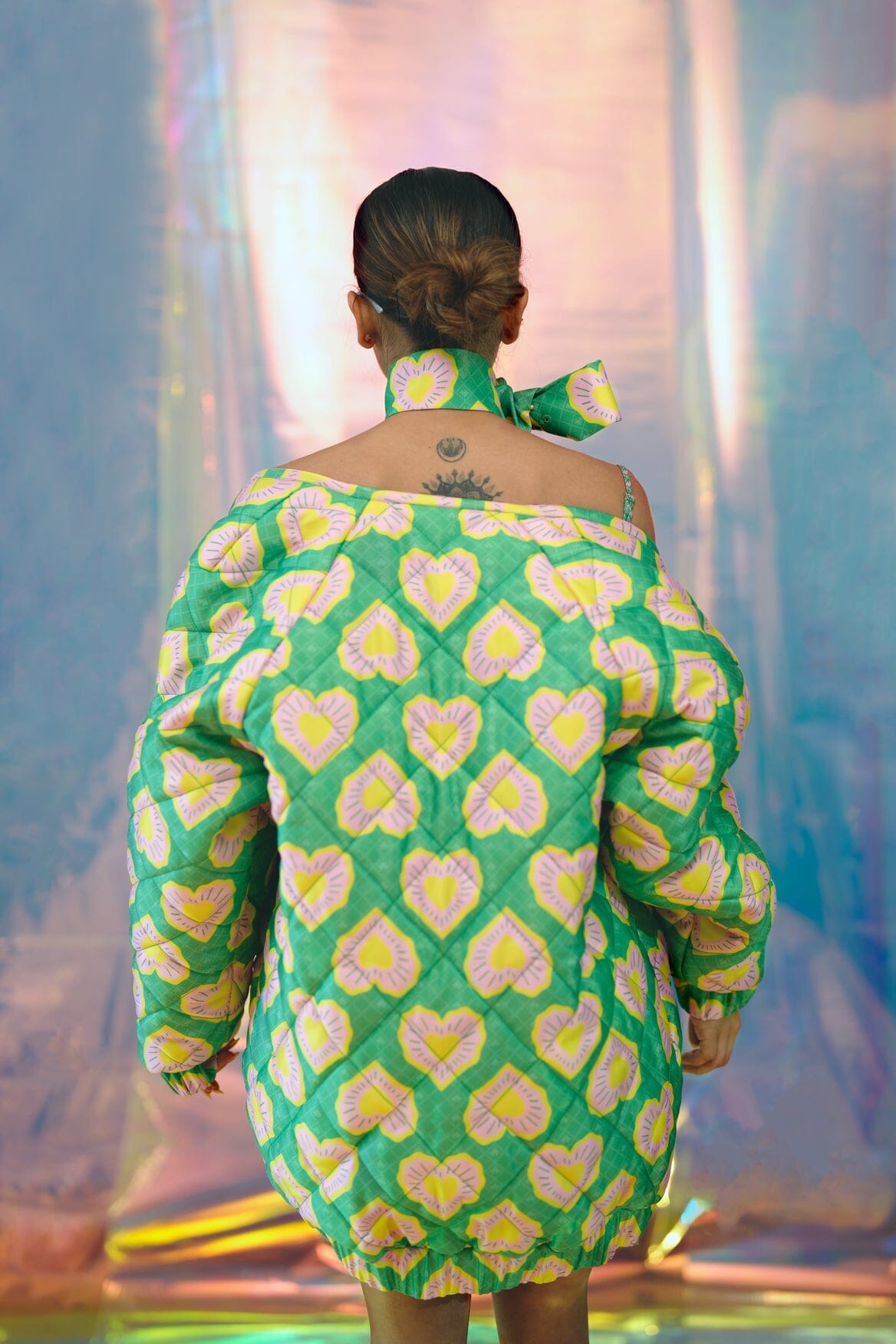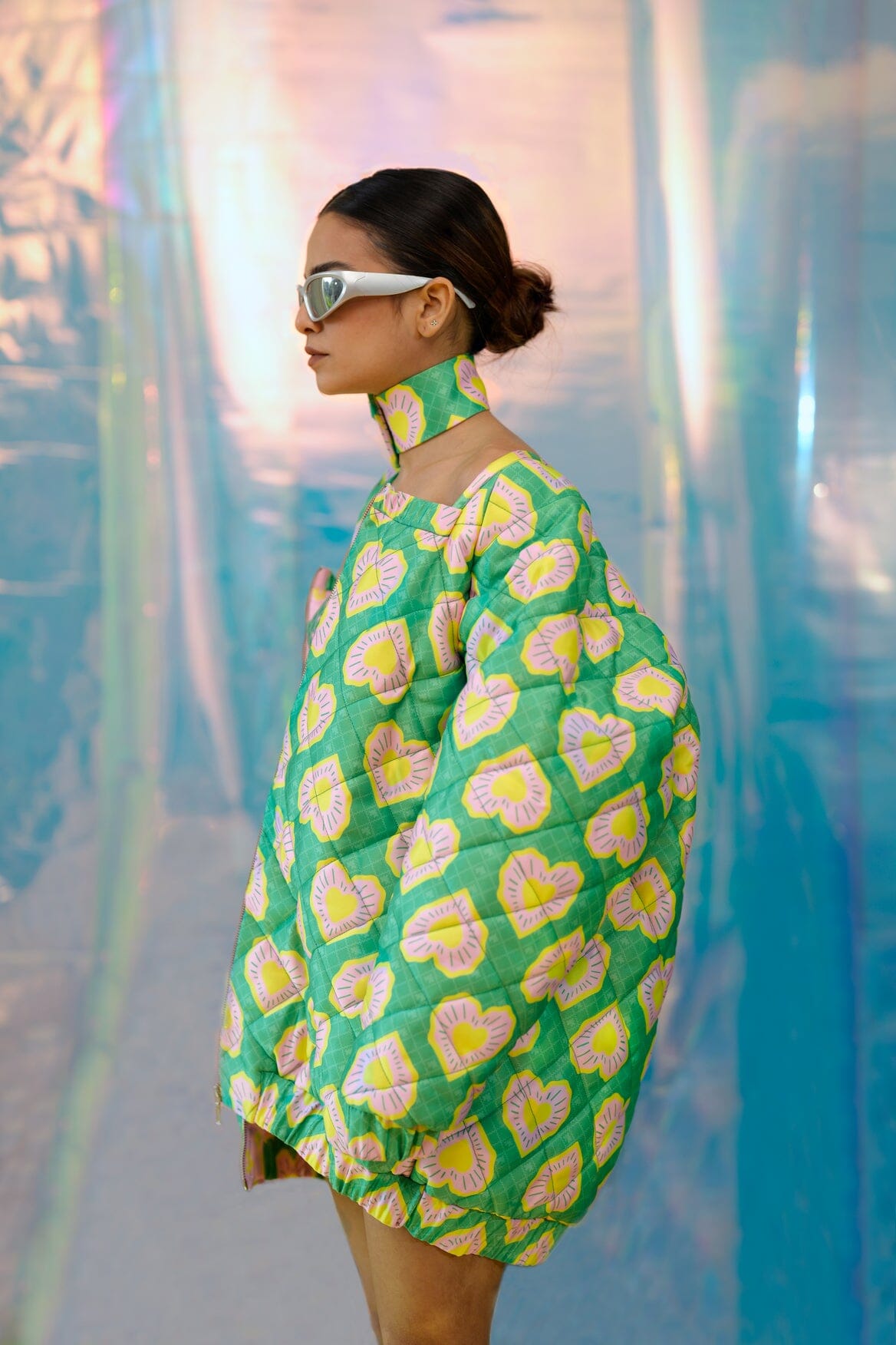 A geometric quilted bomber jacket in our green Blinding hearts print. With raglan cut sleeves to mimic the shape of a heart and pink metal zipper. Lined with a contrast pink pac street girl print.