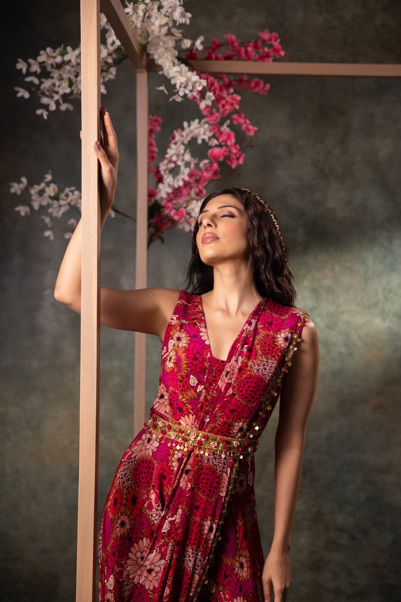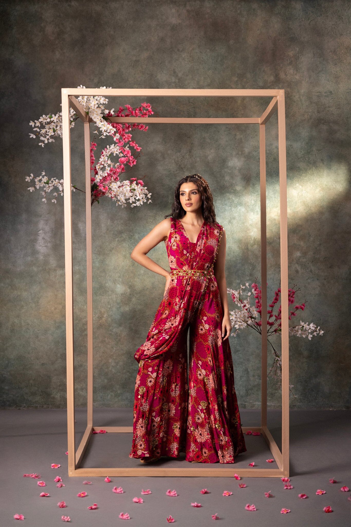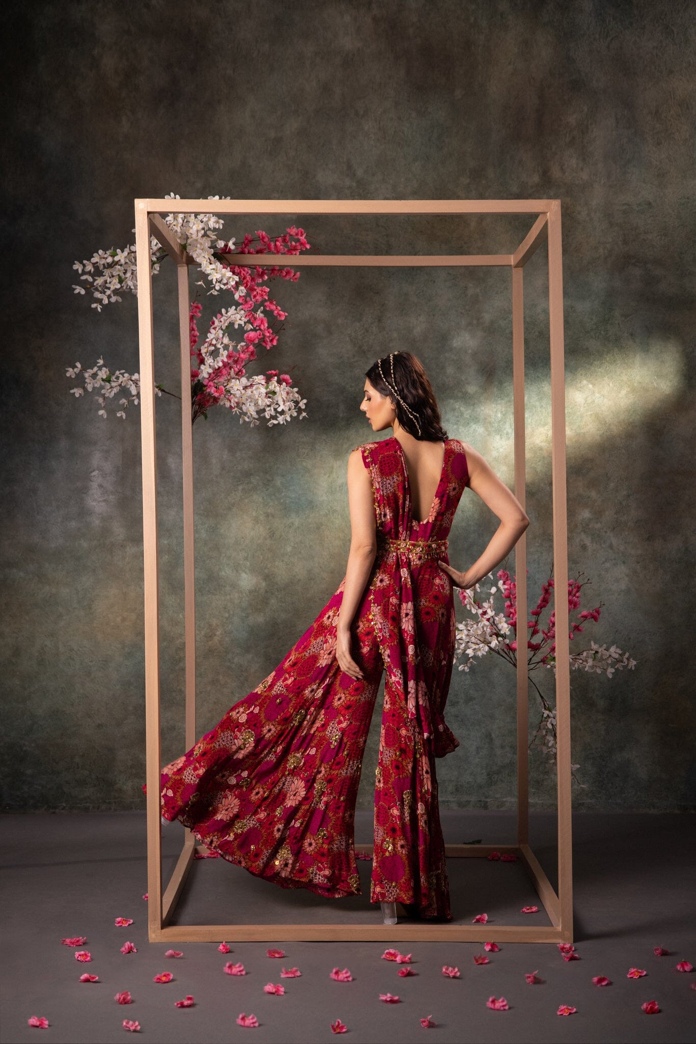 Pink Printed Jumpsuit, Drape And Belt Set With Embroidery