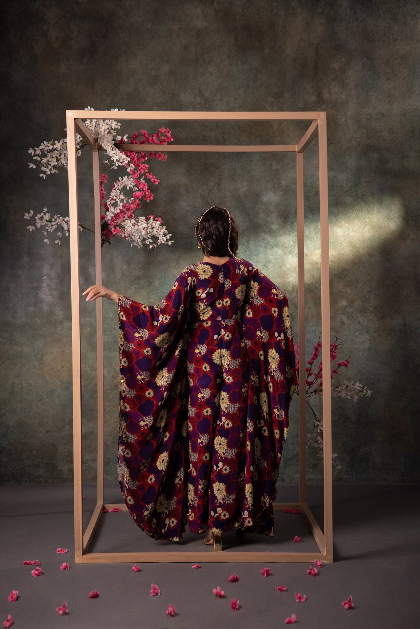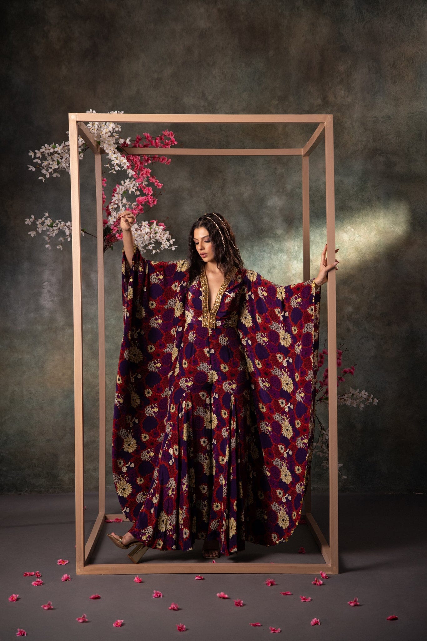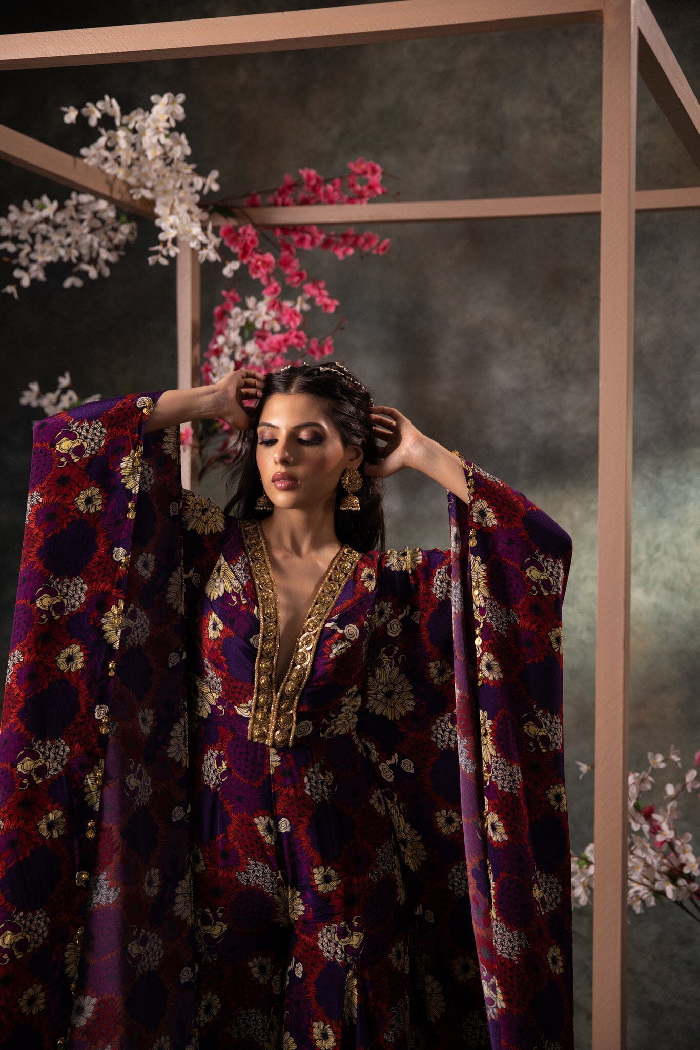 Purple Printed Kaftan Jumpsuit With Embroidery