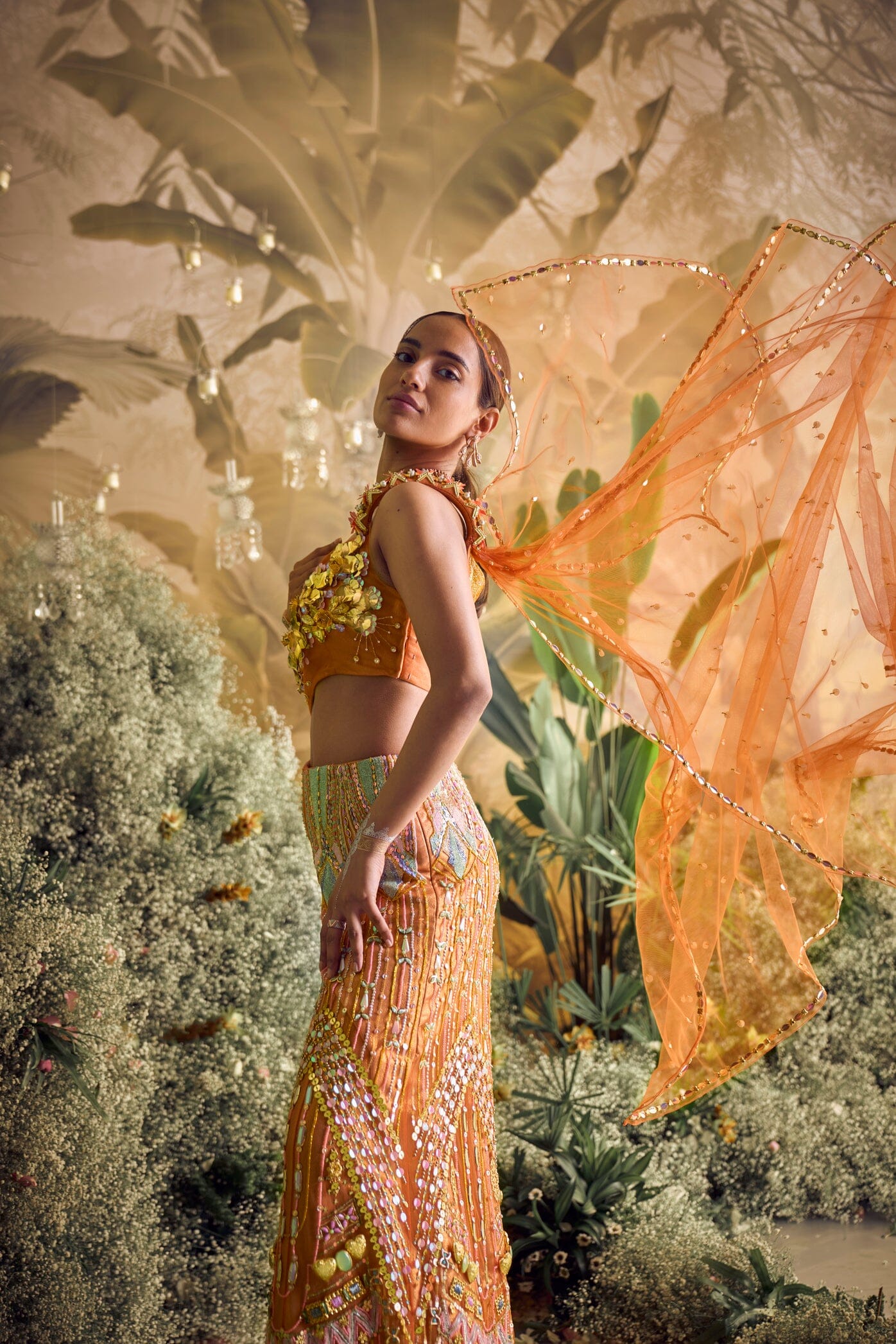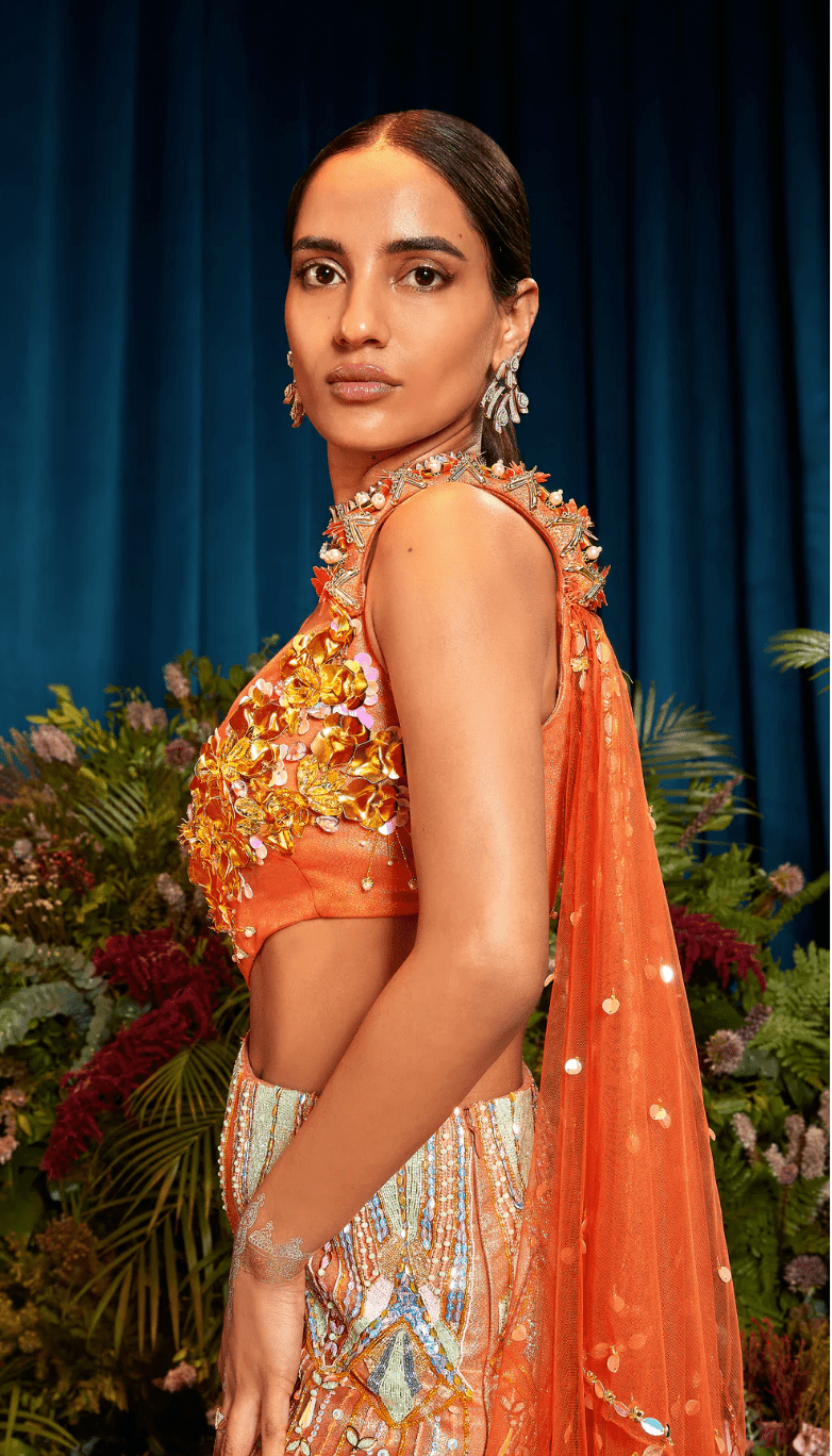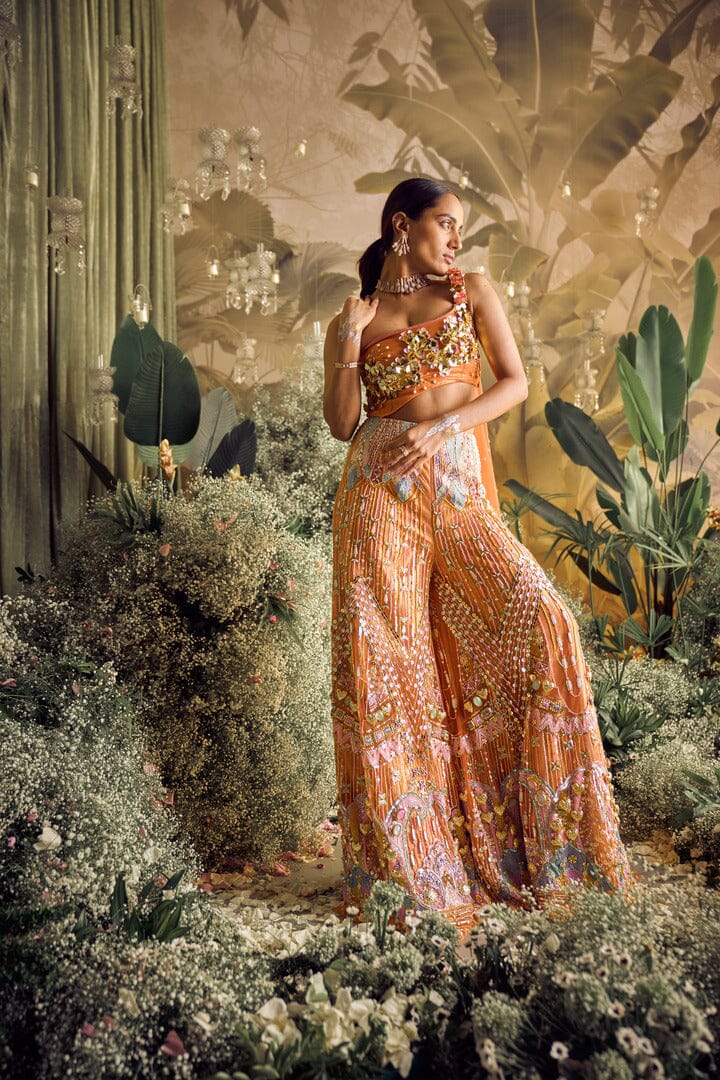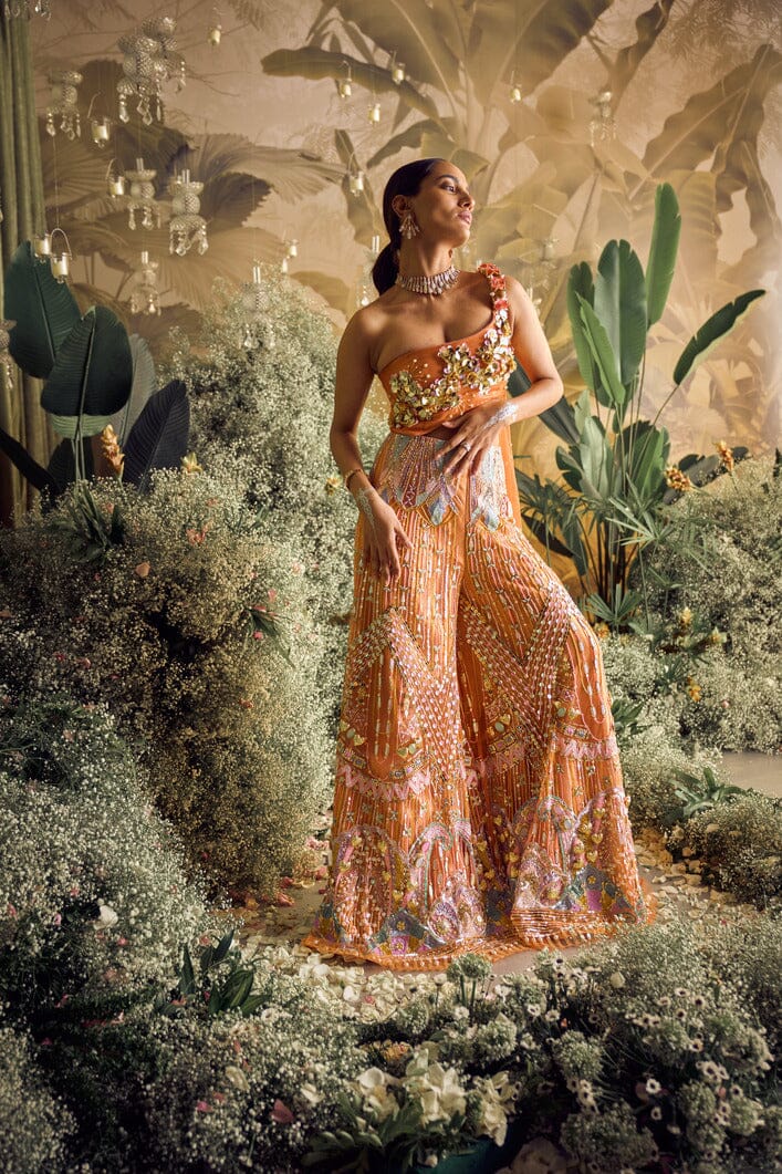 A brick brown jumpsuit fit for a modern fairy-tale princess. Adorned with sequins, metals, crystals, and reflective cut beads, it casts a magical spell. The graceful tulle dupatta, attached with a touch of mystery, adds a dash of charm. Step into your own fairy-tale with this captivating bridal ensemble."