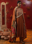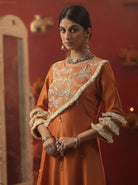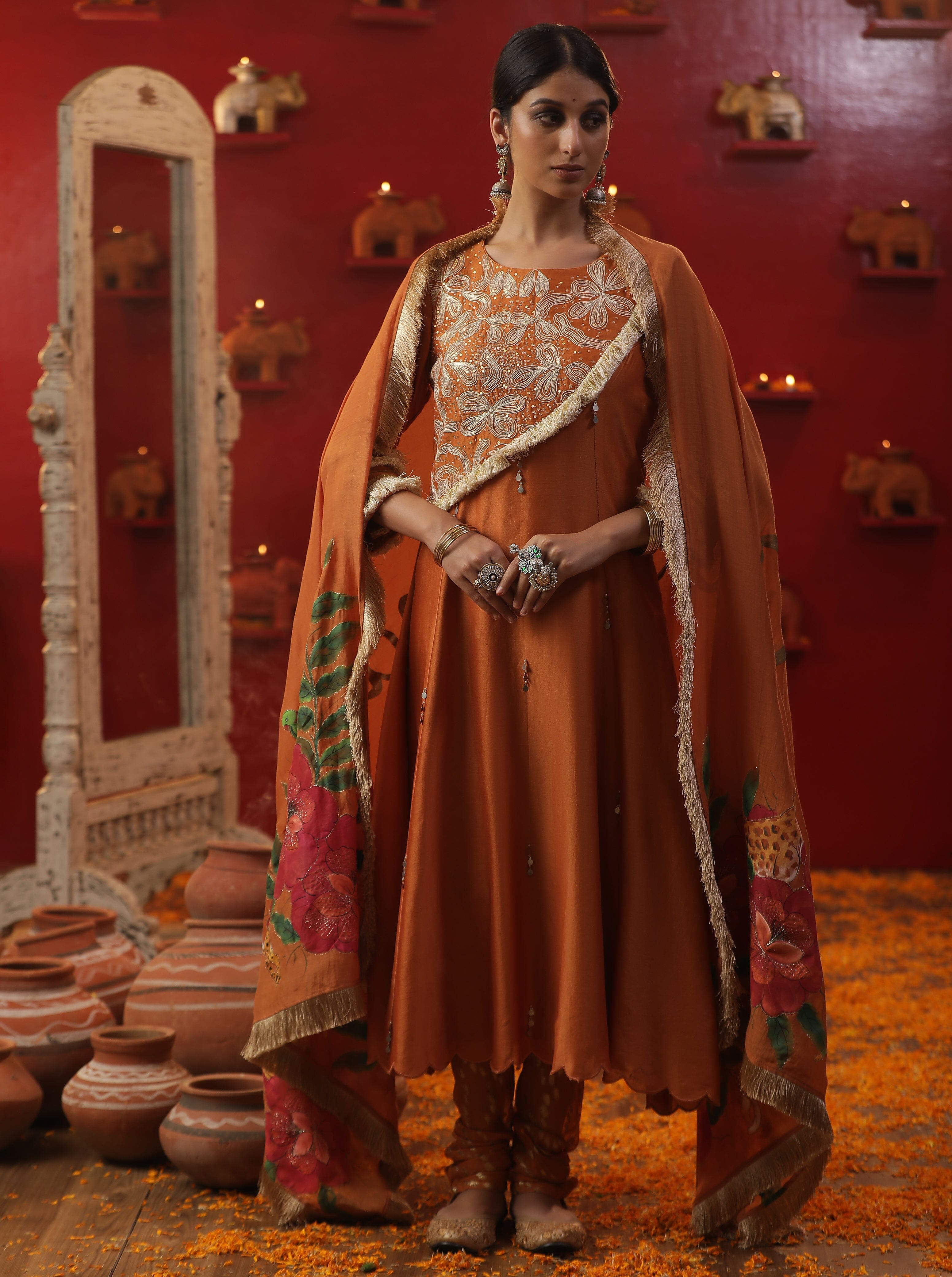 Presentamos el conjunto de traje naranja quemado hecho a mano, adornado con una dupatta pintada a mano y un intrincado trabajo dori. El outfit perfecto para quienes aprecian el lujo y la exclusividad.
