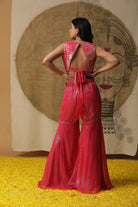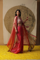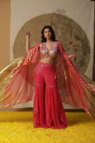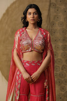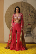 Con nuestra capa de coral con plazzo y trabajo hecho a mano en el cinturón. Viene con capa de georgette y blusa hecha a mano.