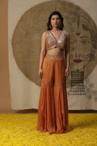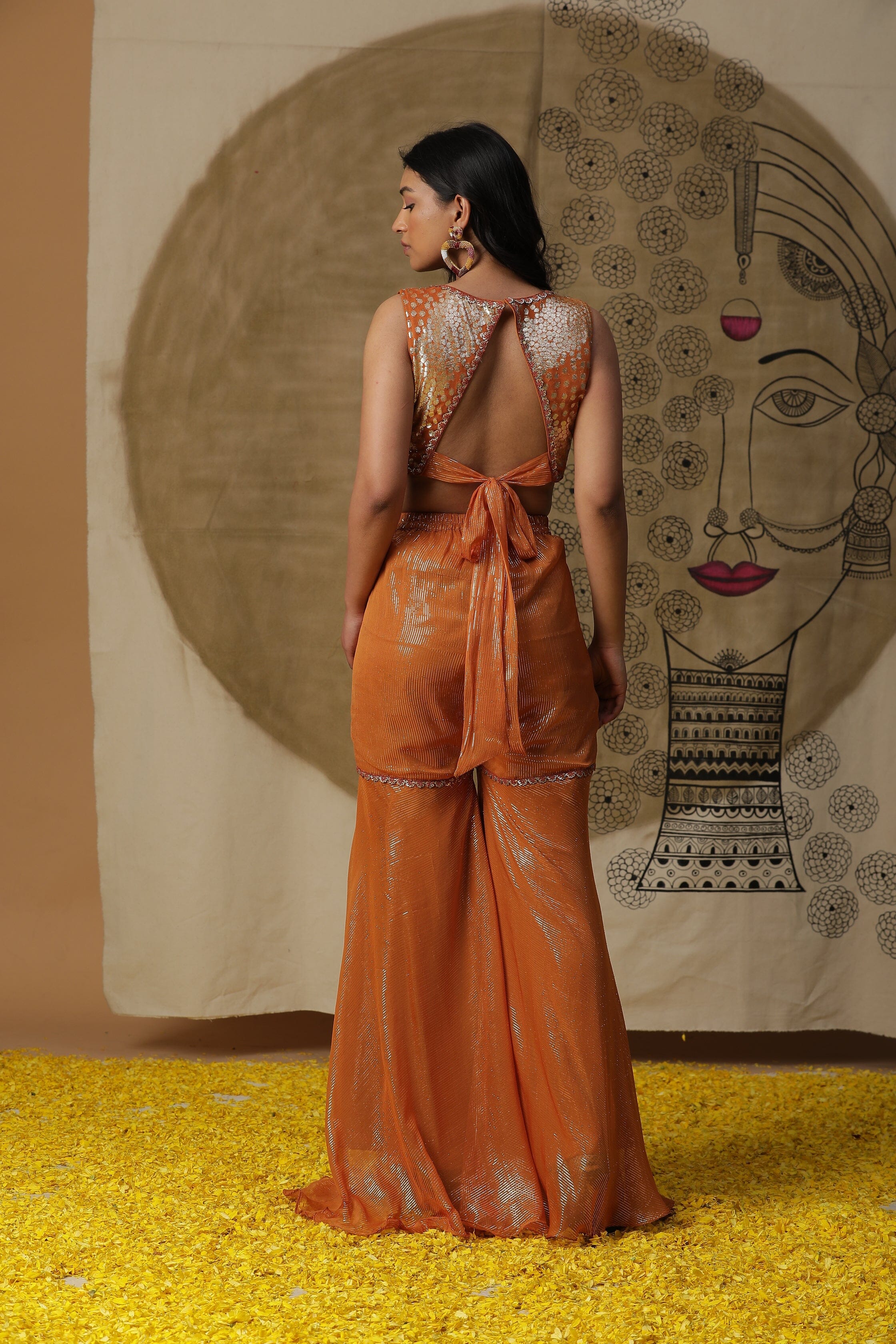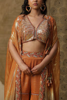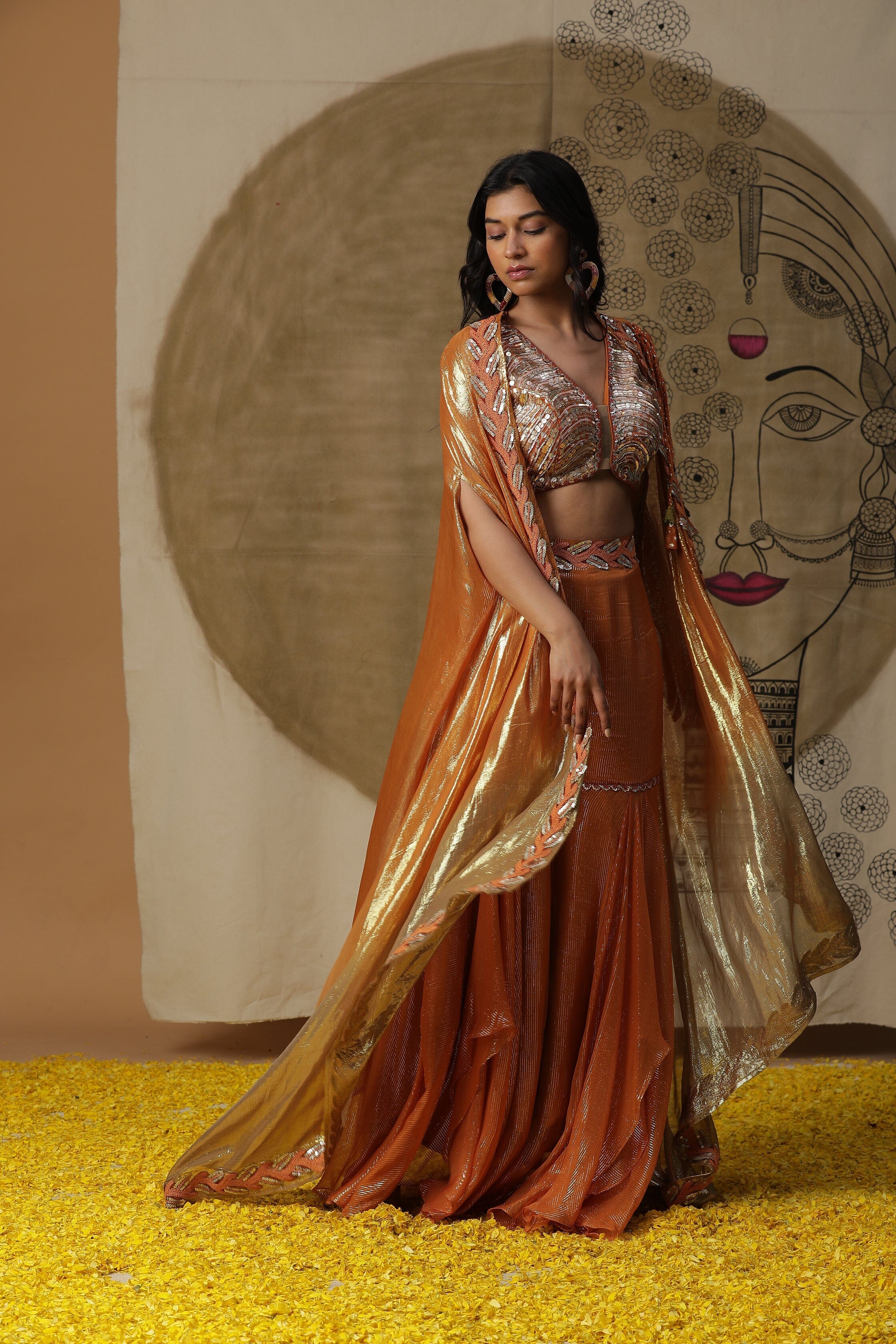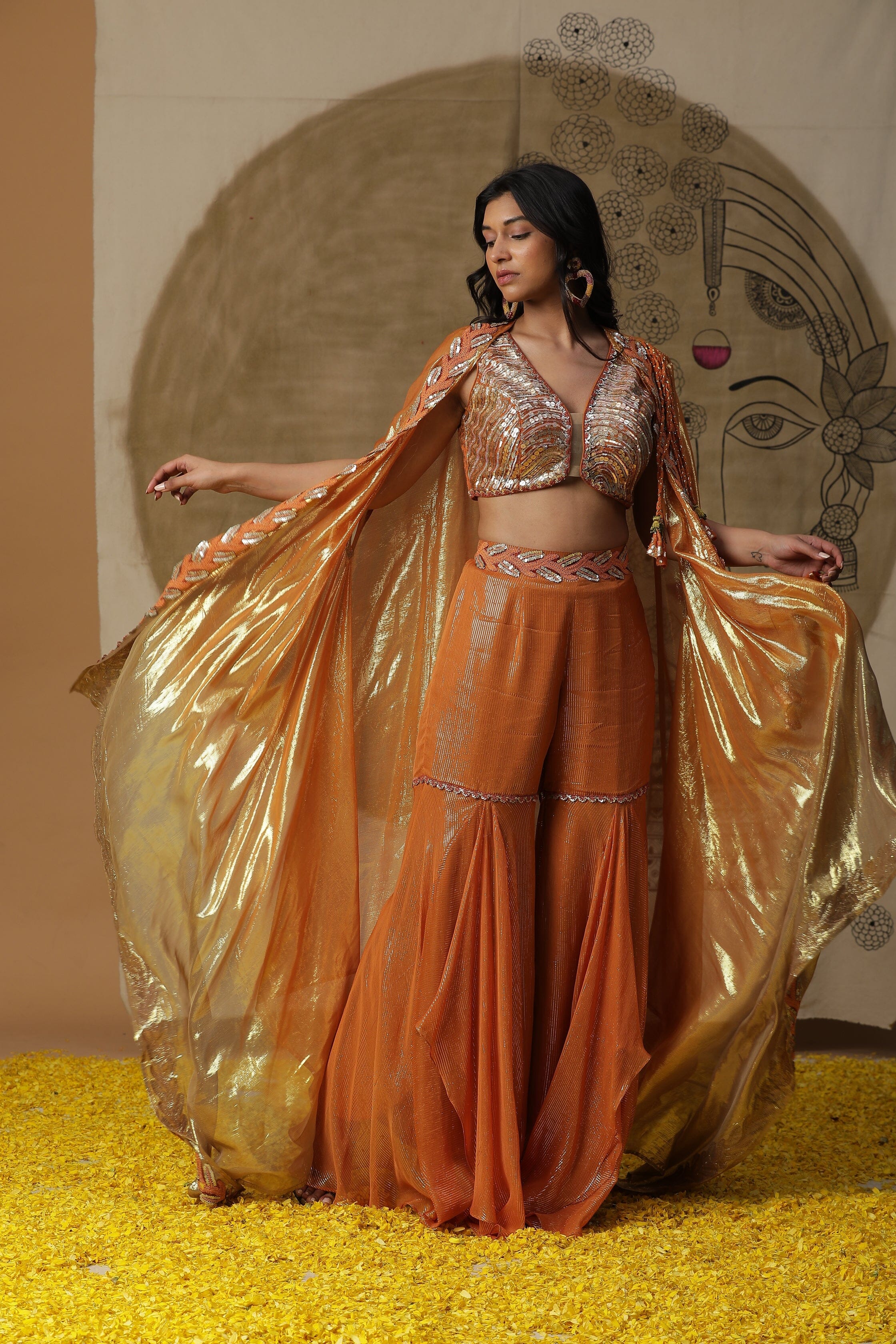 presentando conjunto palazo naranja. Viene con blusa de lentejuelas y capa sombreada.