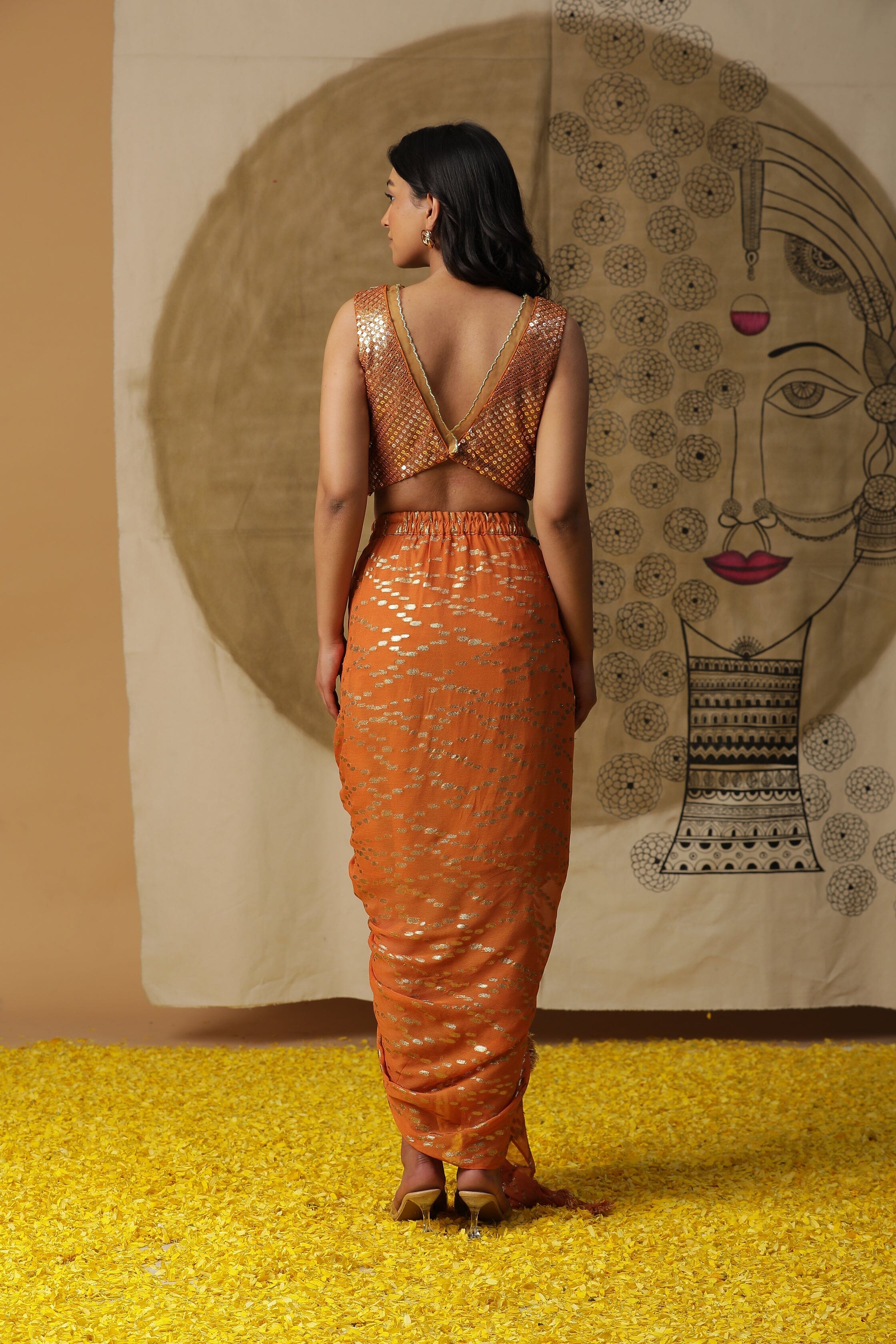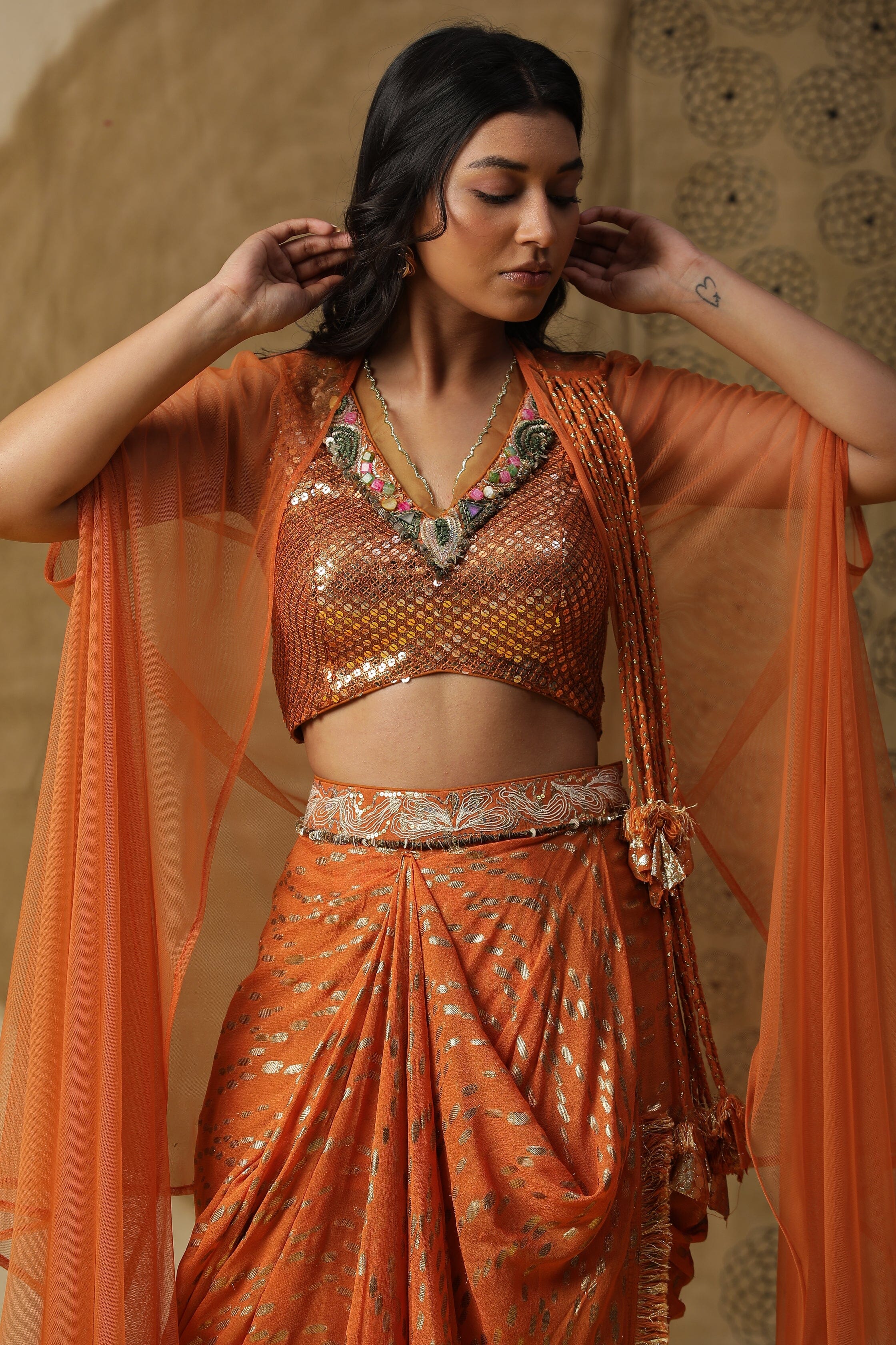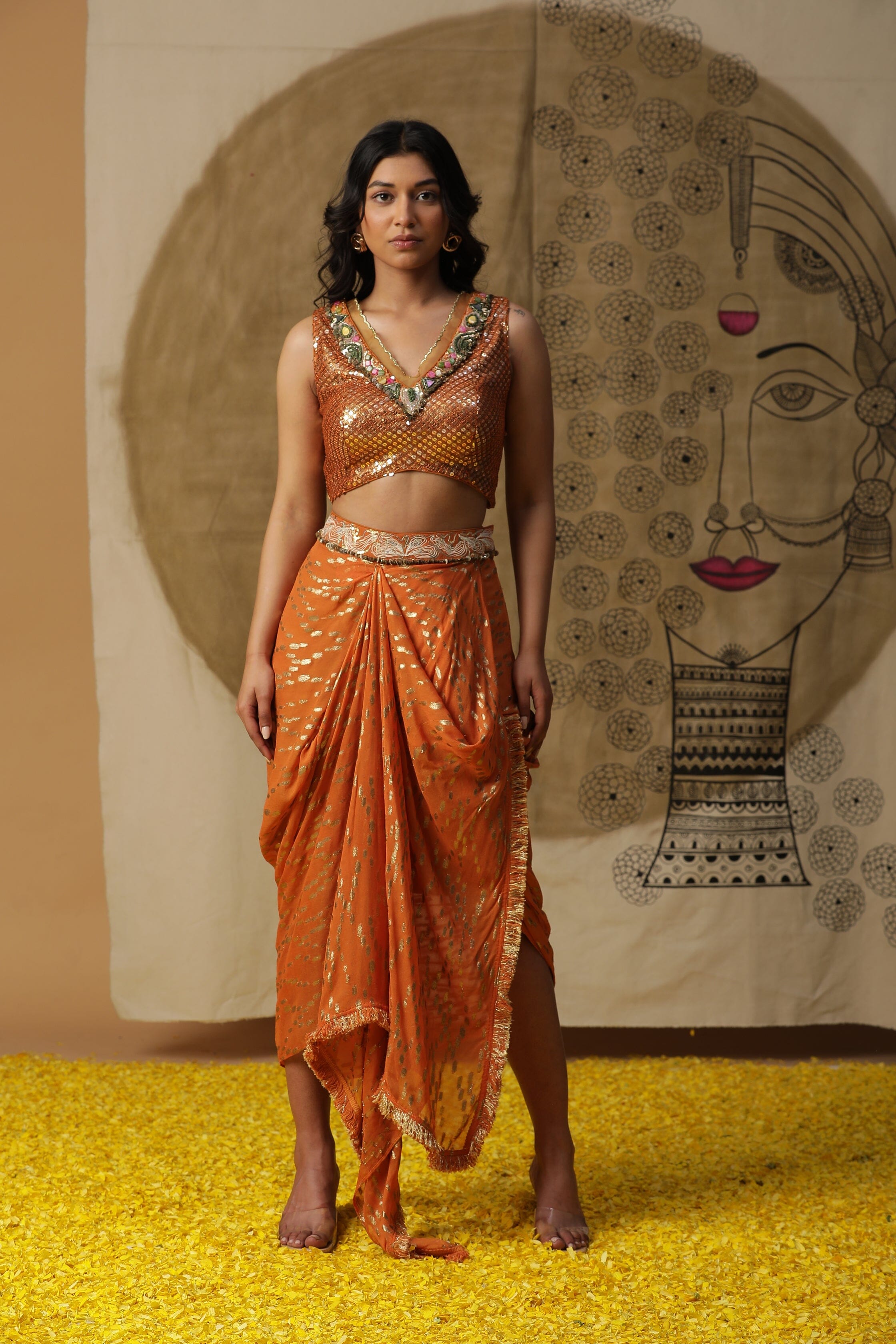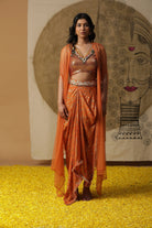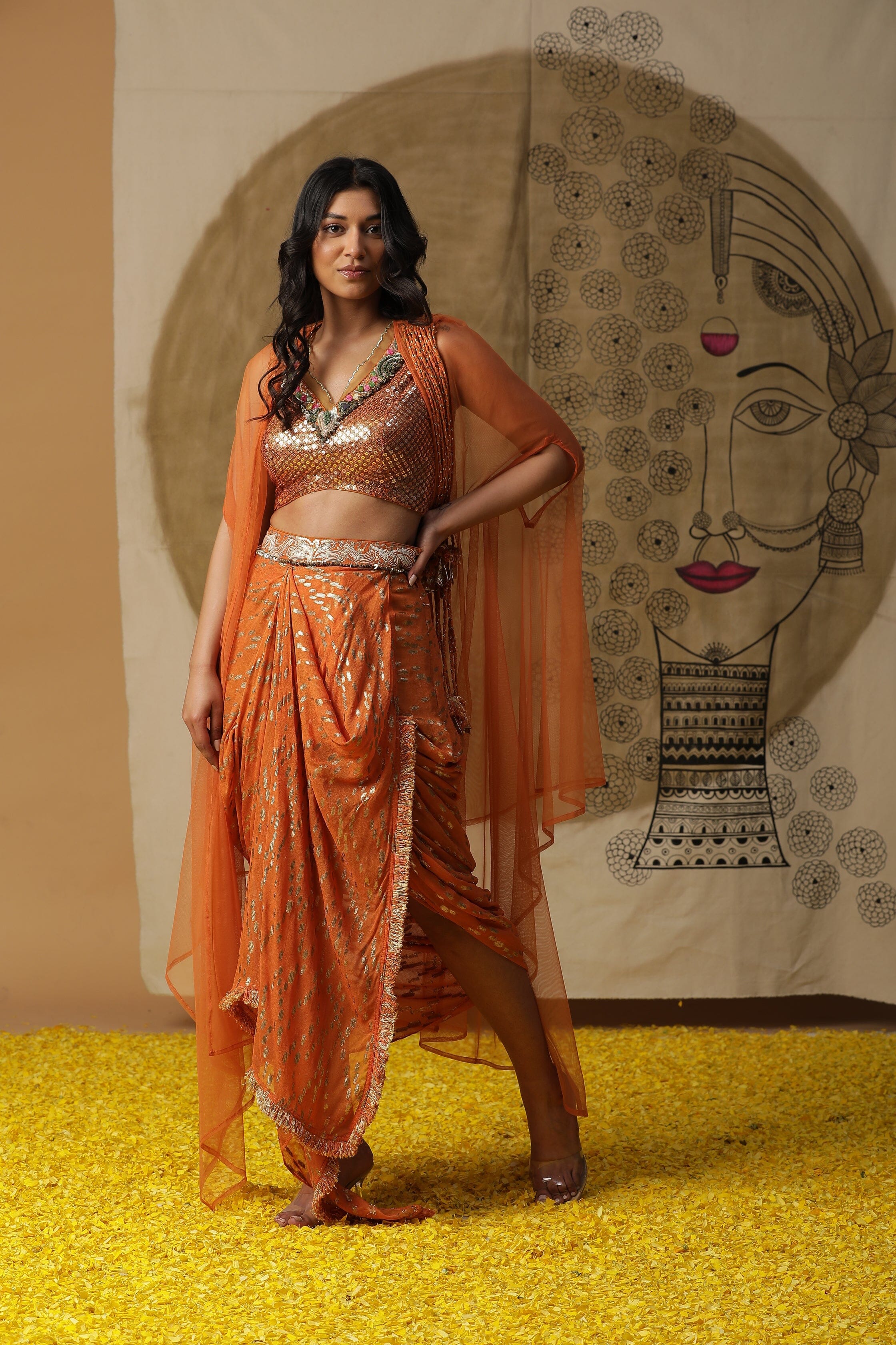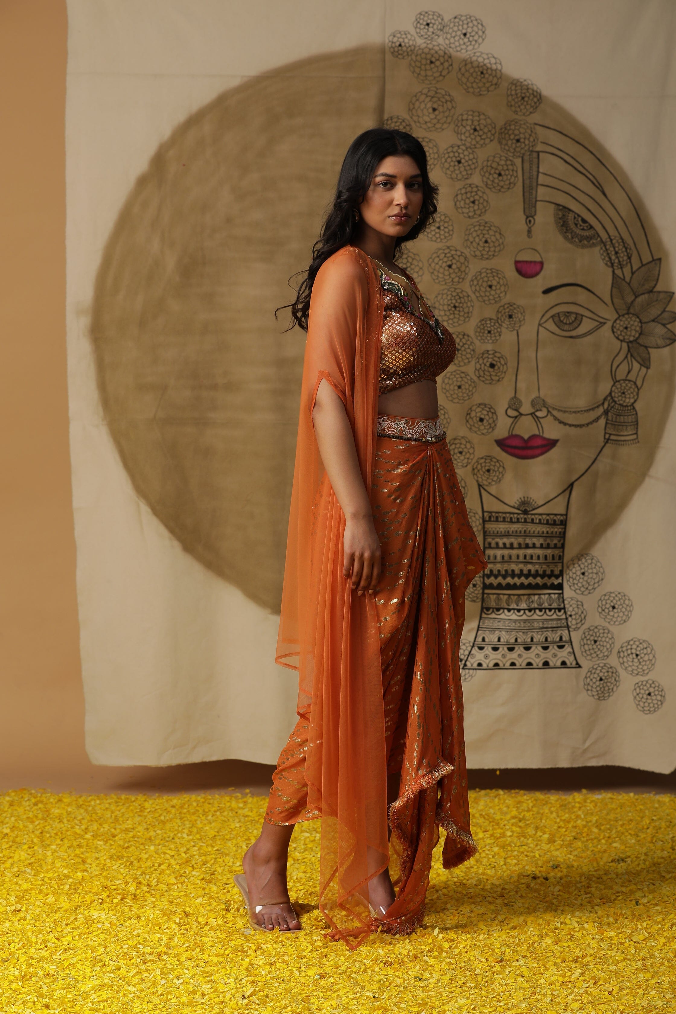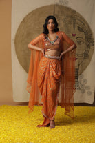 Presenta nuestro conjunto dhoti de color albaricoque con bordado a mano en el escote. Viene con una capa de georgette y un trabajo dori en el cinturón de dhoti.