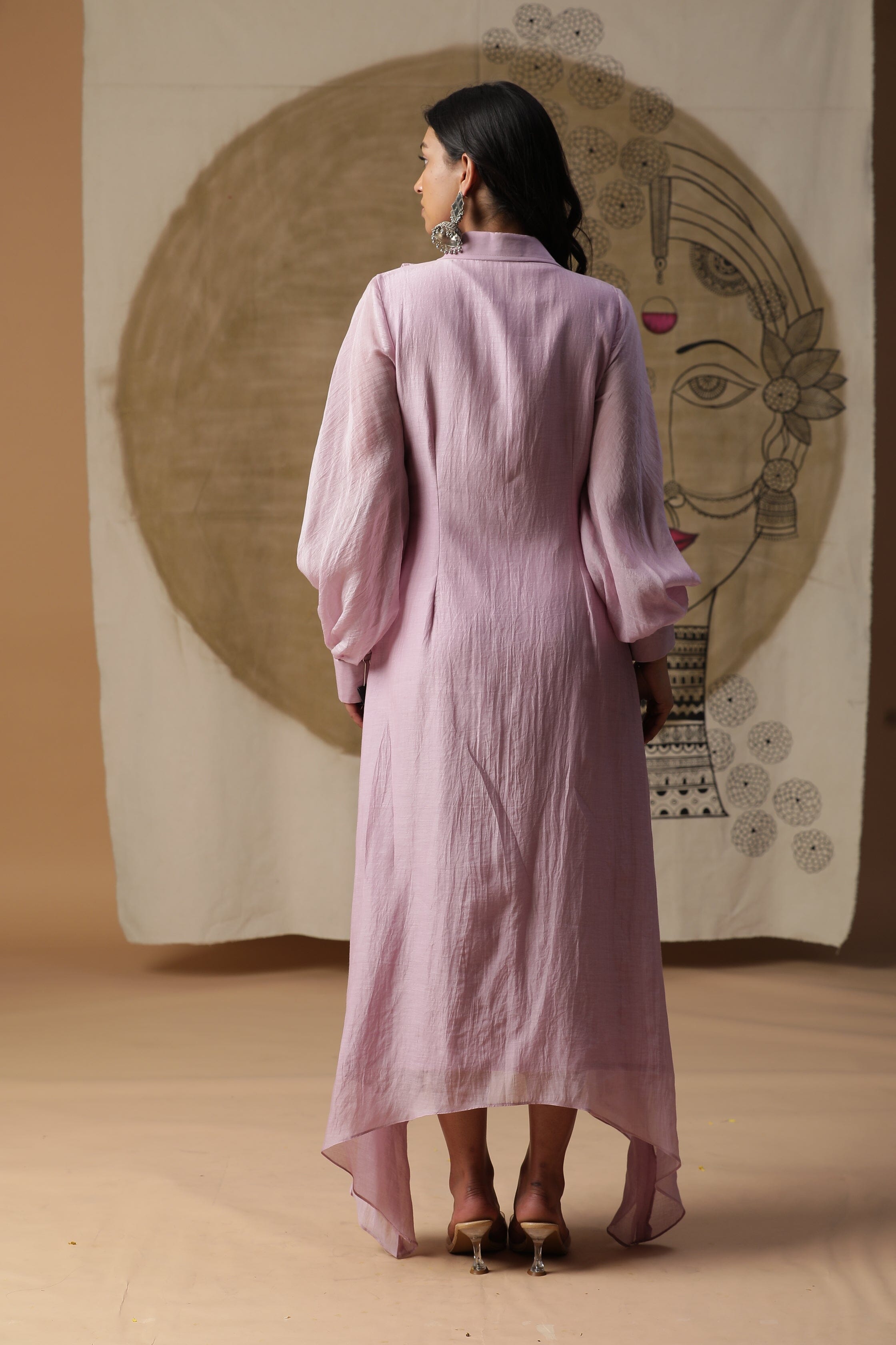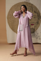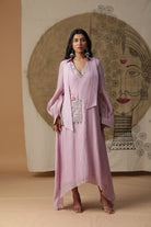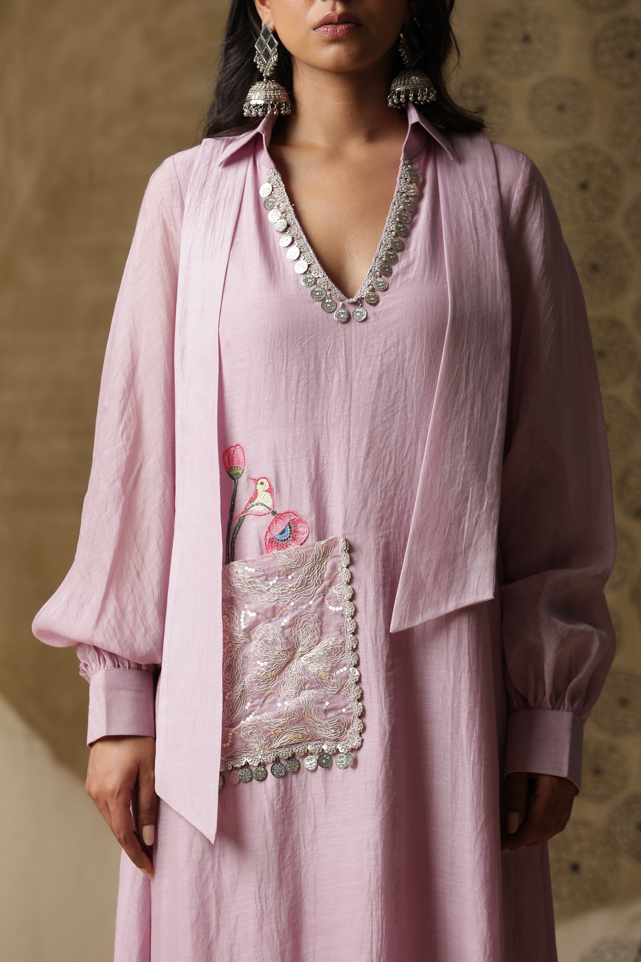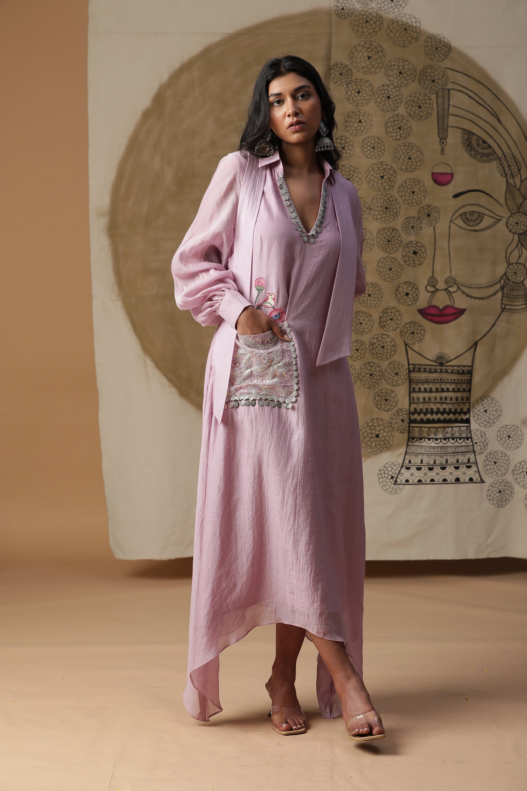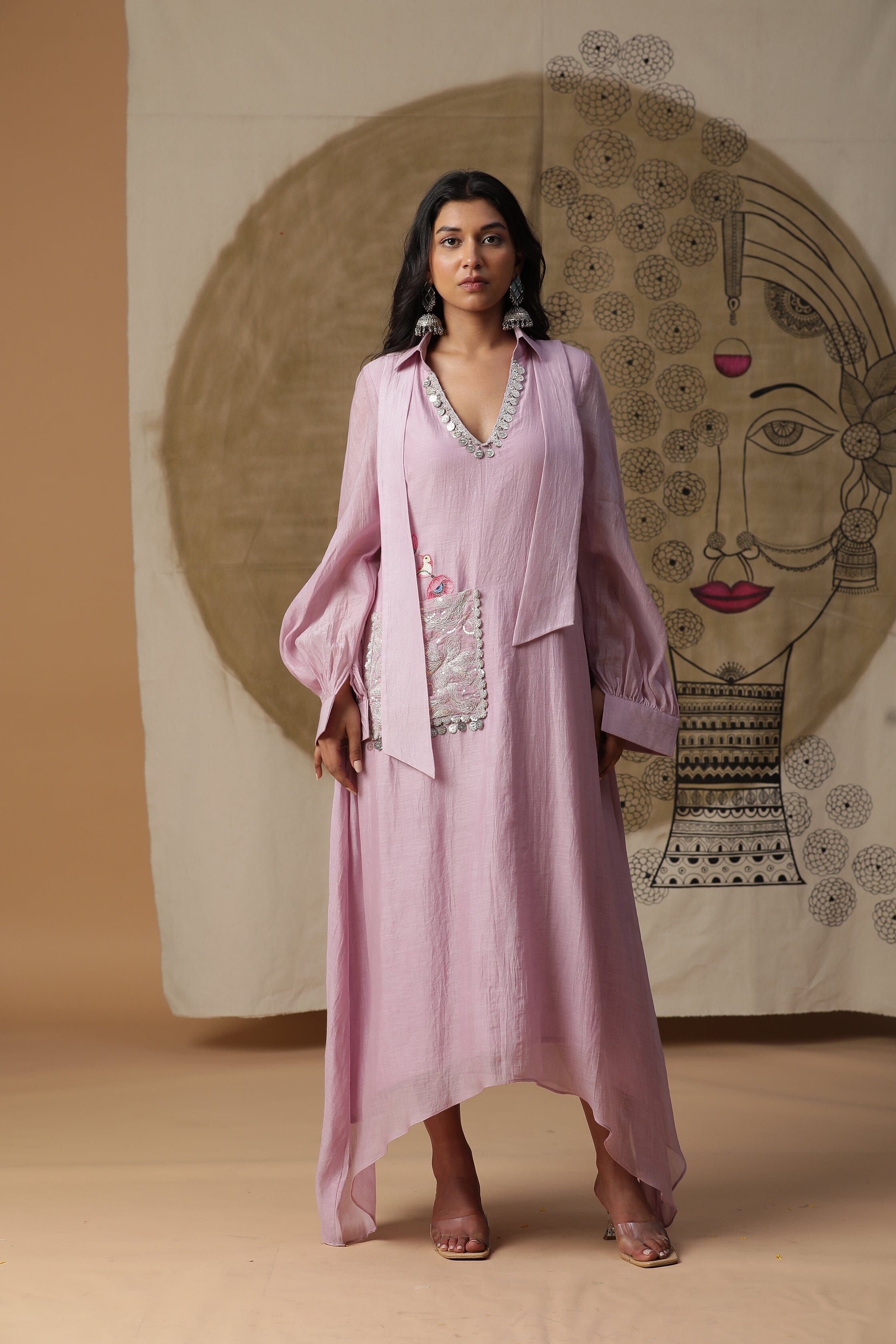 Presentamos nuestro vestido lila de corte A con mangas globo. Viene con un bolsillo pintado a mano y monedas por todo el escote.