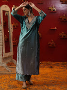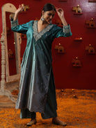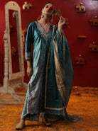 Con juego de kurta de terciopelo ombre firozi con trabajo dori. Viene con pantalones de terciopelo y dupatta de organza pintada a mano.