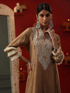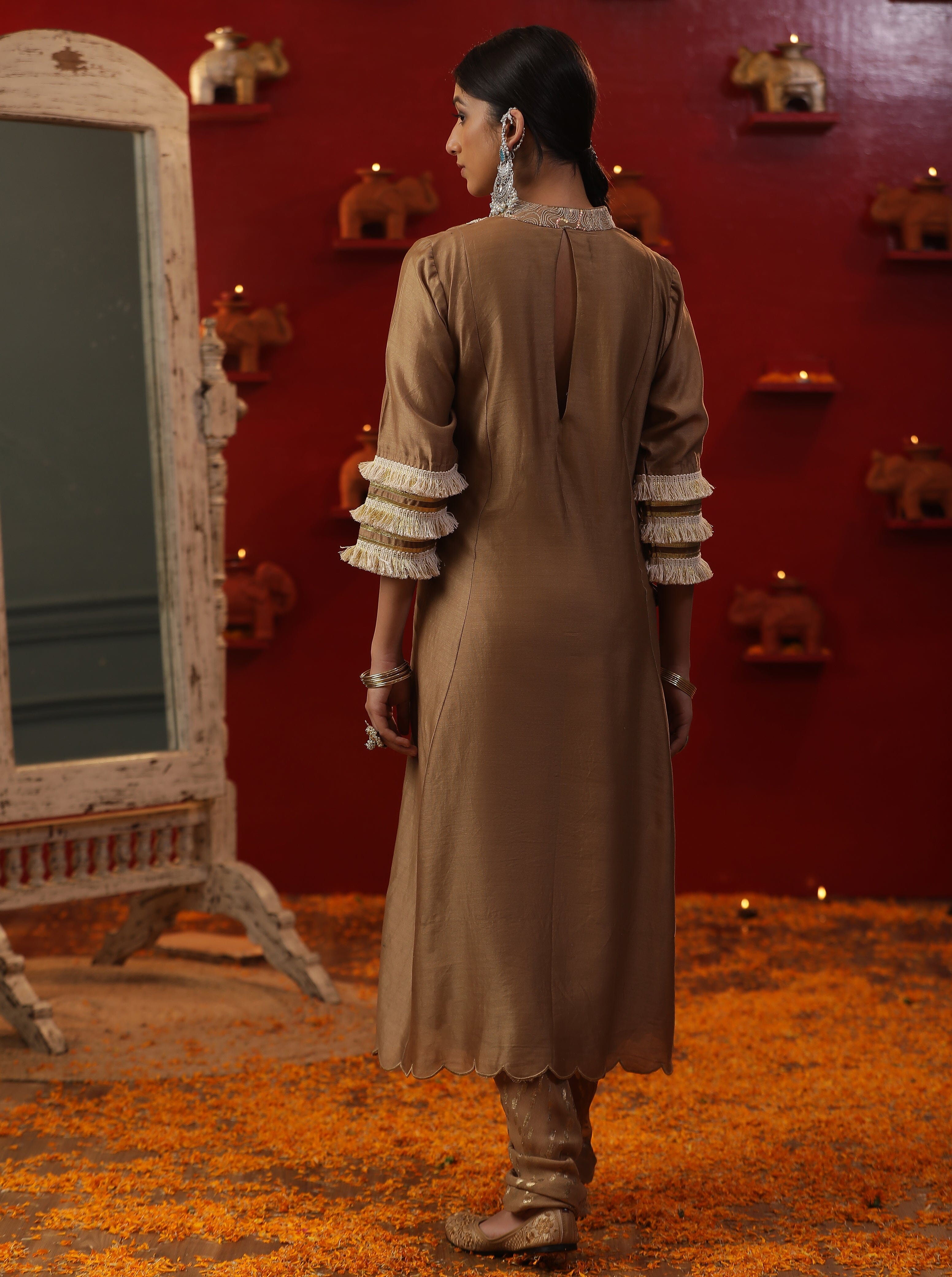 Con juego de kurta de seda chanderi dorado. Viene con dupatta y chuddidar pintados a mano.