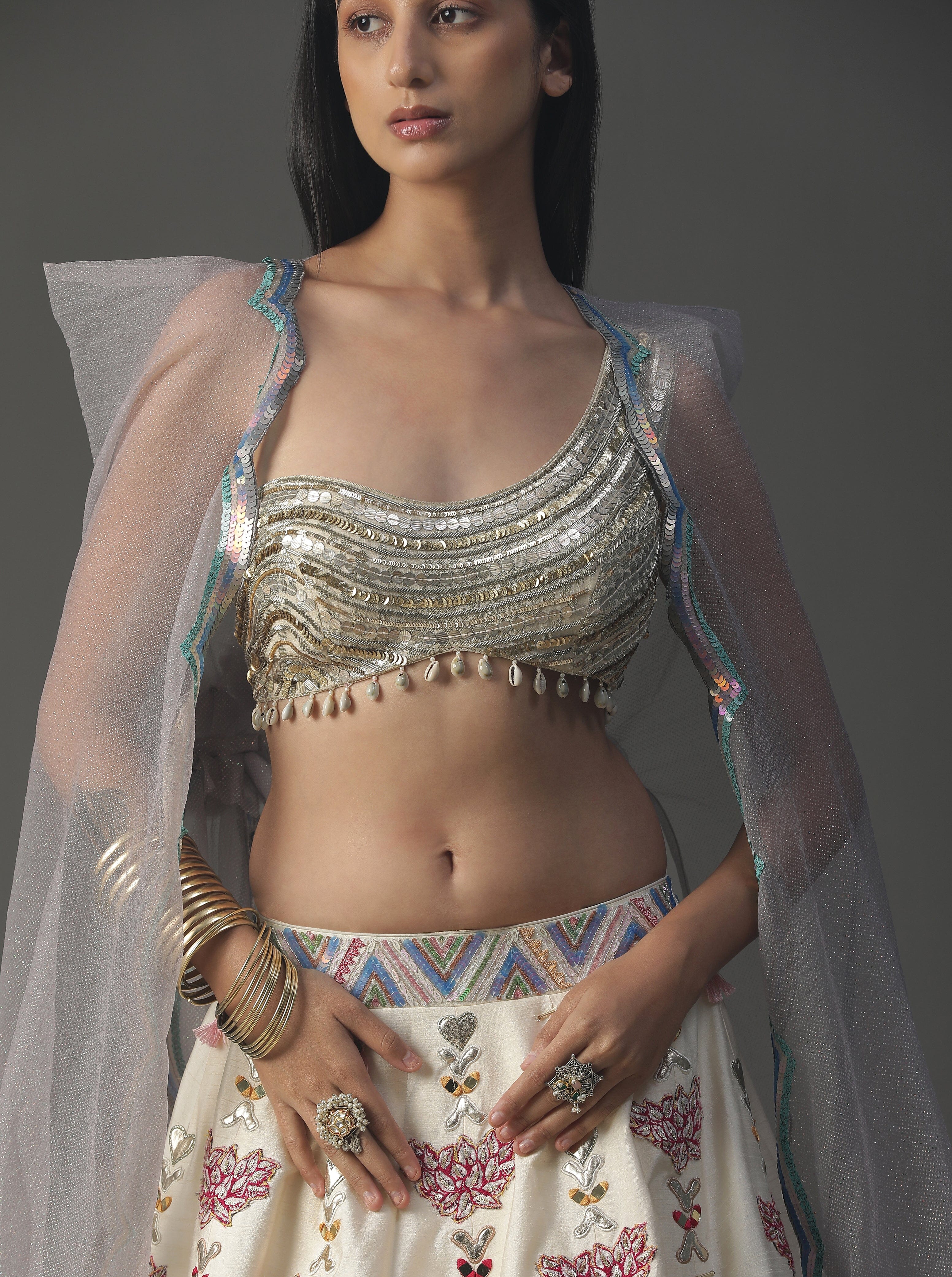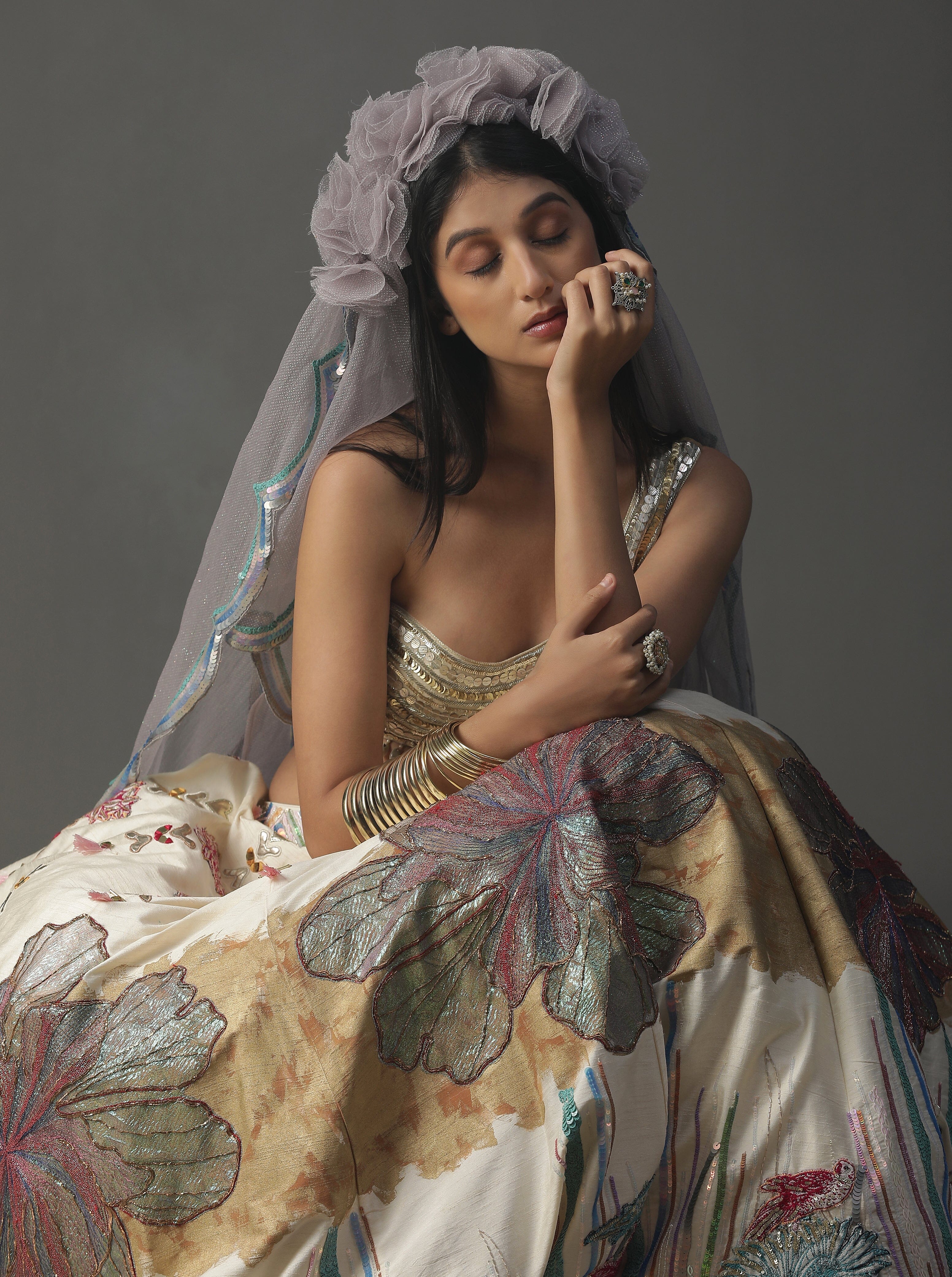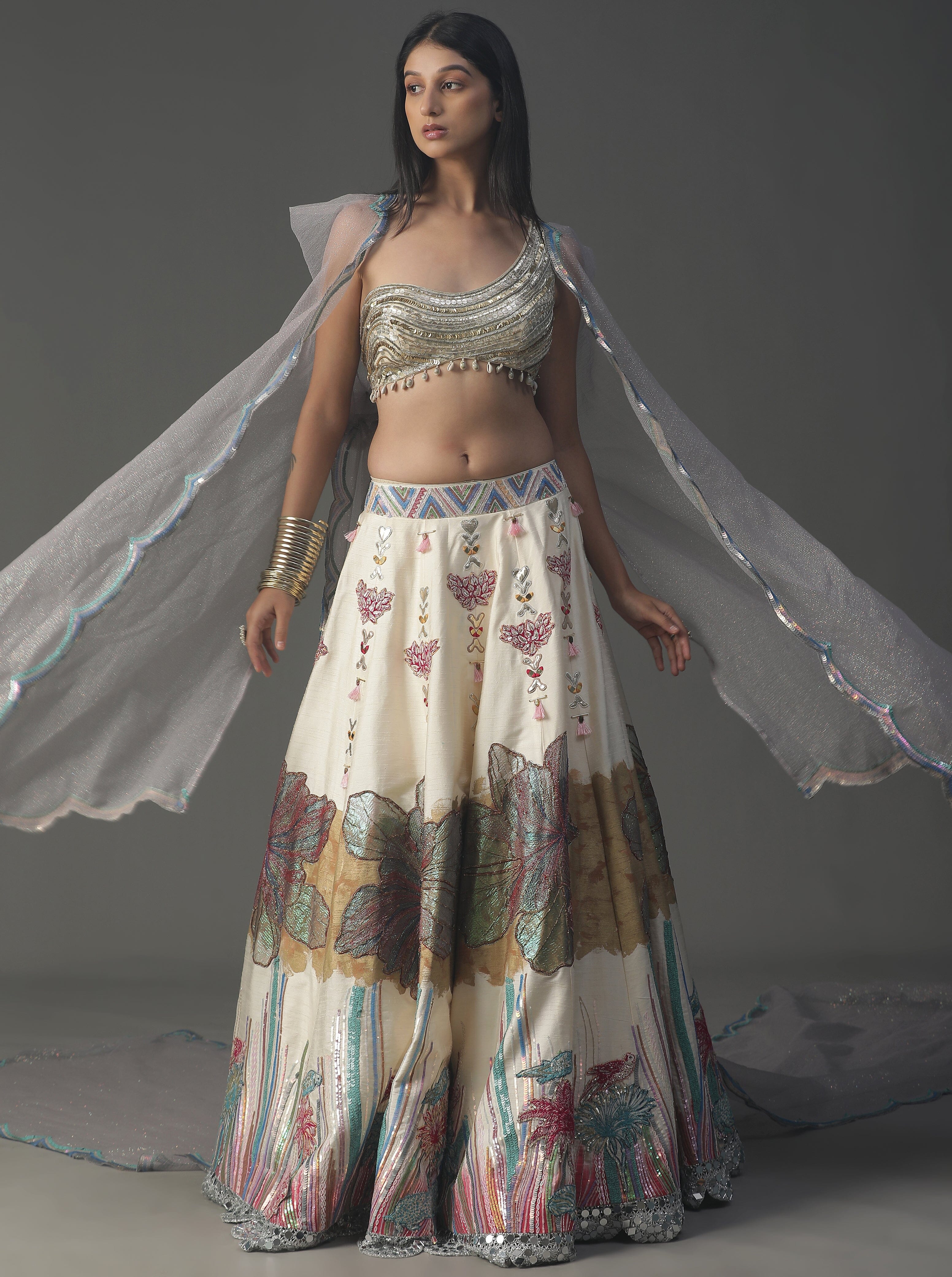 El conjunto perfecto para llamar la atención en cualquier evento formal. Confeccionado con intrincados detalles pintados a mano, lentejuelas brillantes y una delicada capa festoneada. Este diseño atemporal está rematado con un lujoso forro verde oliva.