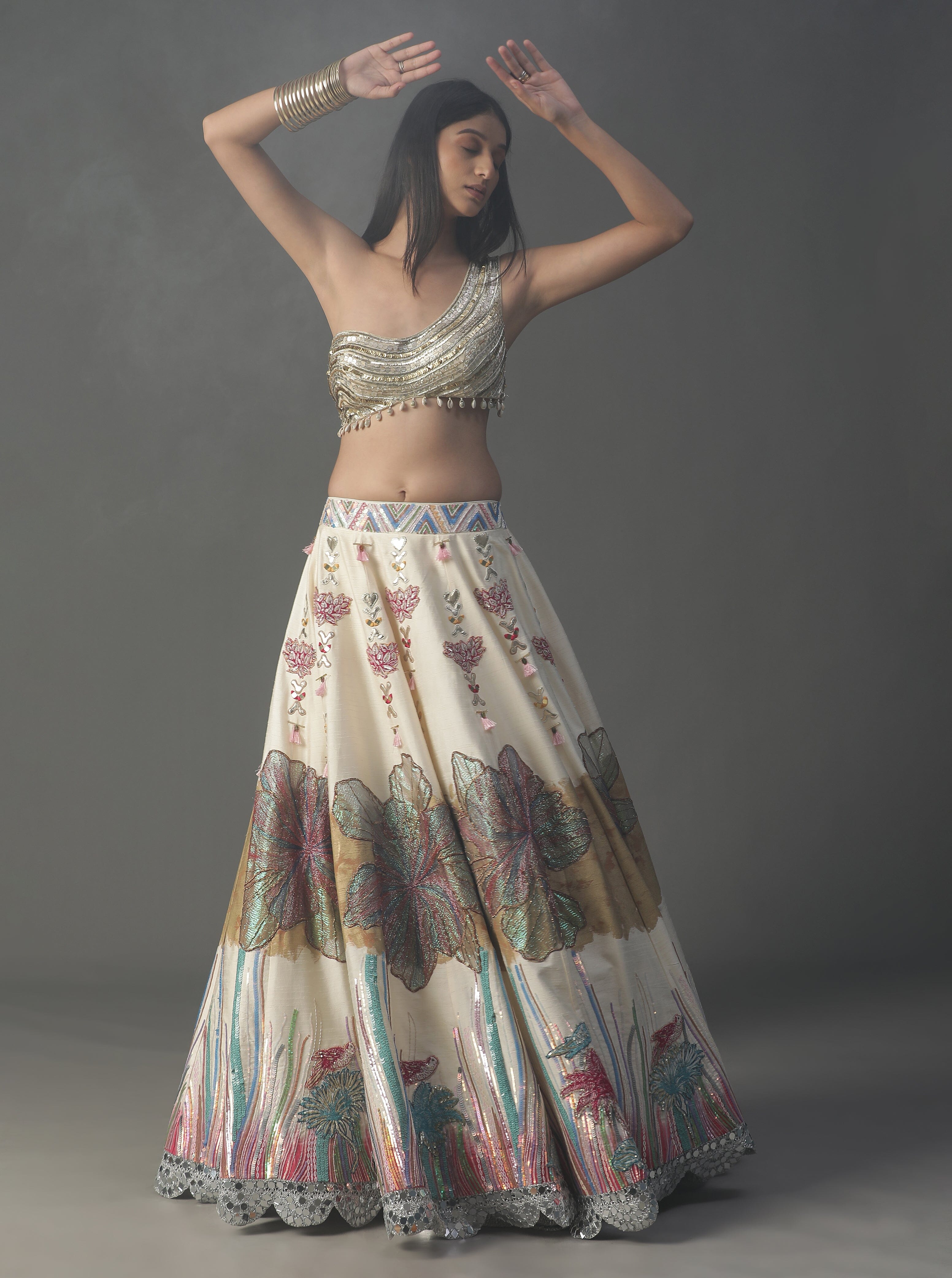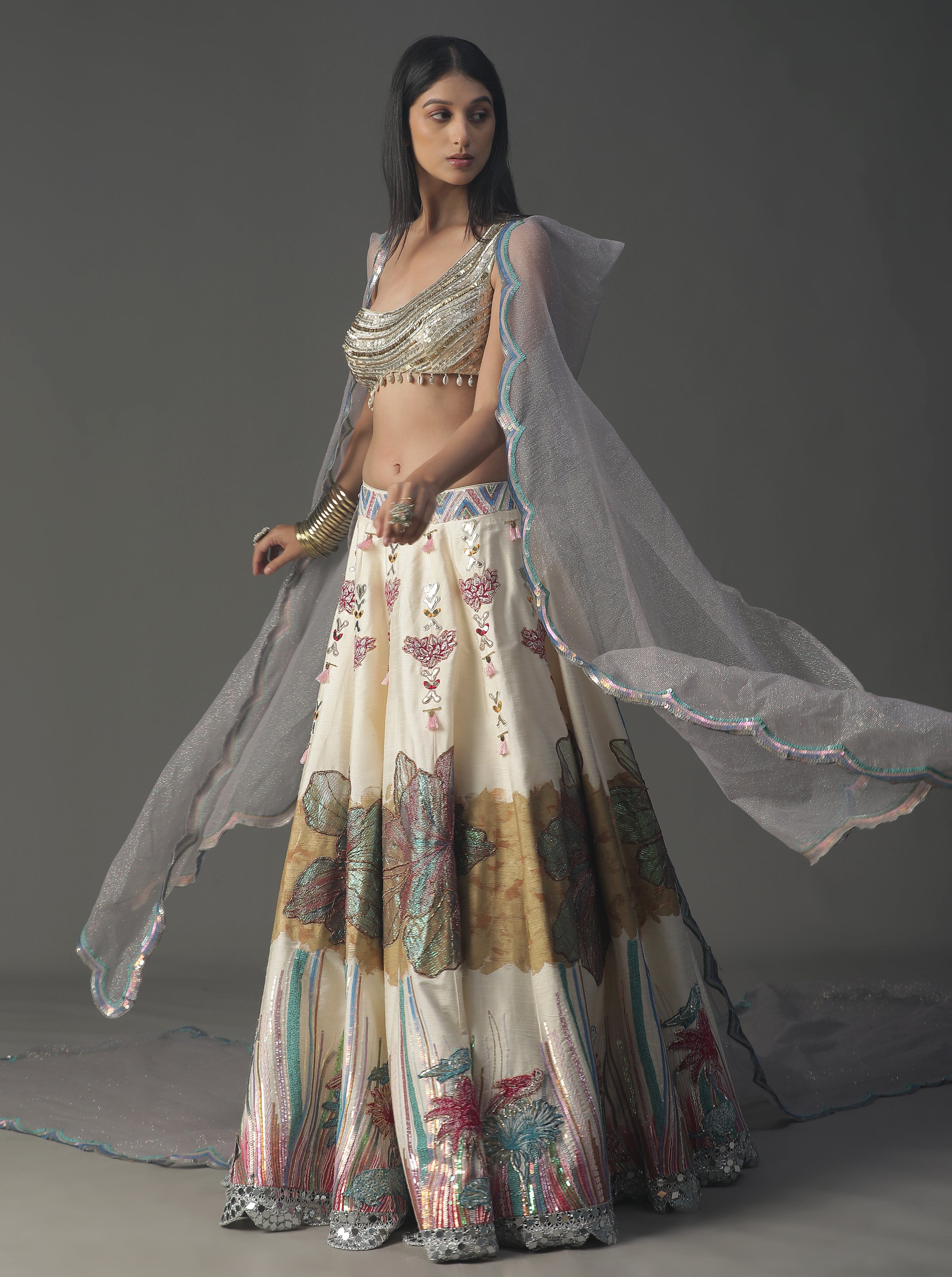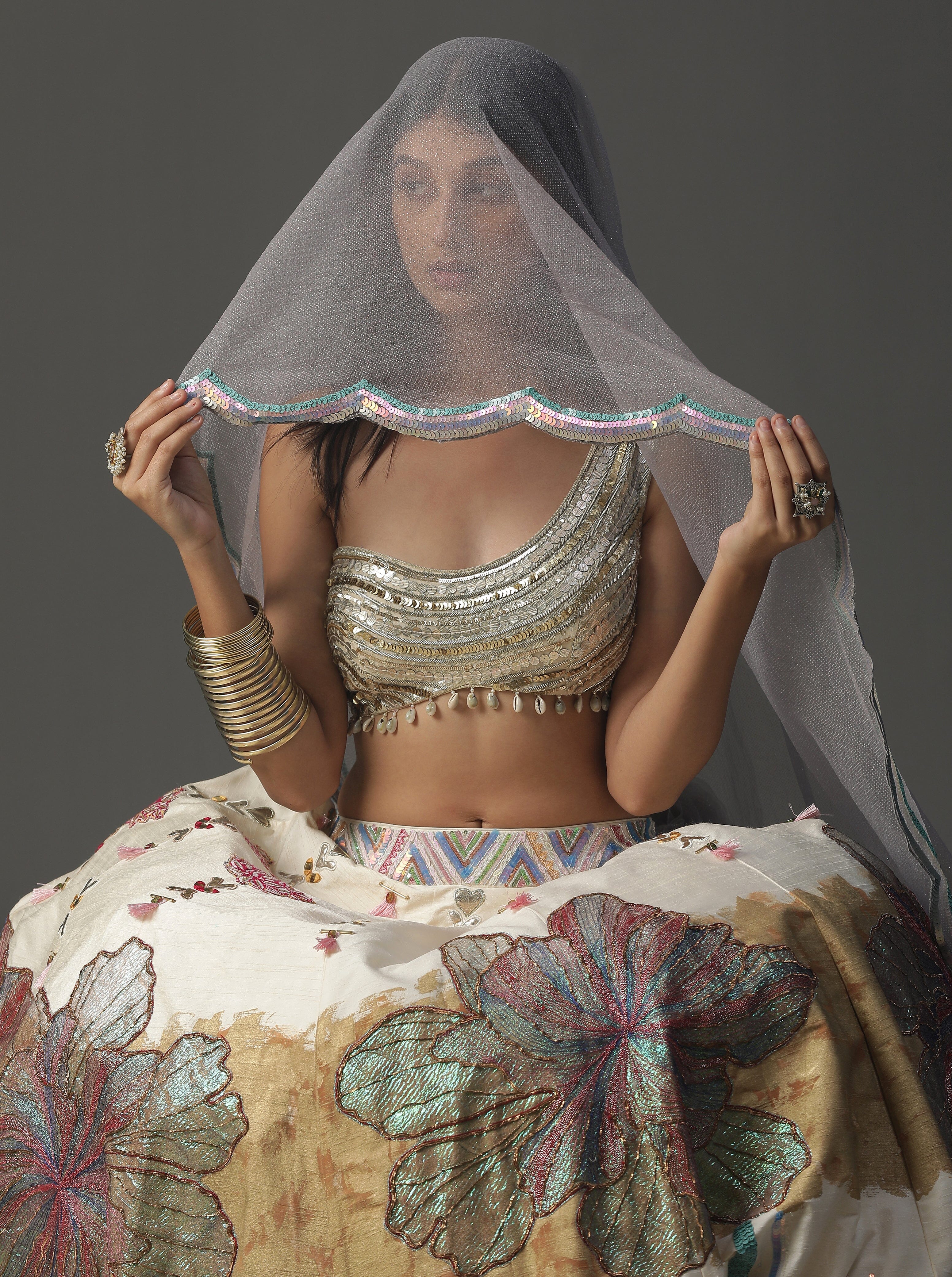 El conjunto perfecto para llamar la atención en cualquier evento formal. Confeccionado con intrincados detalles pintados a mano, lentejuelas brillantes y una delicada capa festoneada. Este diseño atemporal está rematado con un lujoso forro verde oliva.