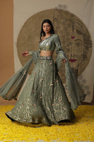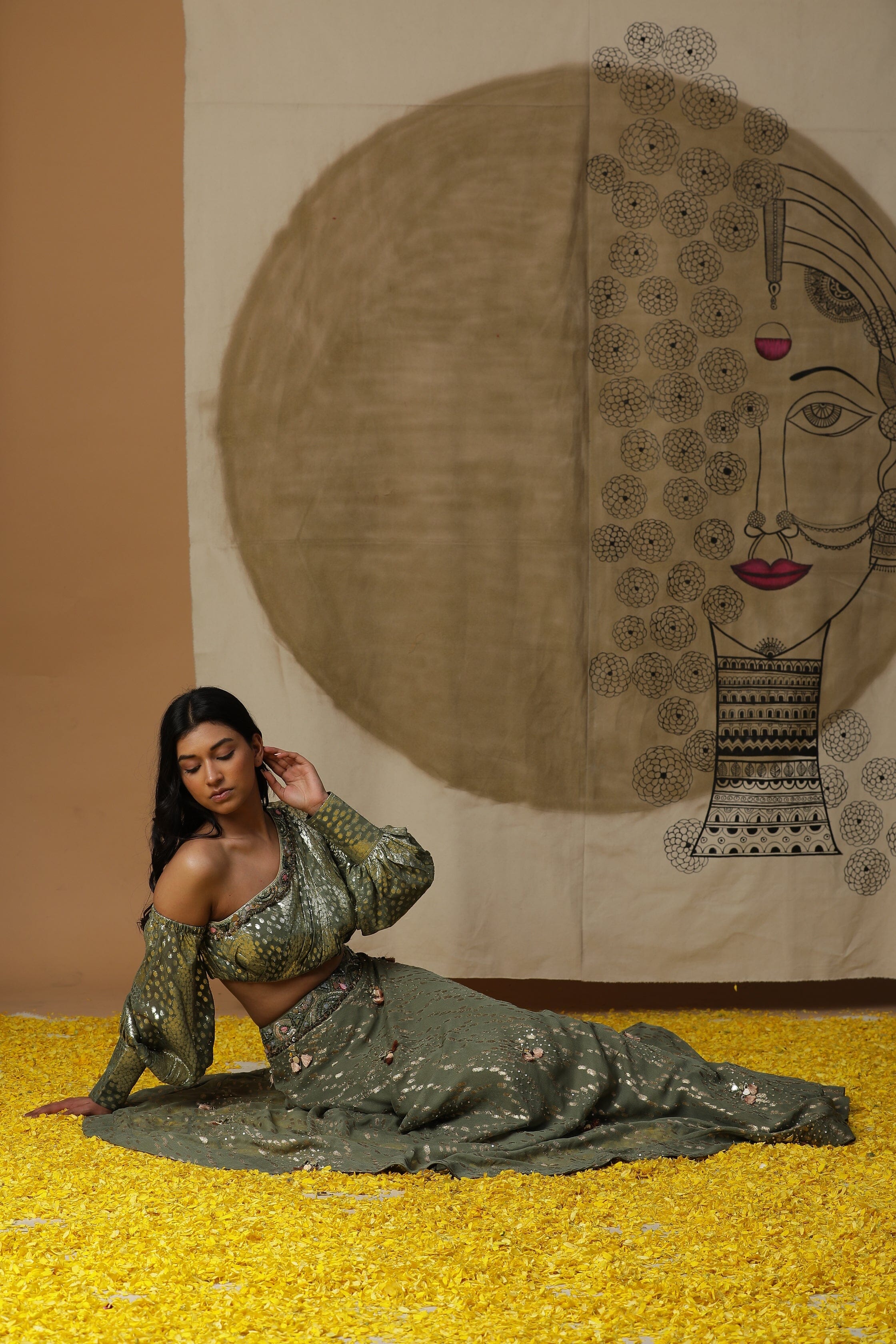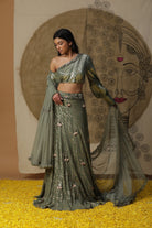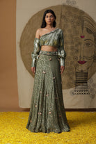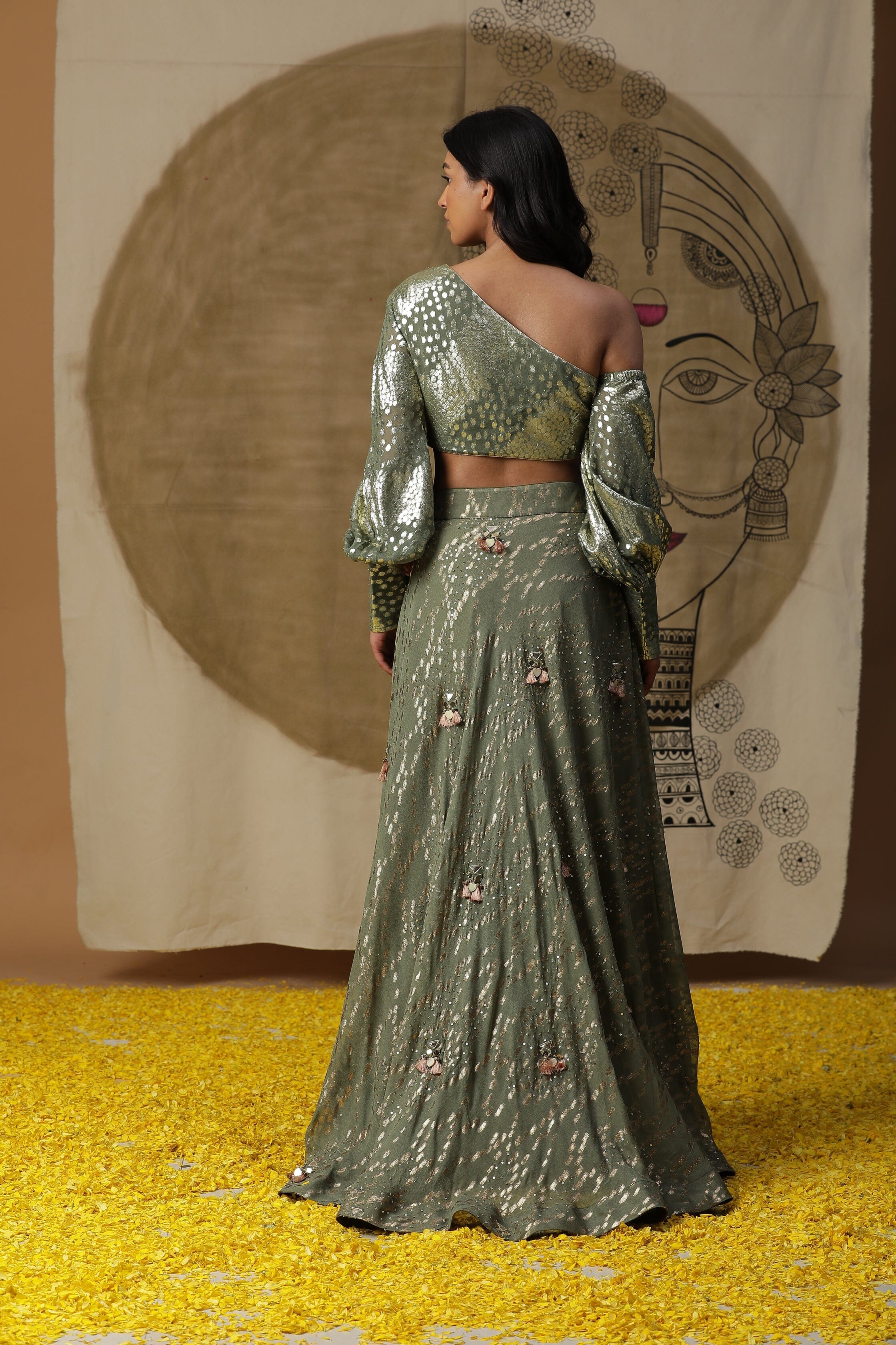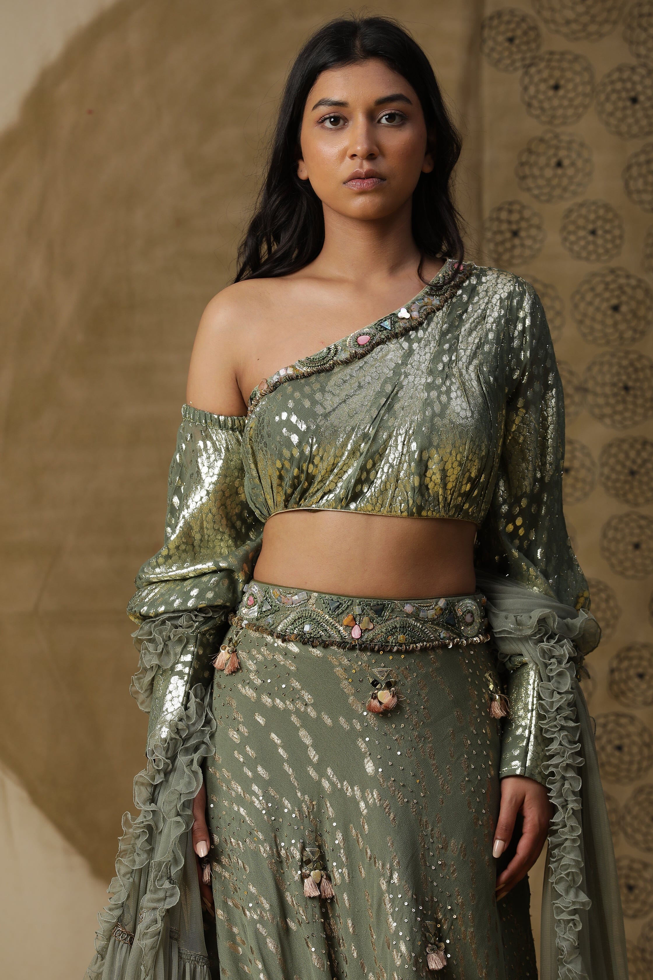 Con conjunto de falda verde pista. Viene con blusa de un hombro y dupatta de red con volantes.