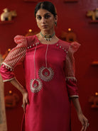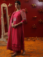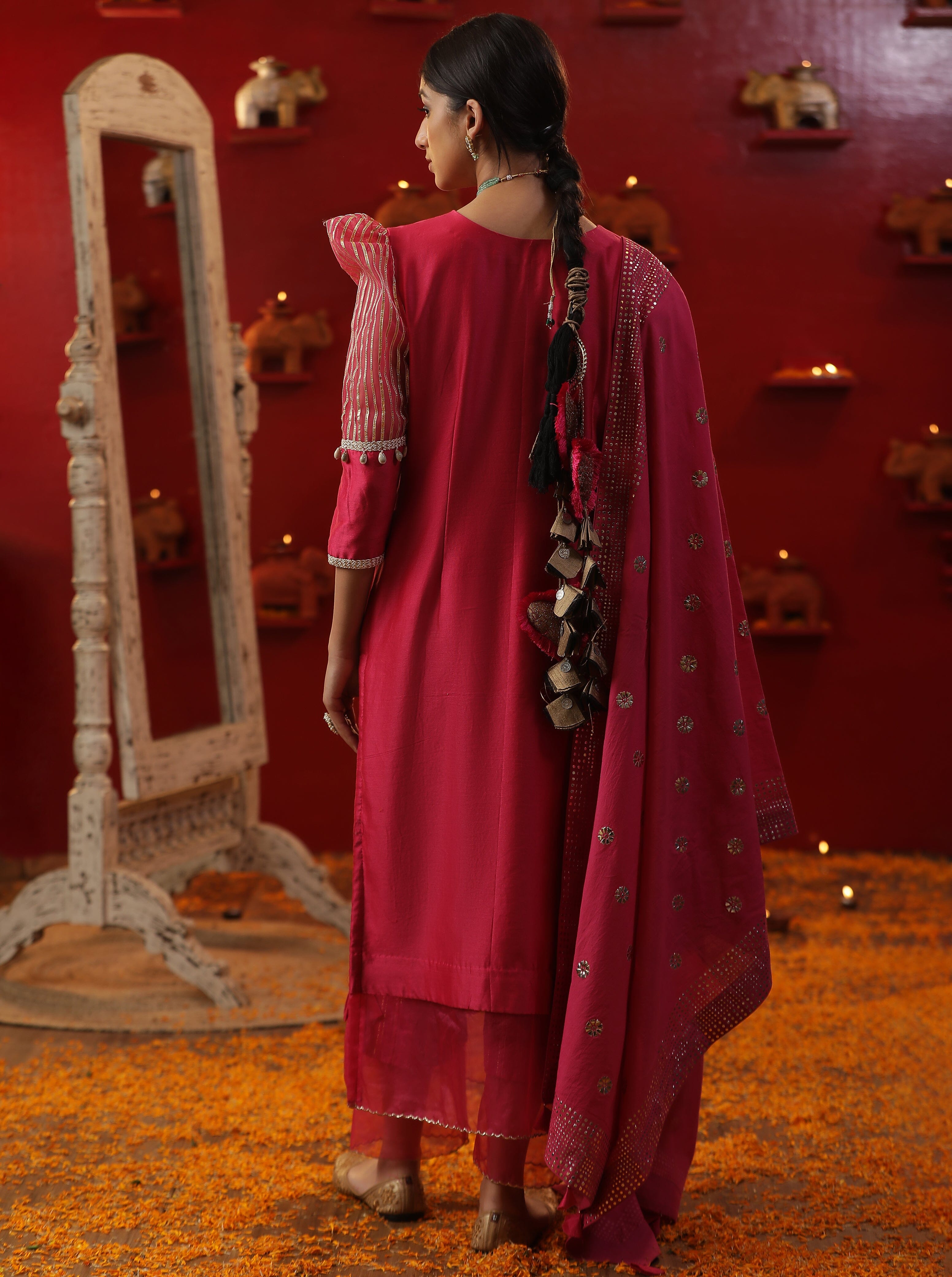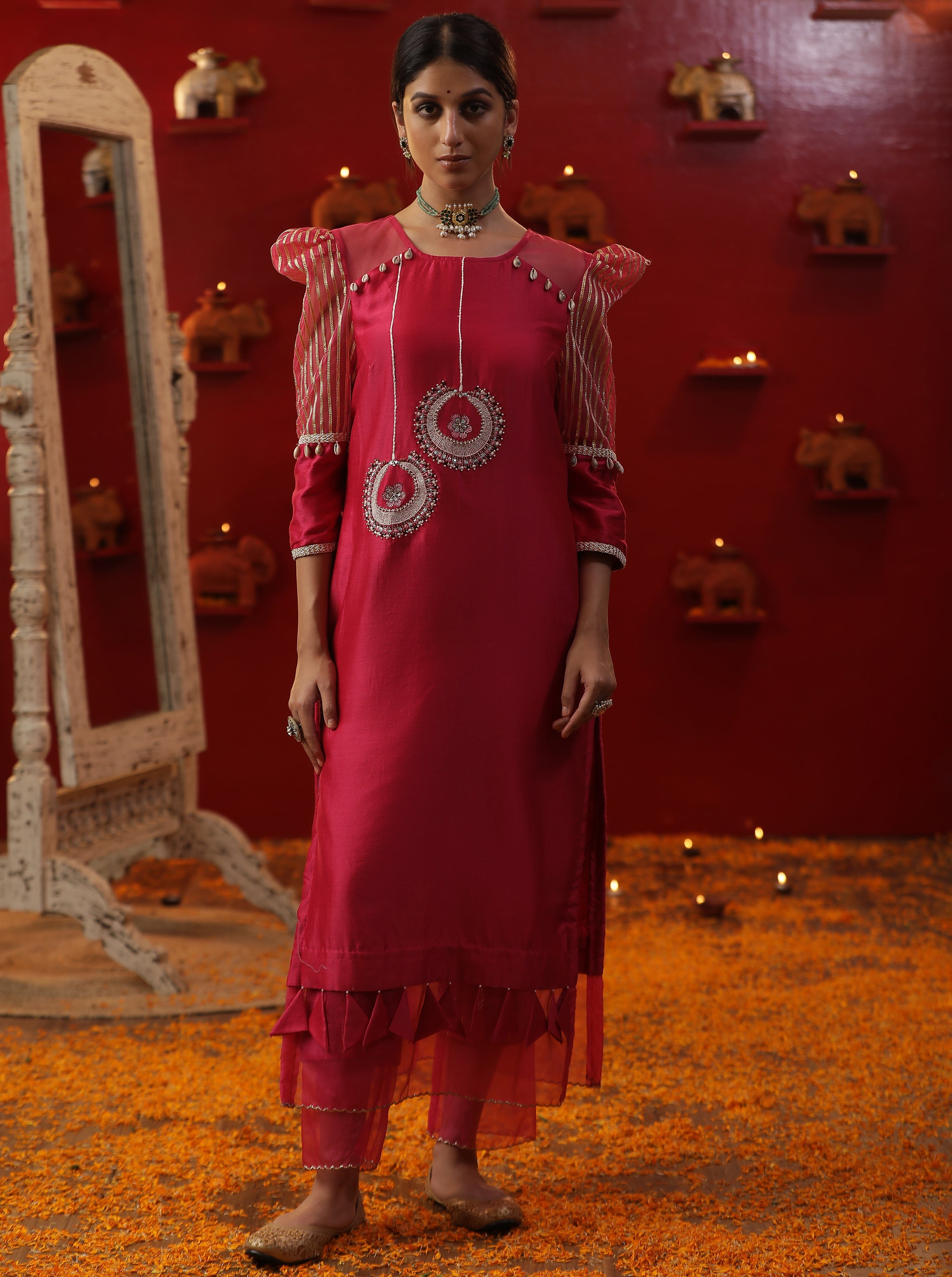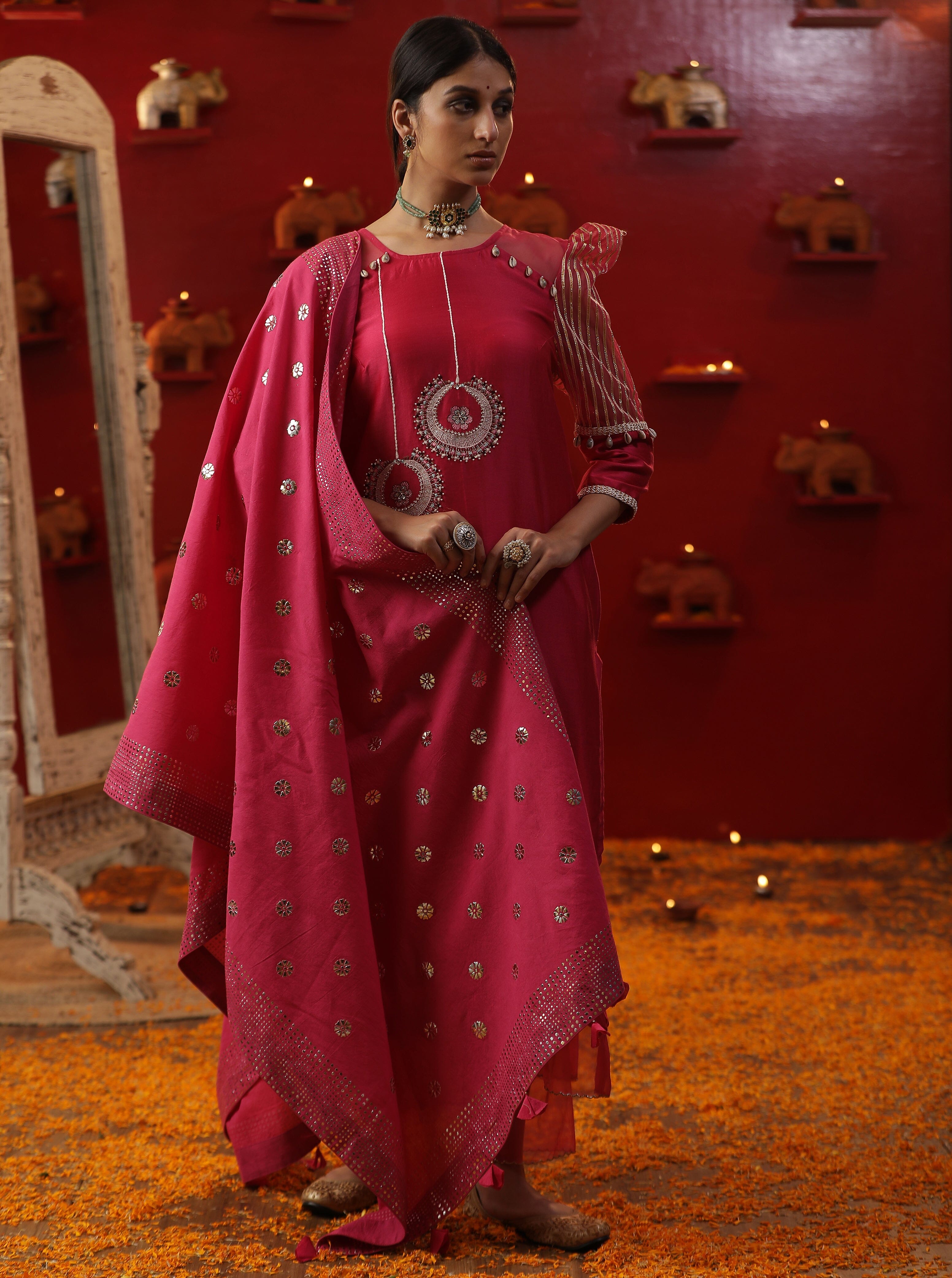 con conjunto de kurta de seda chanderi. Viene con pantalones de lurex y patra dupatta.