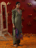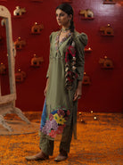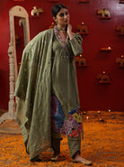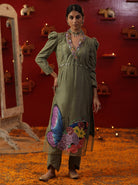 Con una kurta verde pista pintada a mano. Viene con patra dupatta y pantalón de lurex.