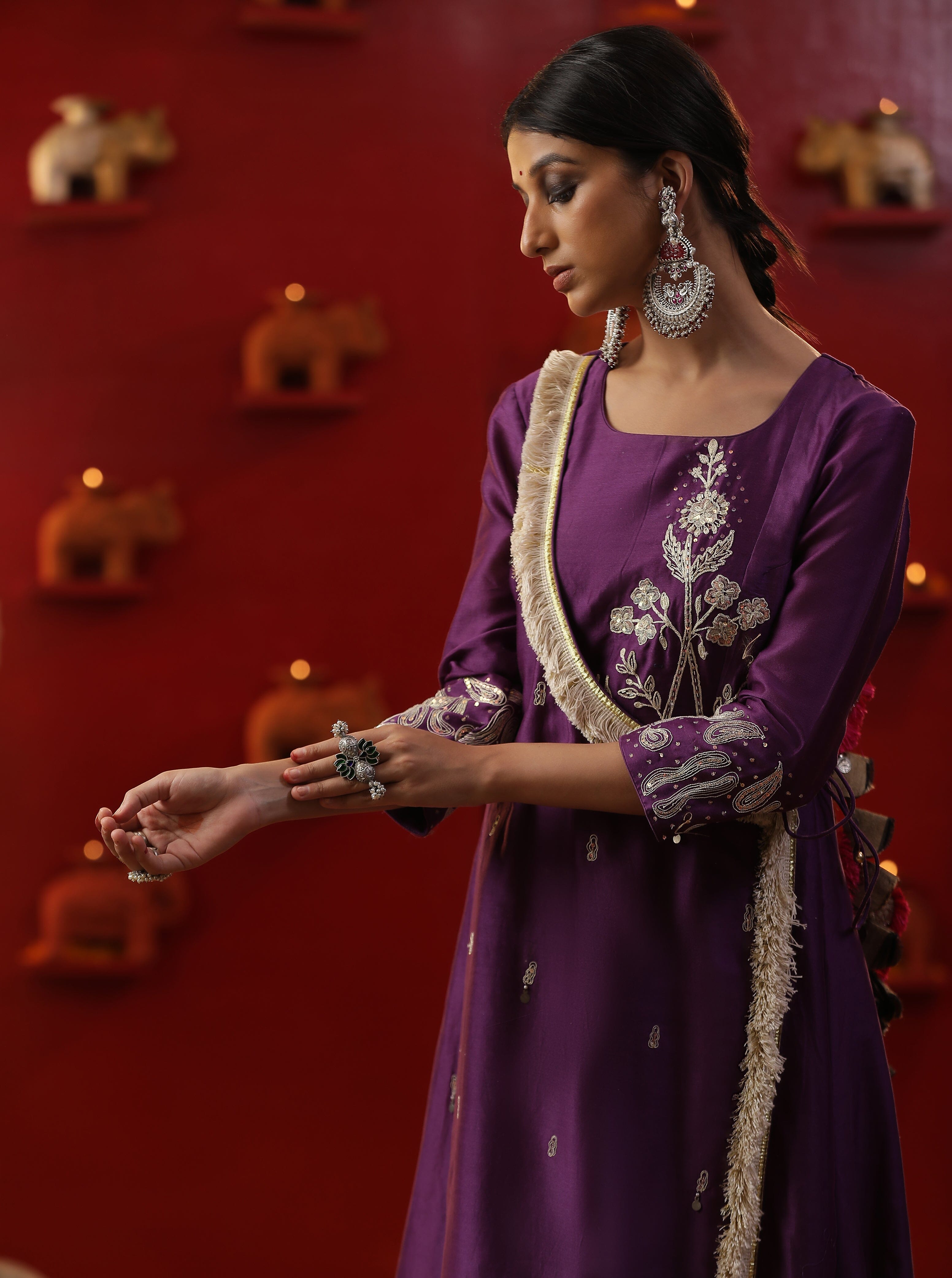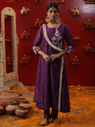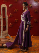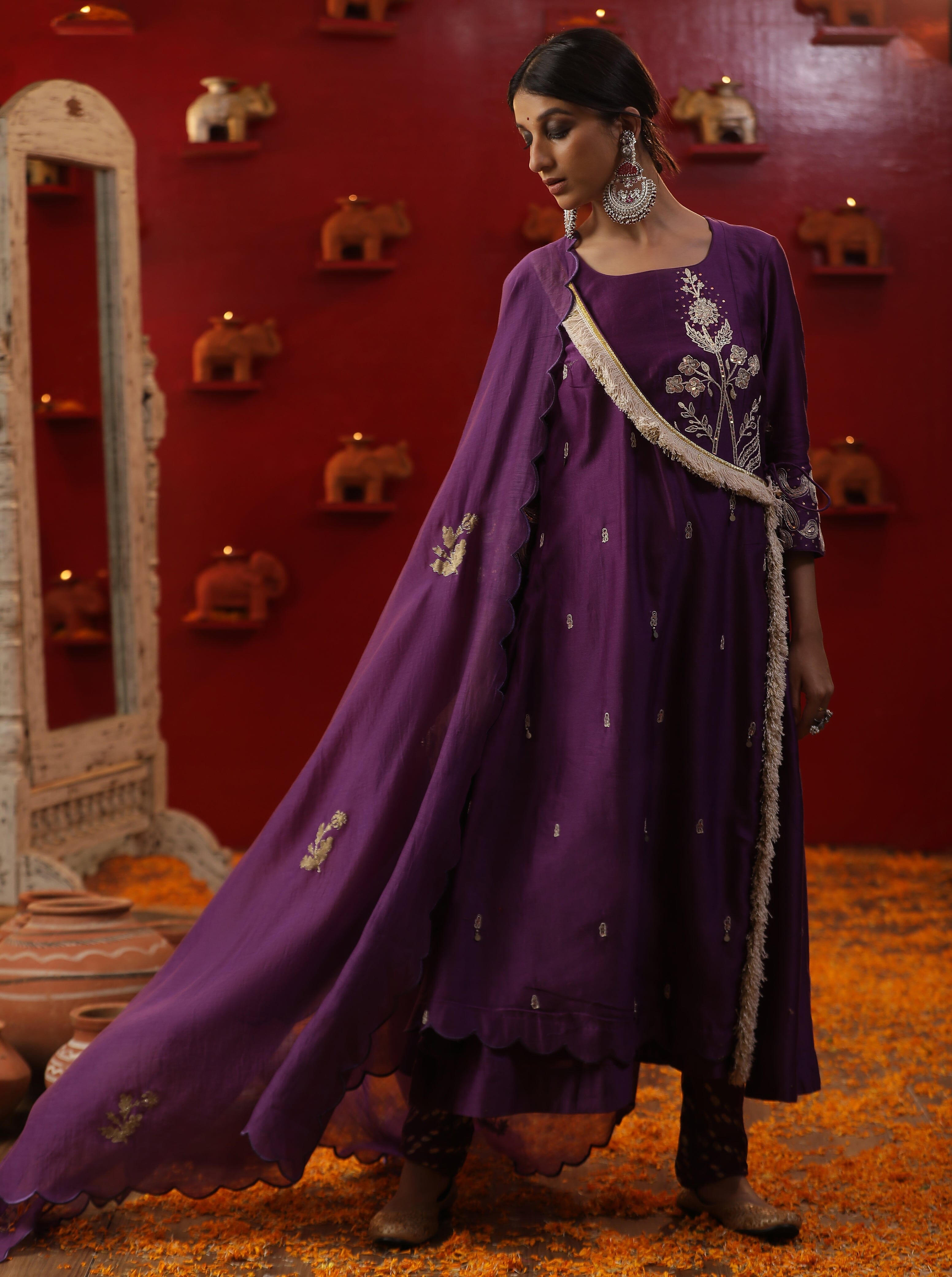 con traje morado de línea A con trabajo dori. Viene con chanderi dupatta y gorgette chuddidar.