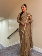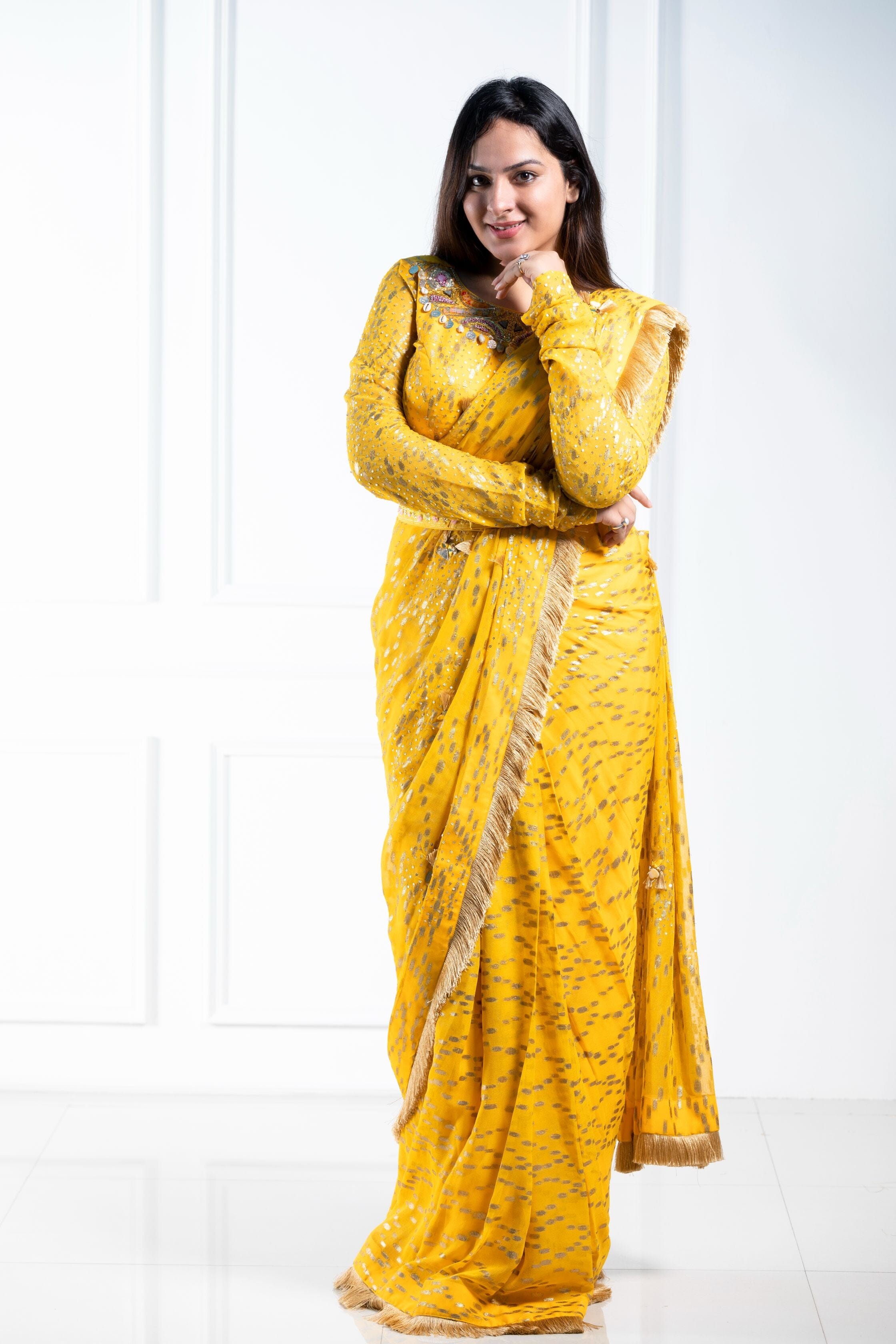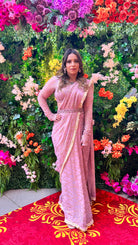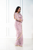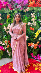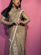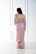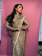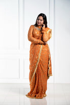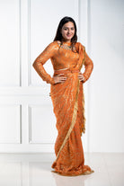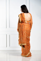 Elegantemente confeccionado con tela georgette con un lujoso estampado dorado, este sari drapeado está adornado con lentejuelas y detalles de yute en los bordes, mostrando una hebilla de yute ajustable en la blusa. Una pieza exquisita disponible en cuatro preciosos colores.