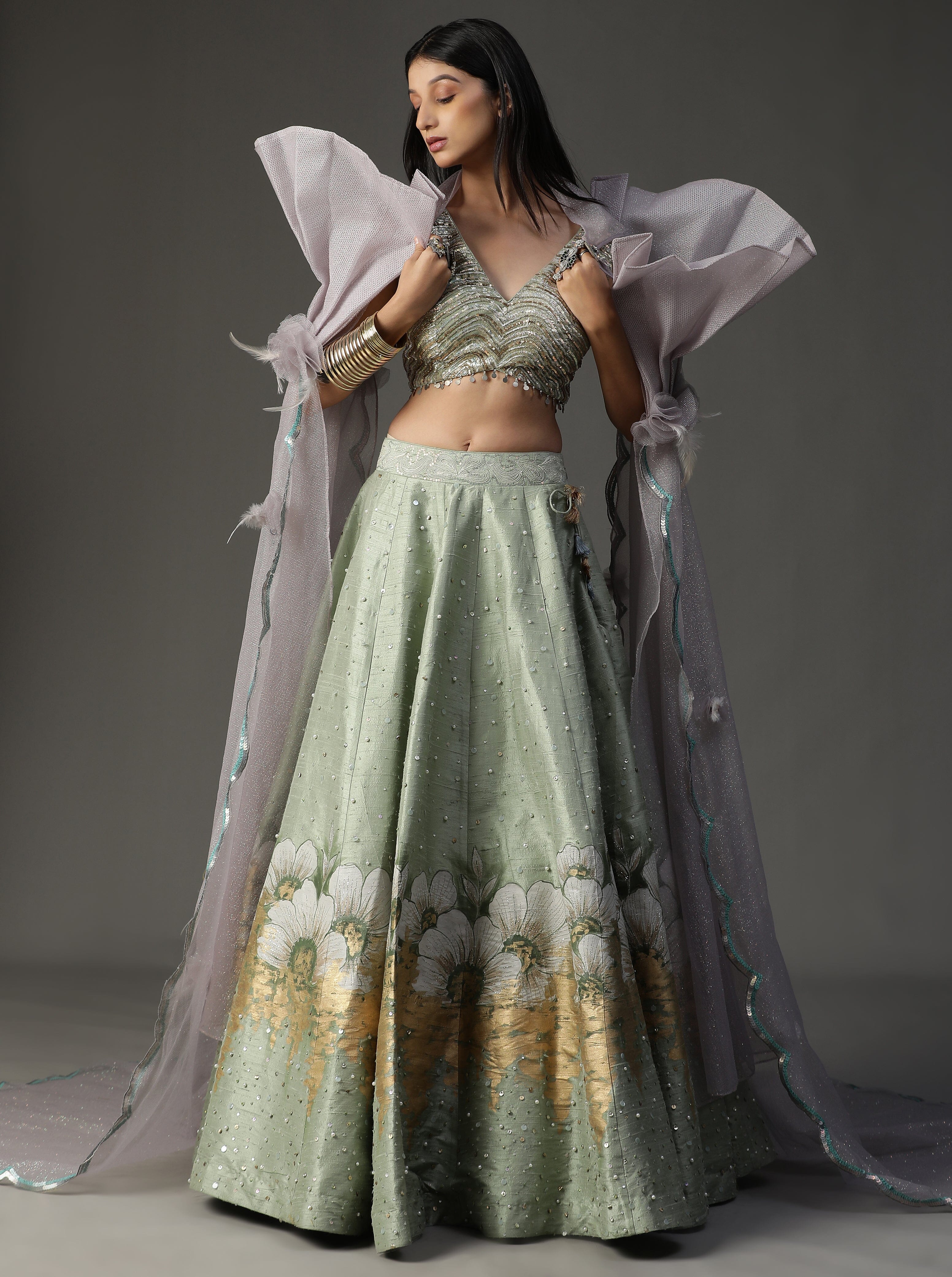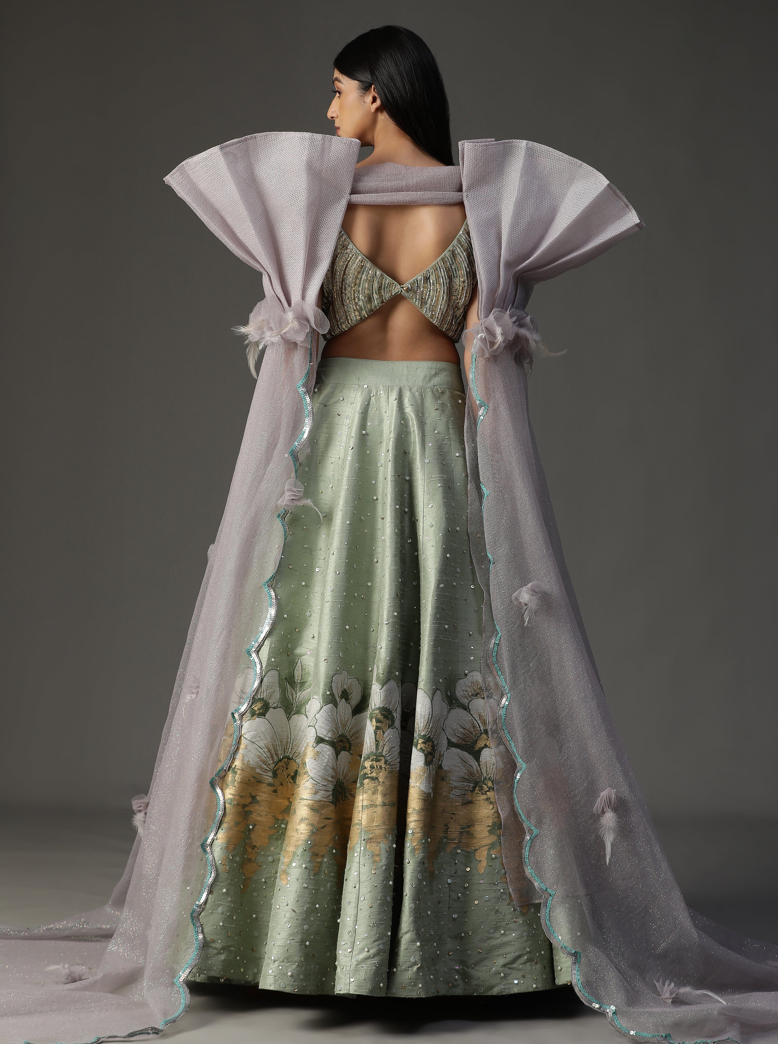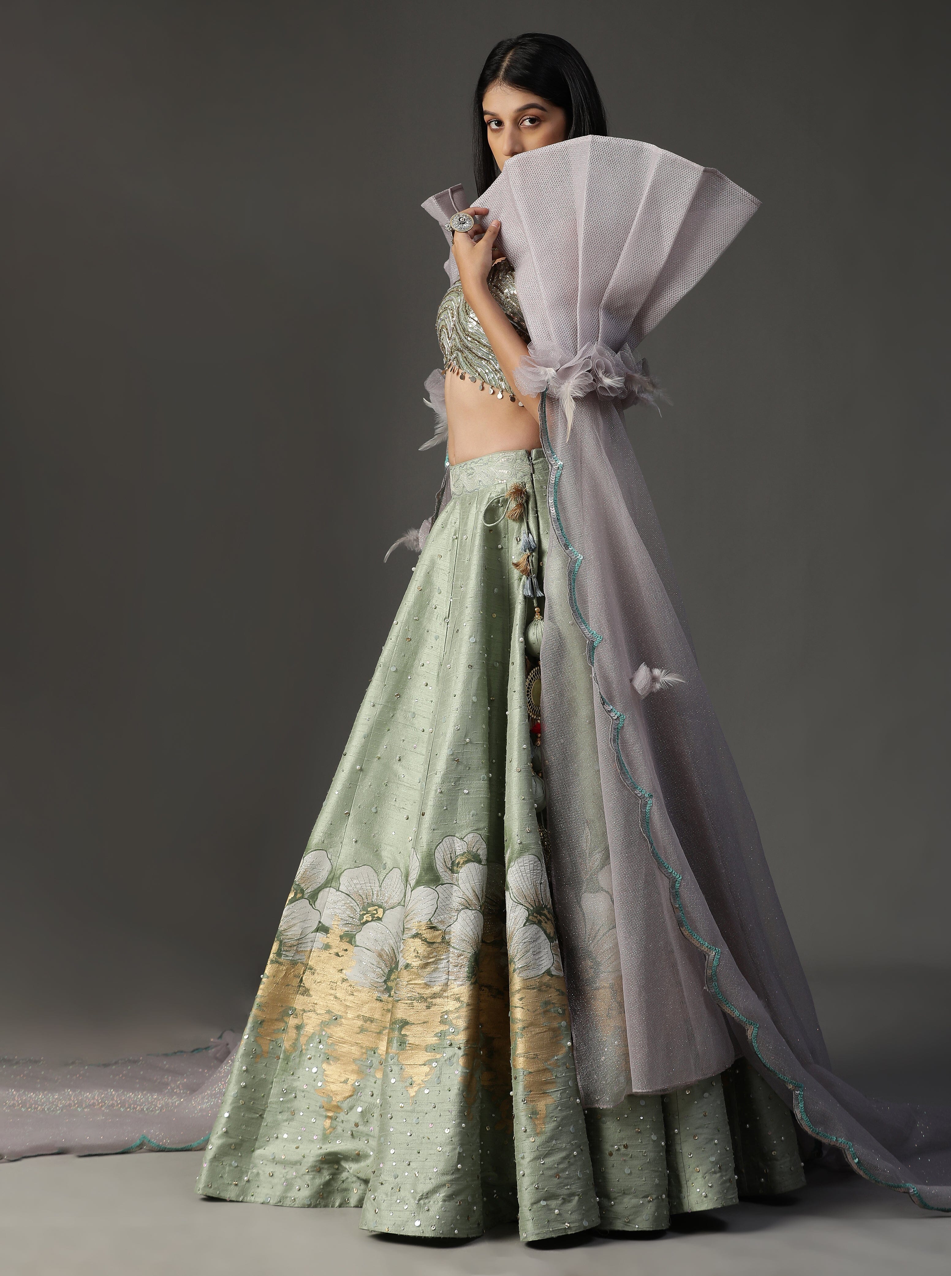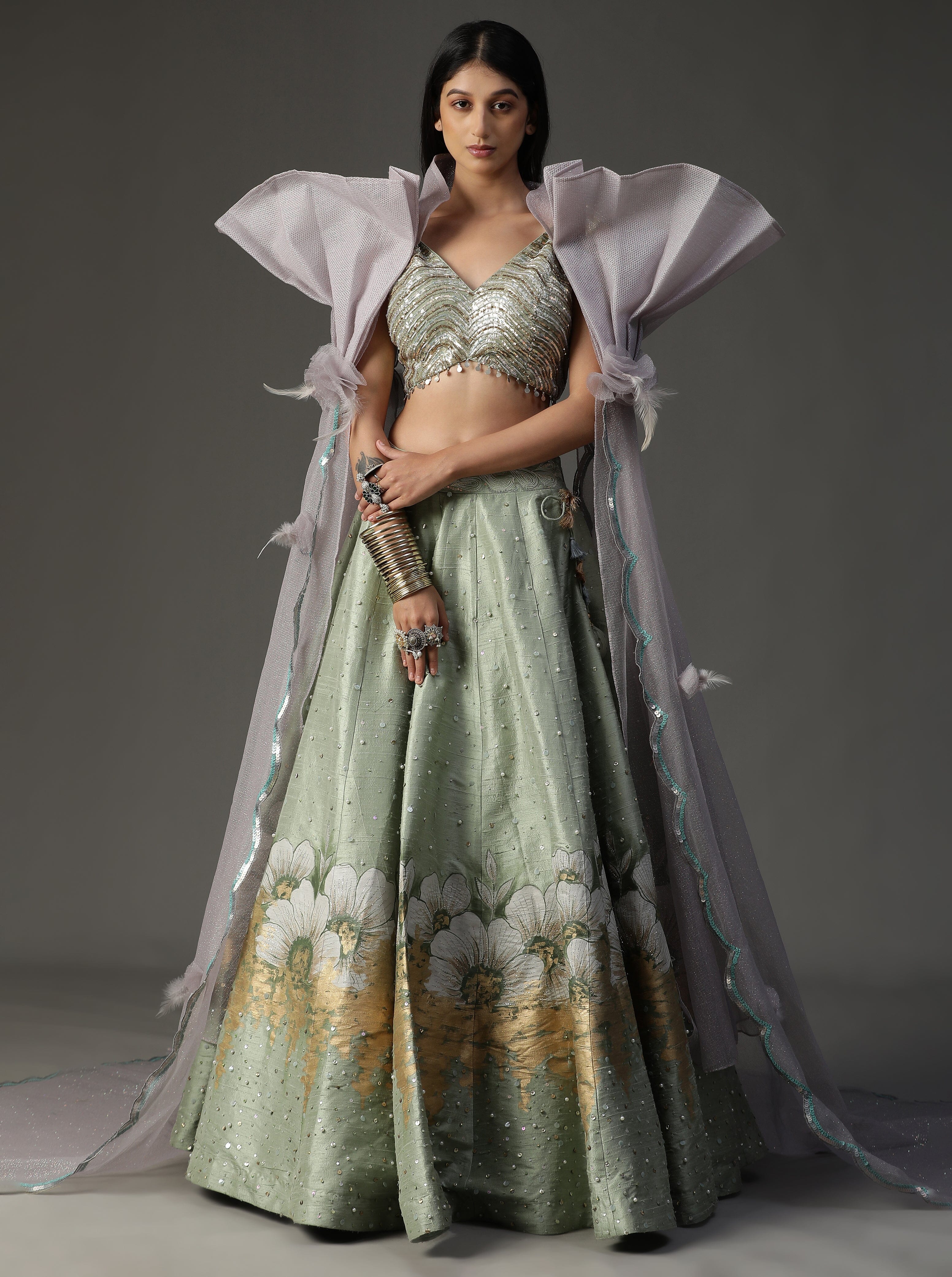Con lehnga pintada a mano en color verde mar. Viene con blusa de lentejuelas y espectacular conjunto de capa.