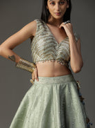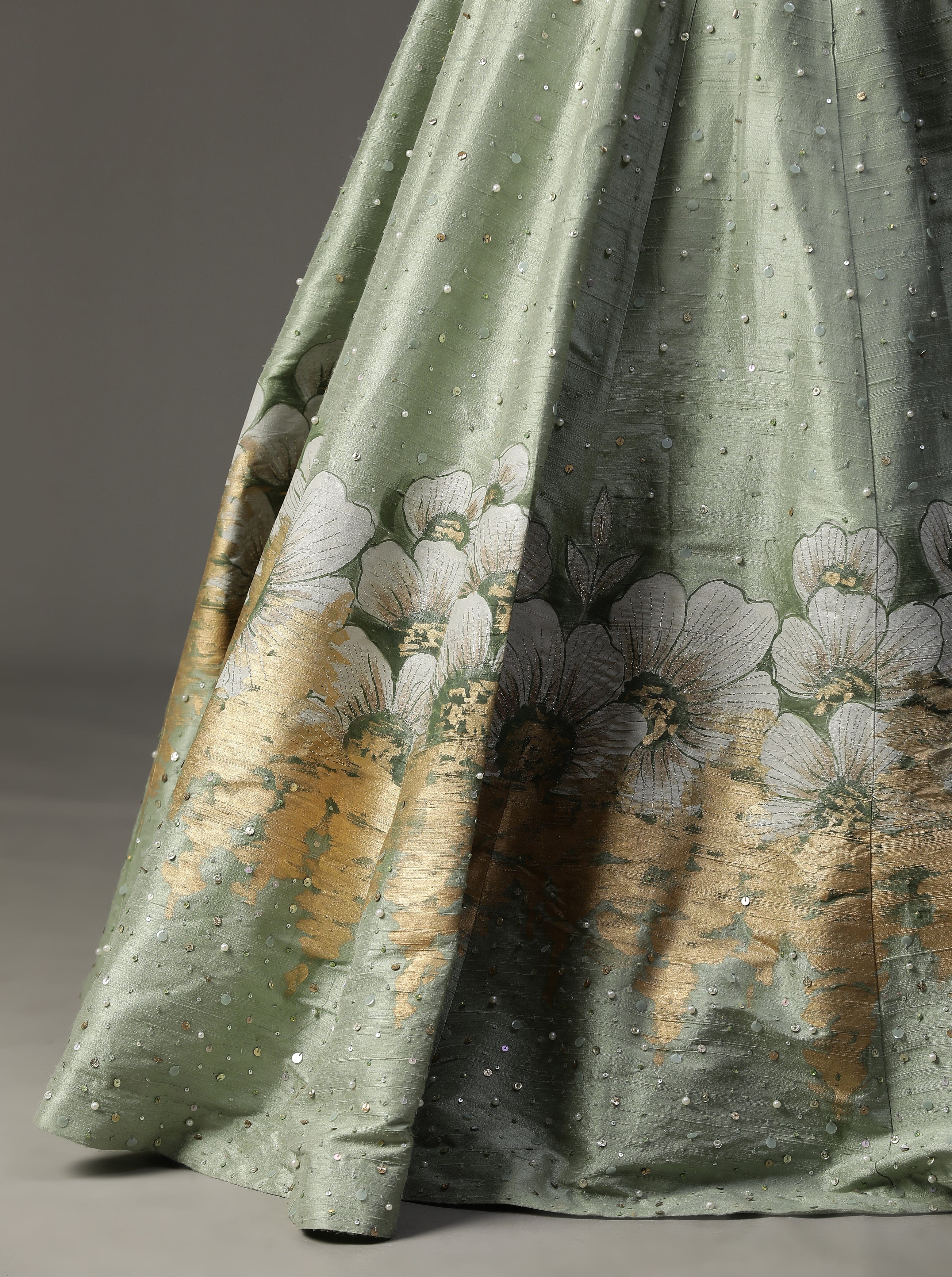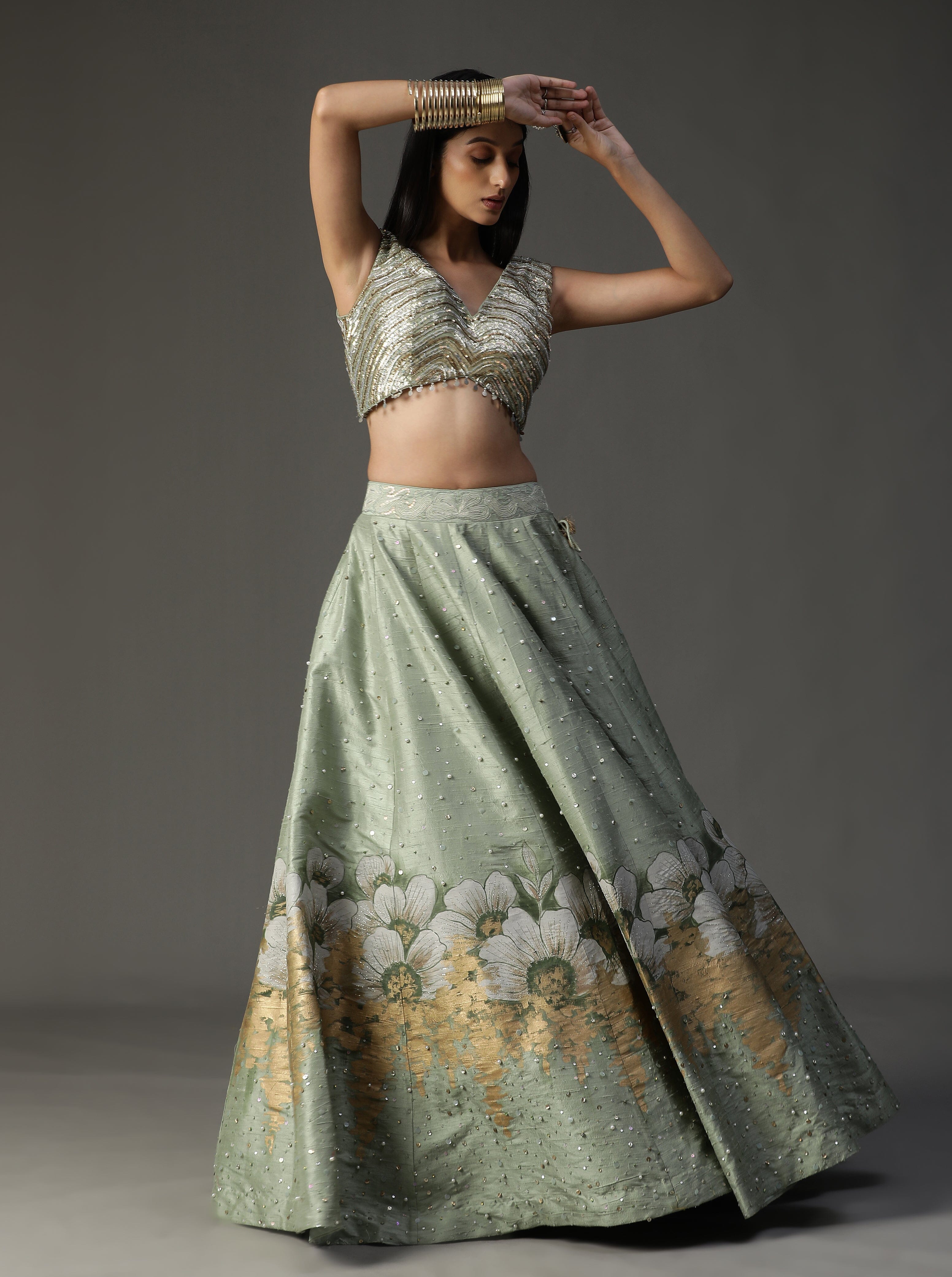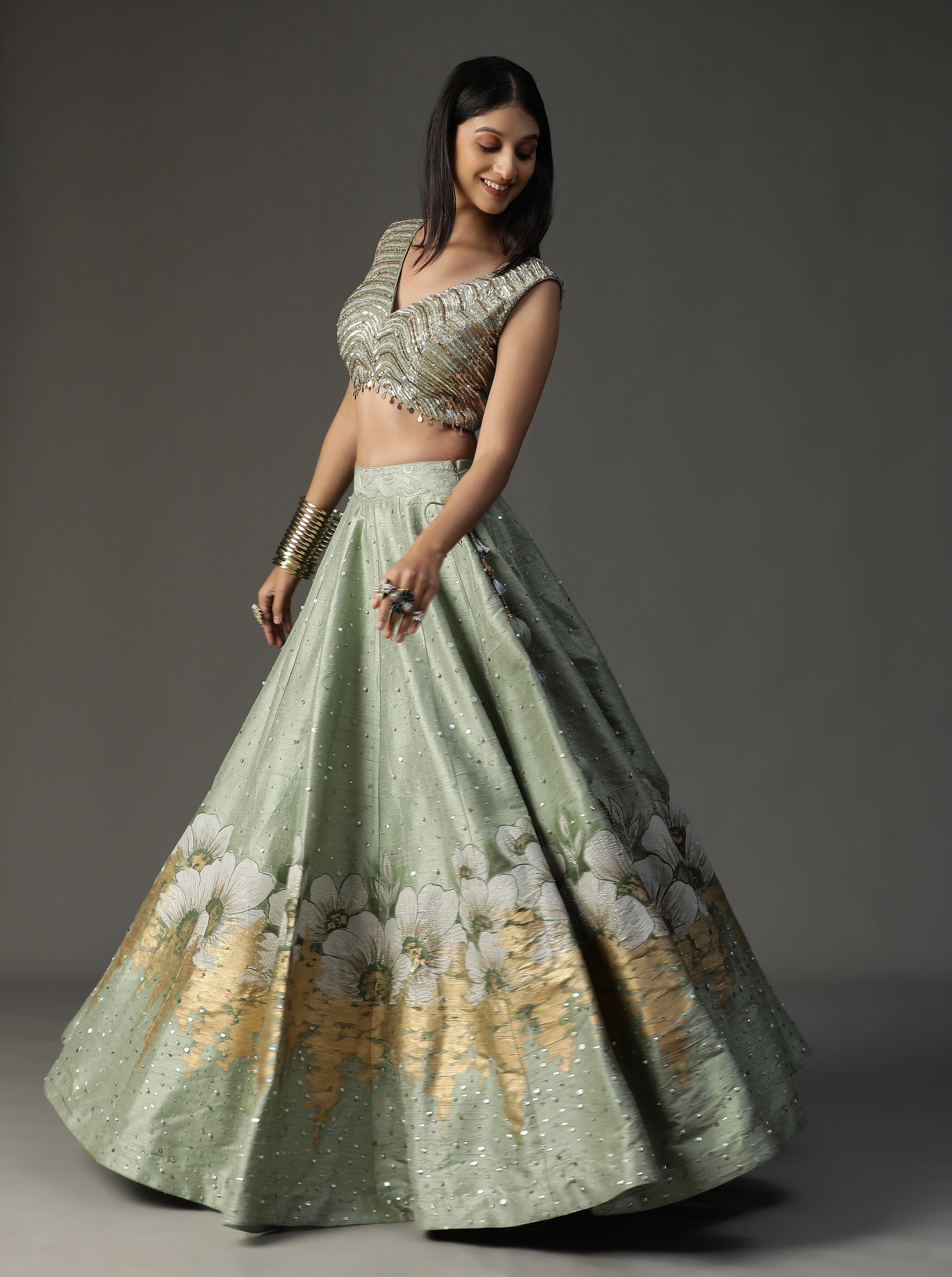 Con lehnga pintada a mano en color verde mar. Viene con blusa de lentejuelas y espectacular conjunto de capa.