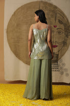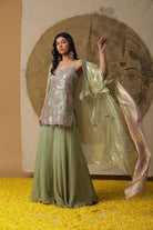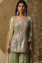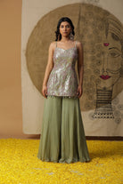 con conjunto palazzo verde pista con kurta corta. Viene con capa ombre en gorgette.