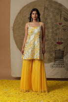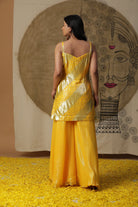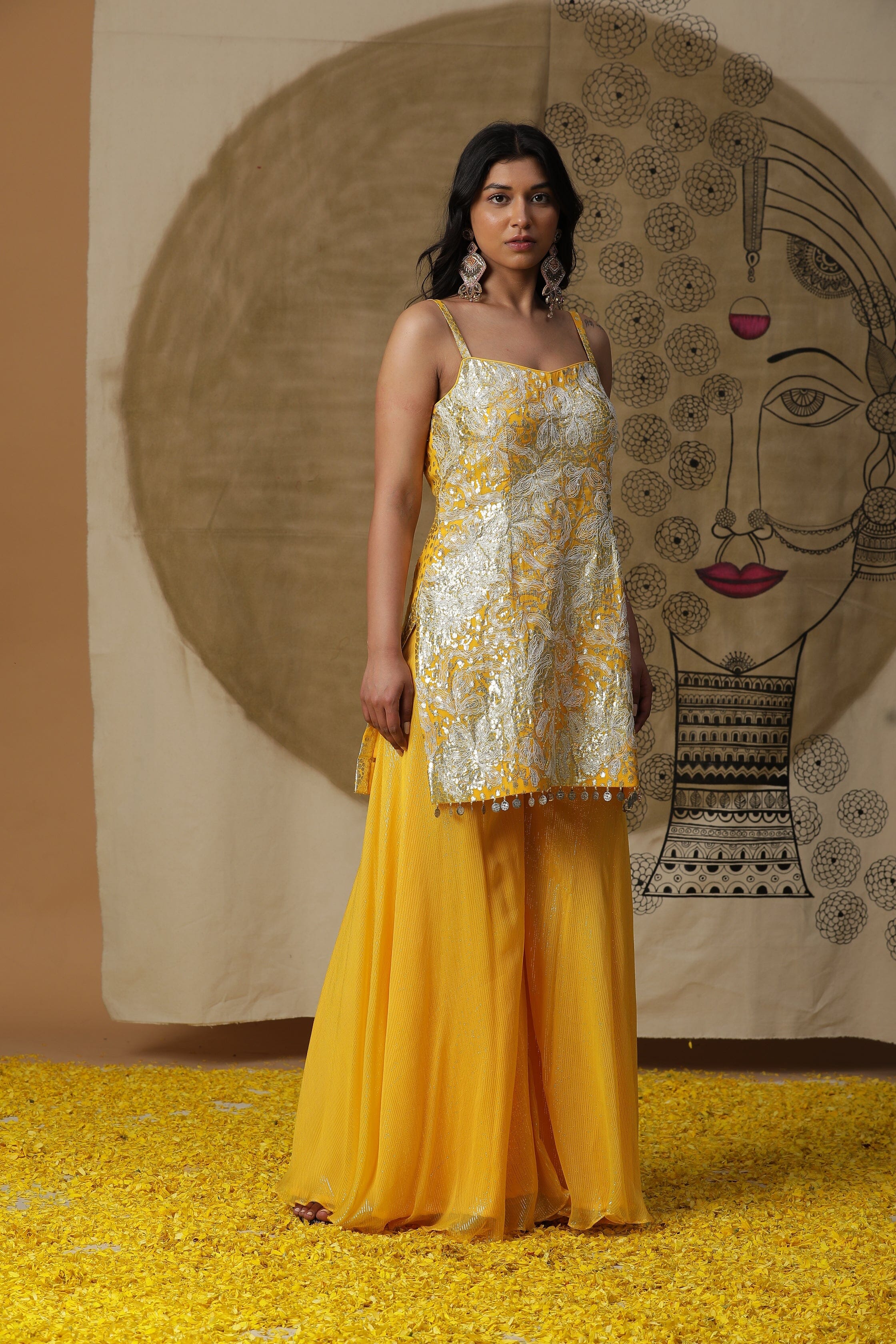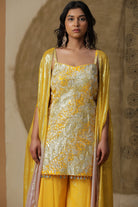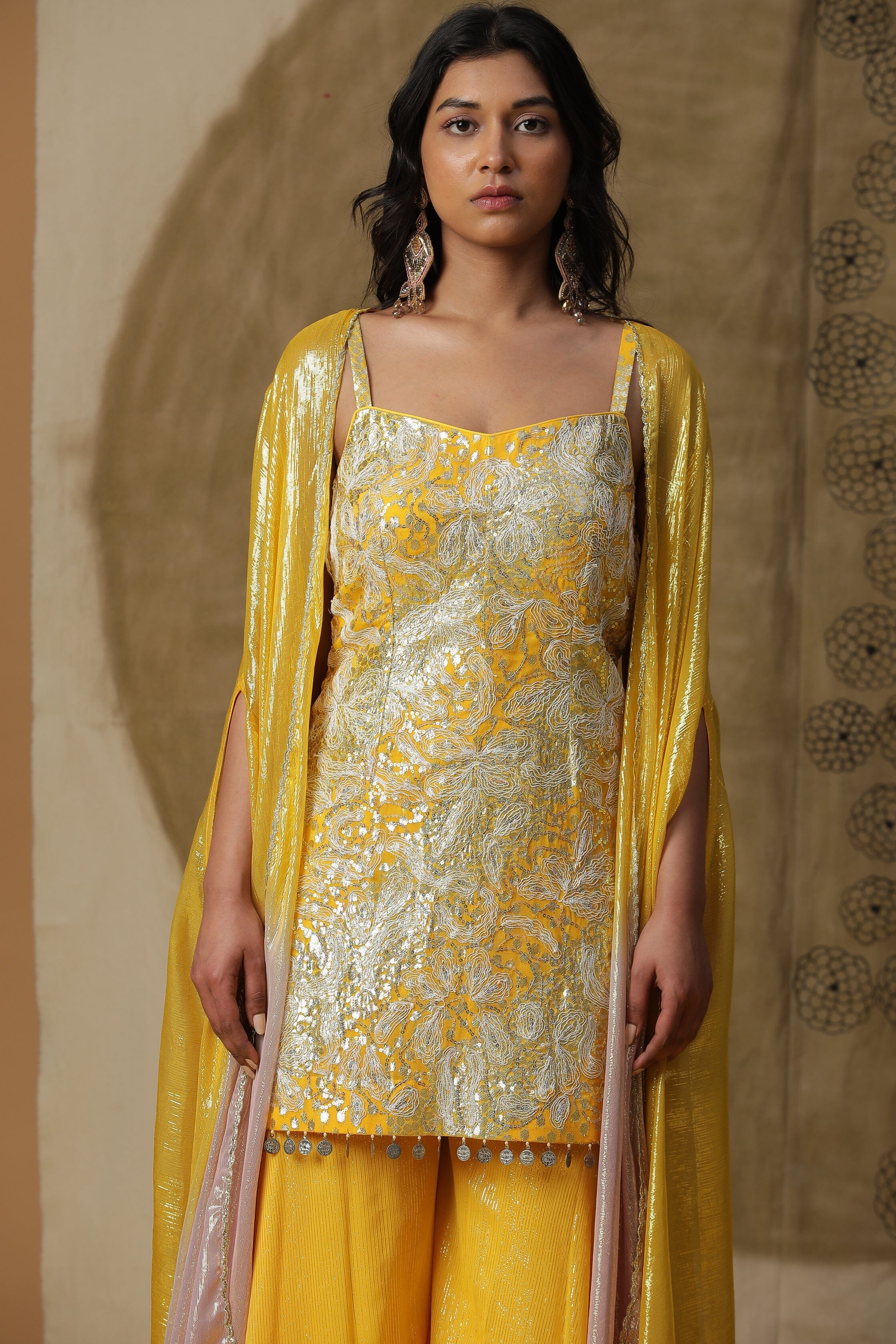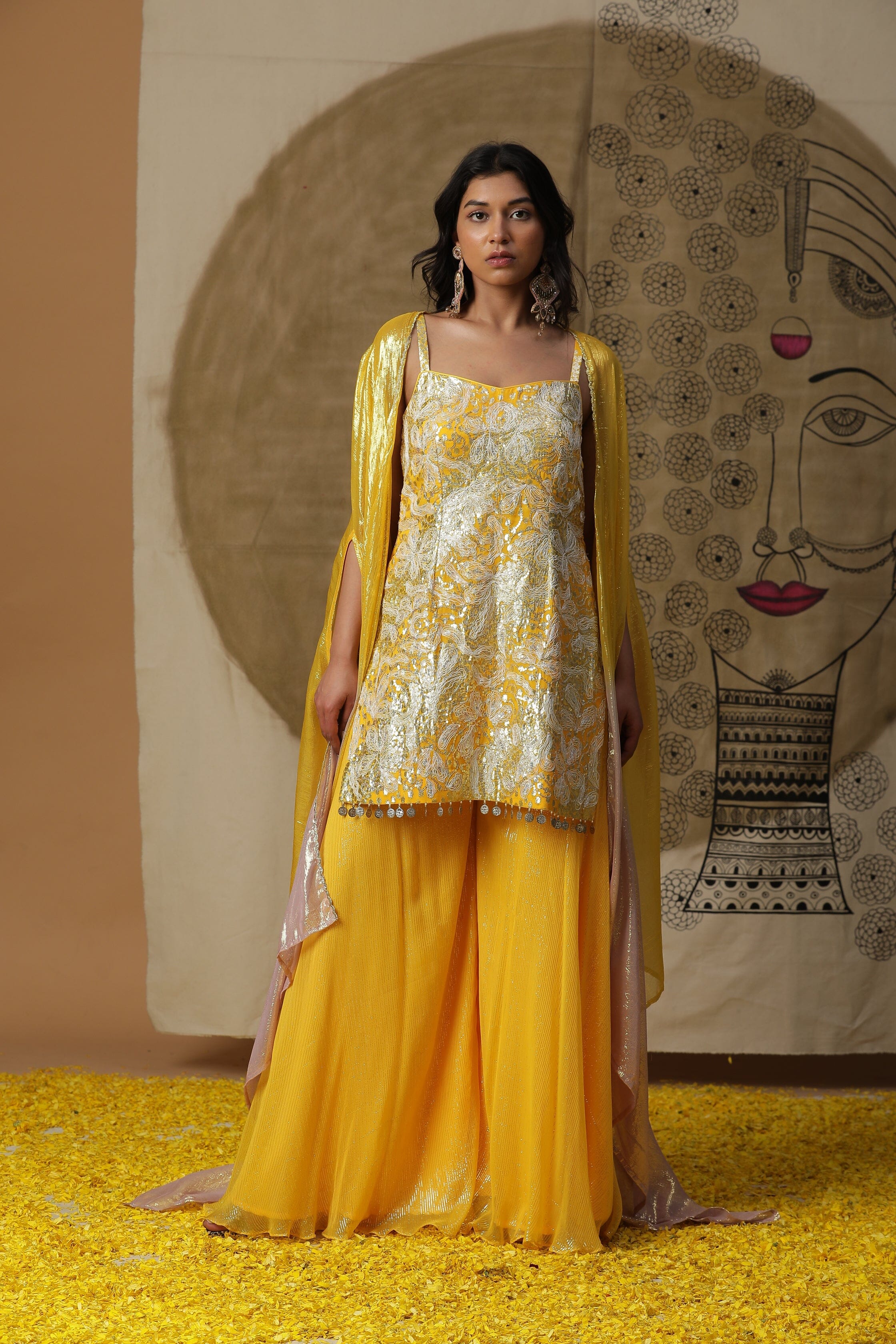Con conjunto de kurta corta con palazzo en color amarillo. La kurta está bordada en dori. Combínalo con nuestra capa sombría.