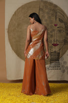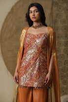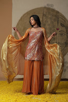 Con conjunto palazzo naranja con kurta corta. Kurta está bordada a mano con capa ombre.