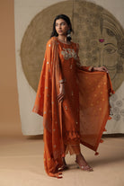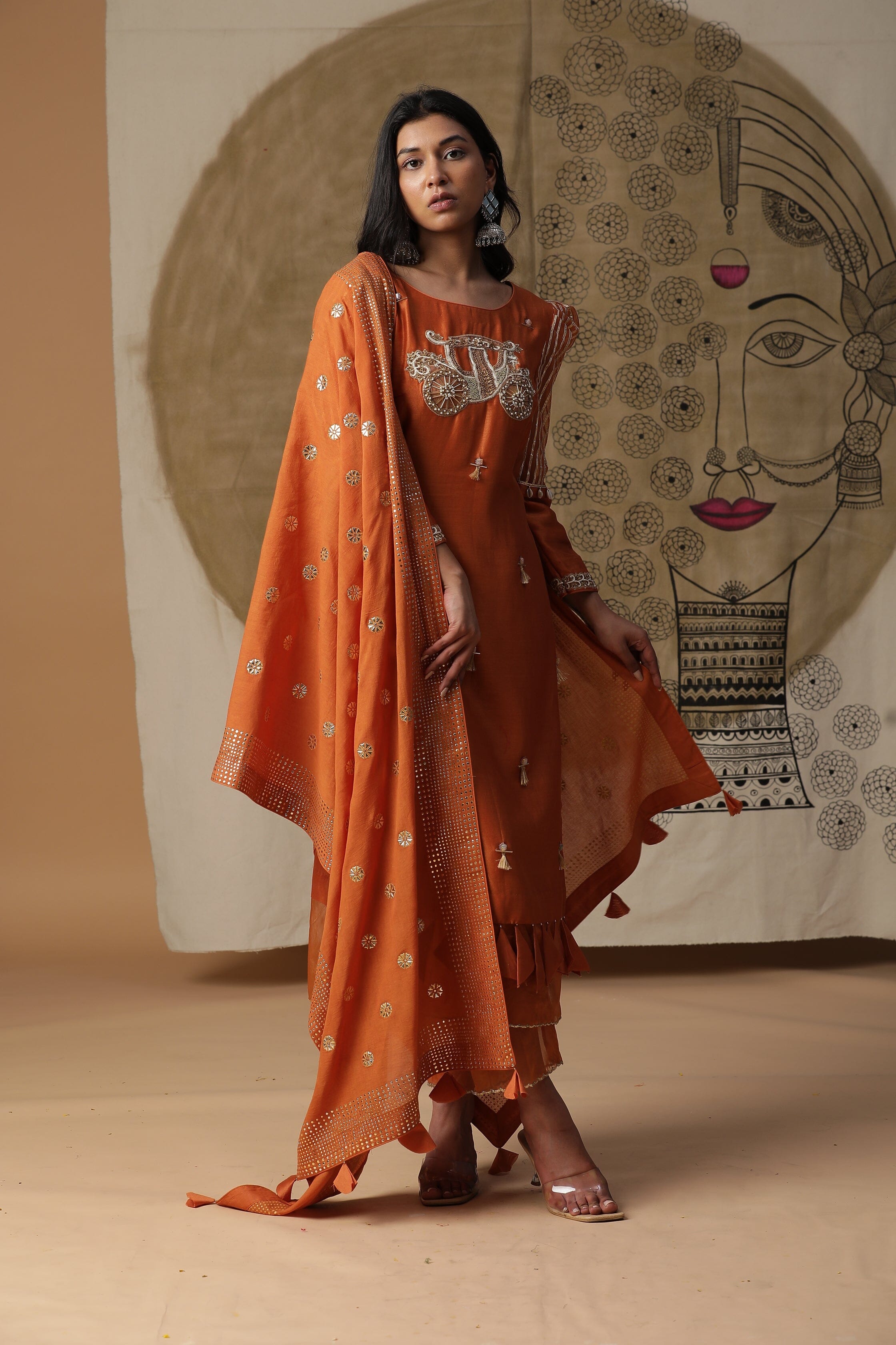 Presenta nuestro conjunto de traje baggi color albaricoque con mangas abullonadas y bordado a mano. Viene con pantalones hasta los tobillos y una dupatta.
