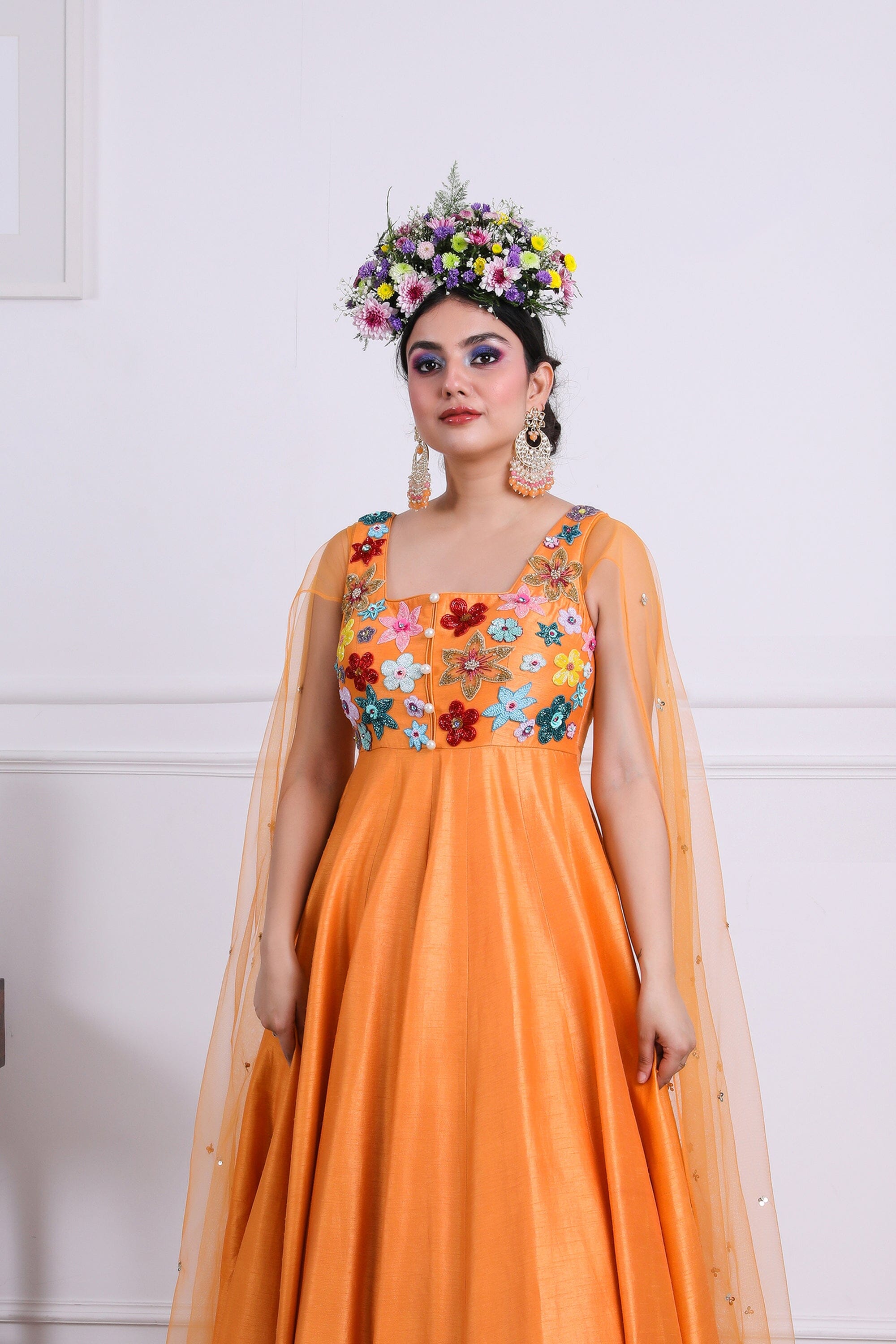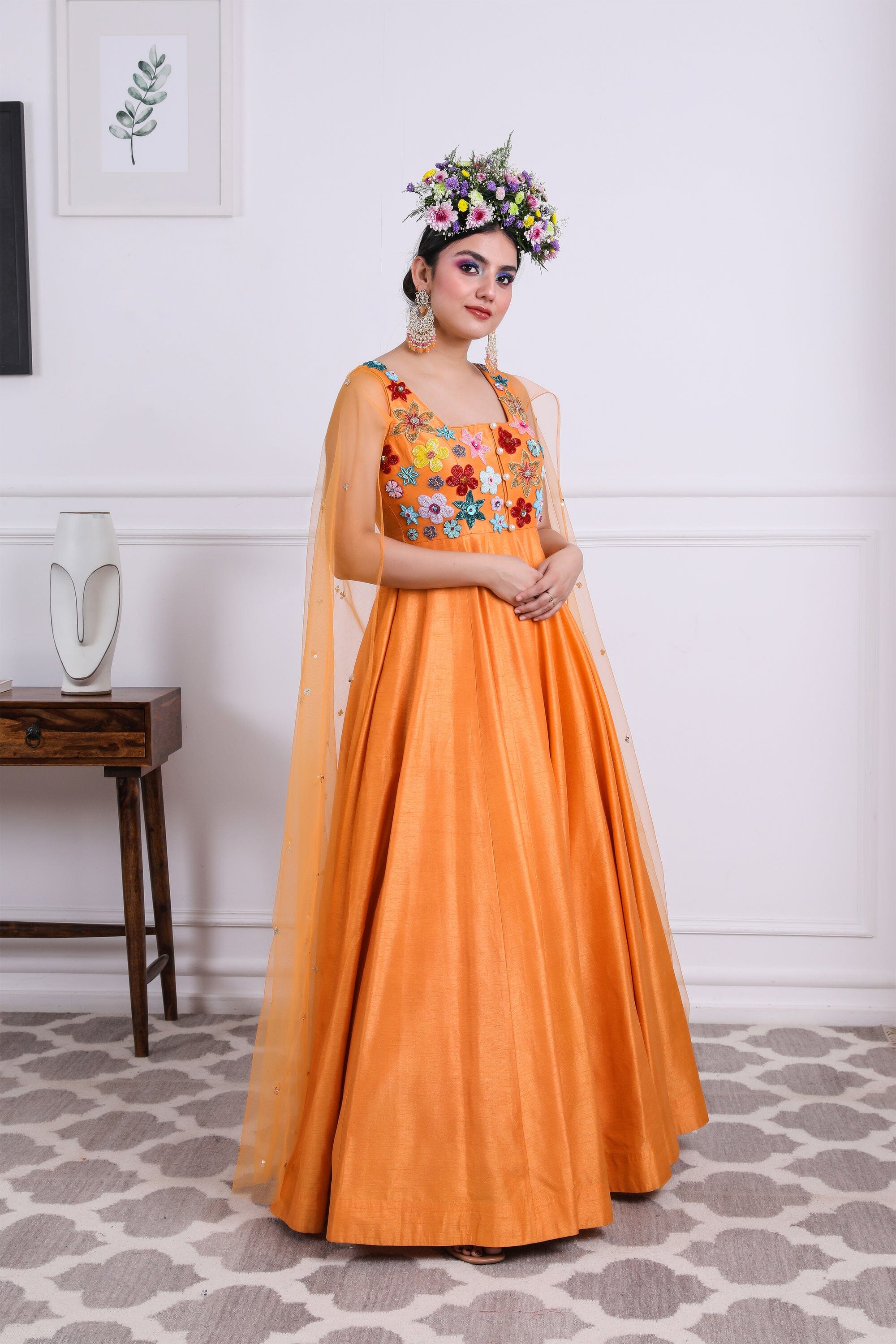 Extravagancia elegante que se manifiesta con nuestro anarkali de seda cruda color naranja atardecer con una capa de tul adjunta y un intrincado corpiño floral ajustado para que ese destello se destaque.
