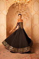 Lehnga de tul lila con volantes y blusa floral tonal adornada en 3D, completa con duppatta estilo gargantilla y colgantes.