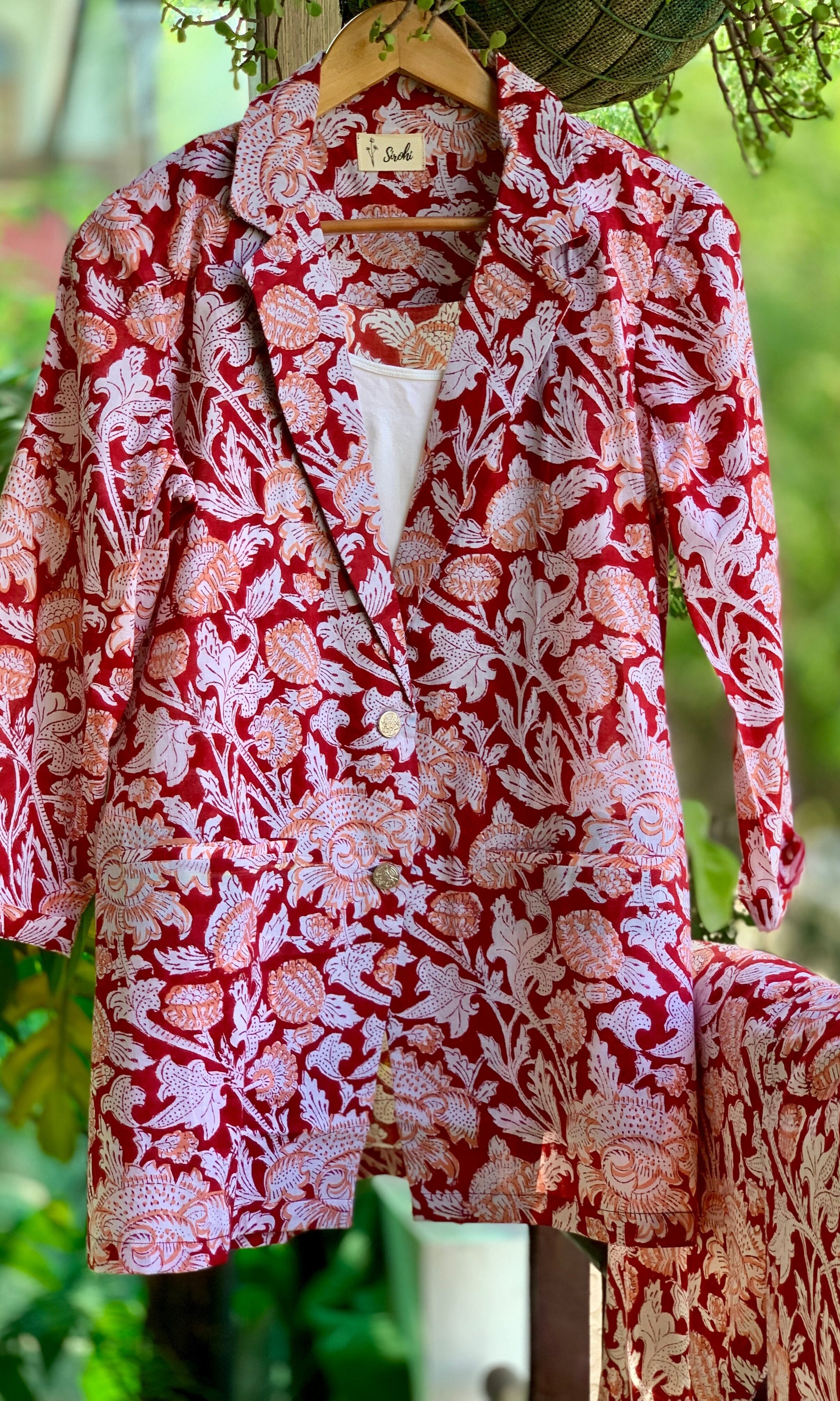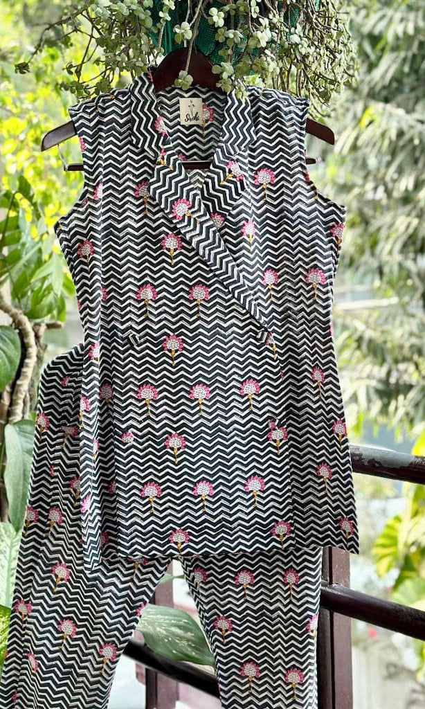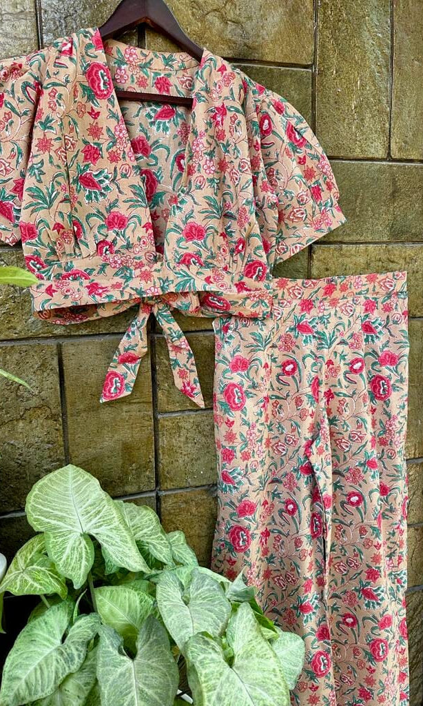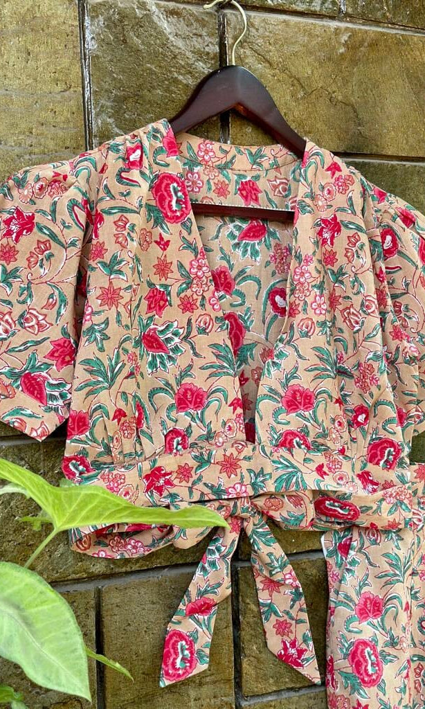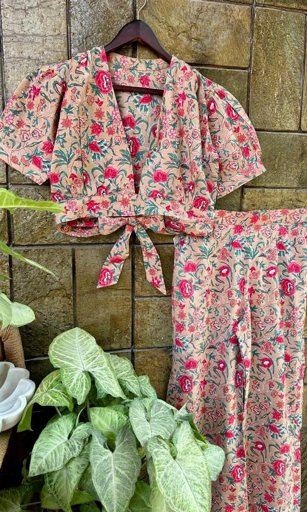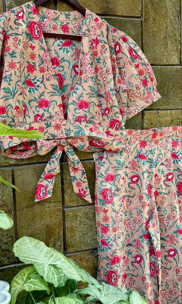 Algodón cultivado orgánicamente: estampado en bloques a mano e incluye una gama versátil de kimonos, batas, conjuntos deportivos, pantalones tipo blazer, trajes, caftanes, vestidos, conjuntos de ropa de descanso y mucho más. El diseñador cree en ser terroso, orgánico y fiel a nuestra estética india, que refleja en cada uno de nuestros productos que son ambientalmente sostenibles, la verdadera necesidad del momento.