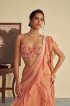 This draped organza saree with beautiful ruffles on the pallu. The bustier is meticulously embroidered pearl and aari work on it.